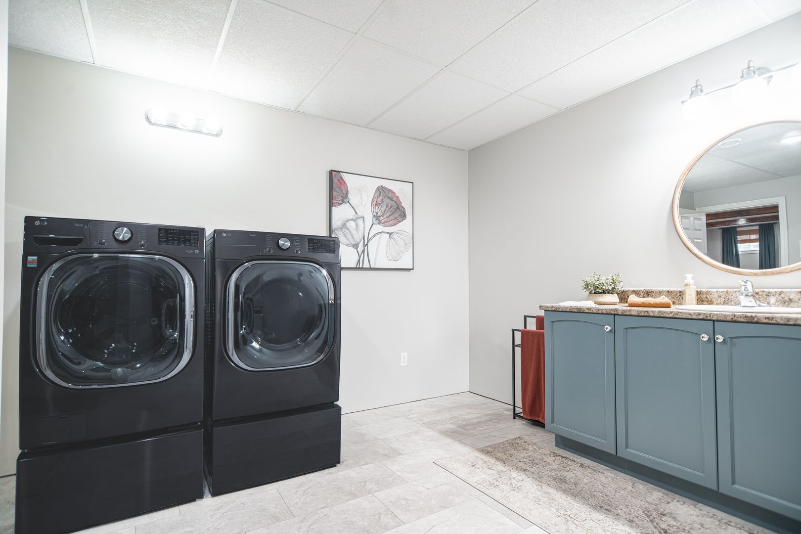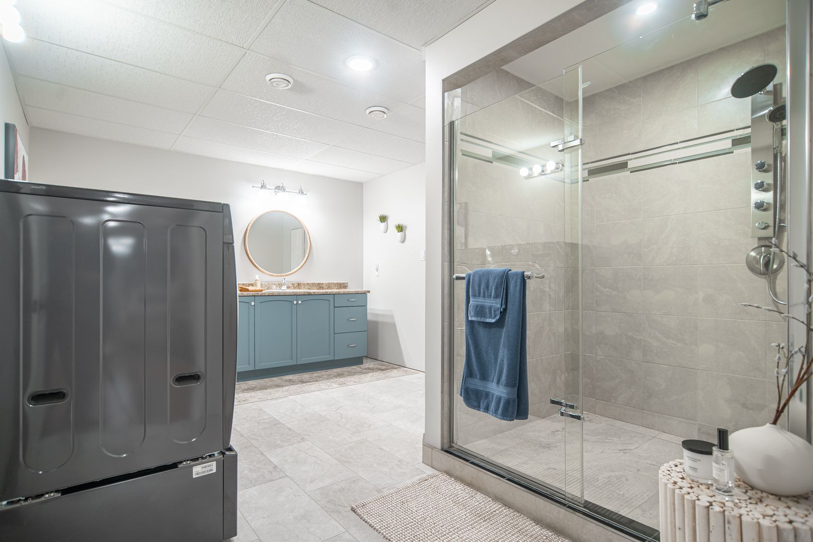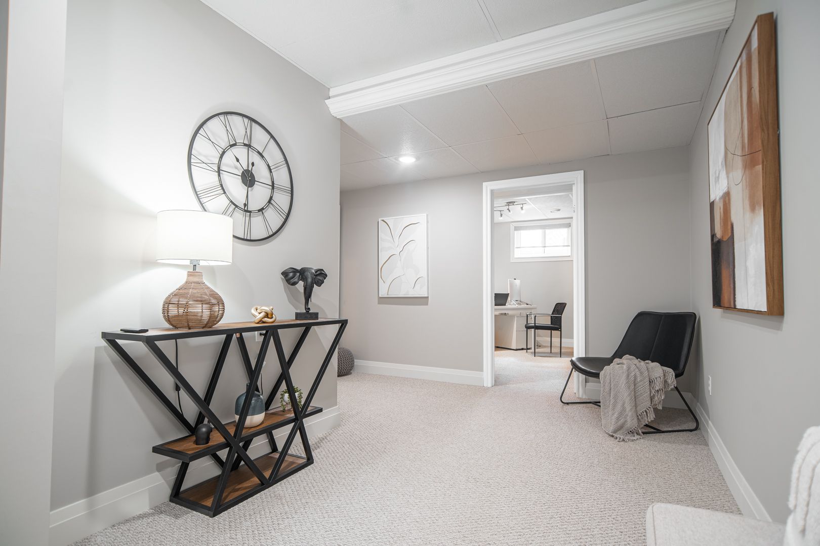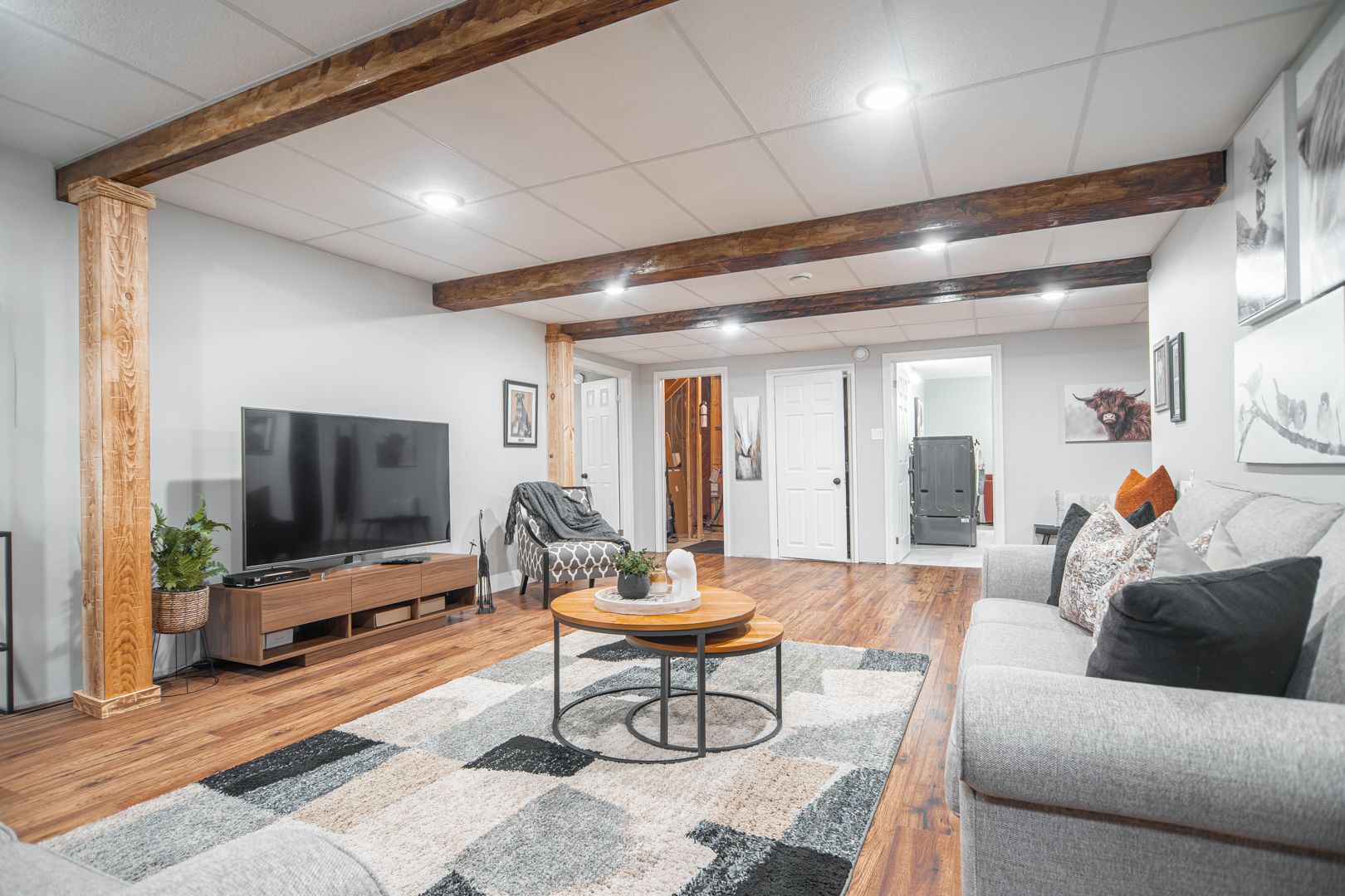 • Finished lower level offers versatile living spaces, including a theater room.