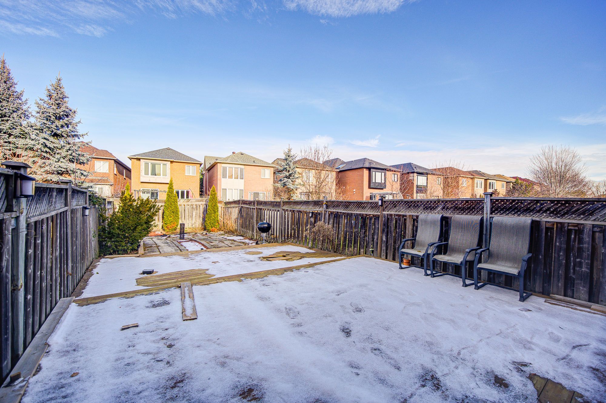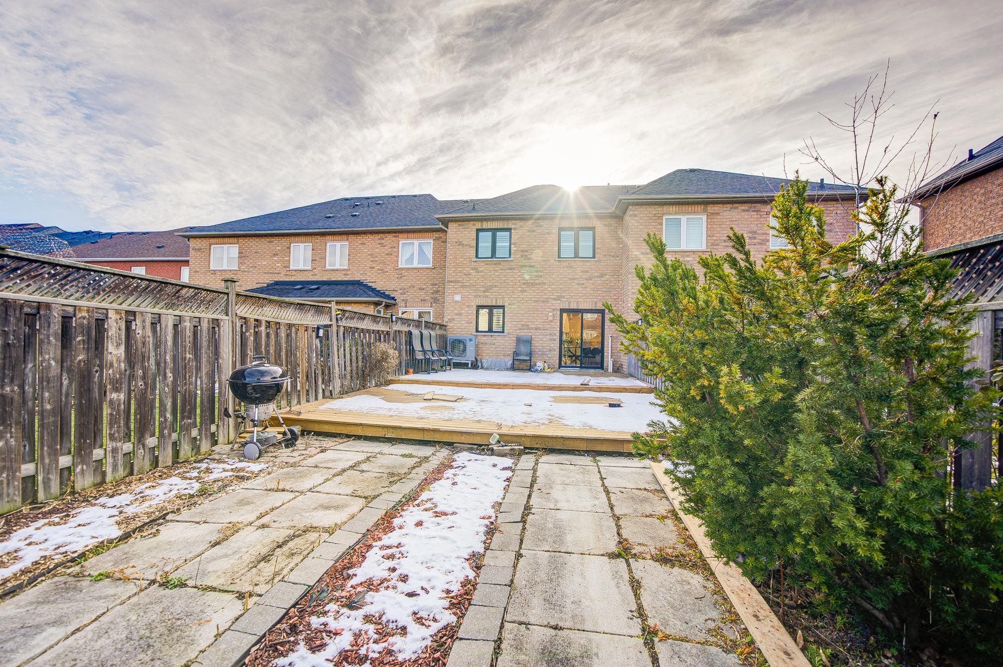 • Deep backyard featuring a large tiered deck and gas BBQ.