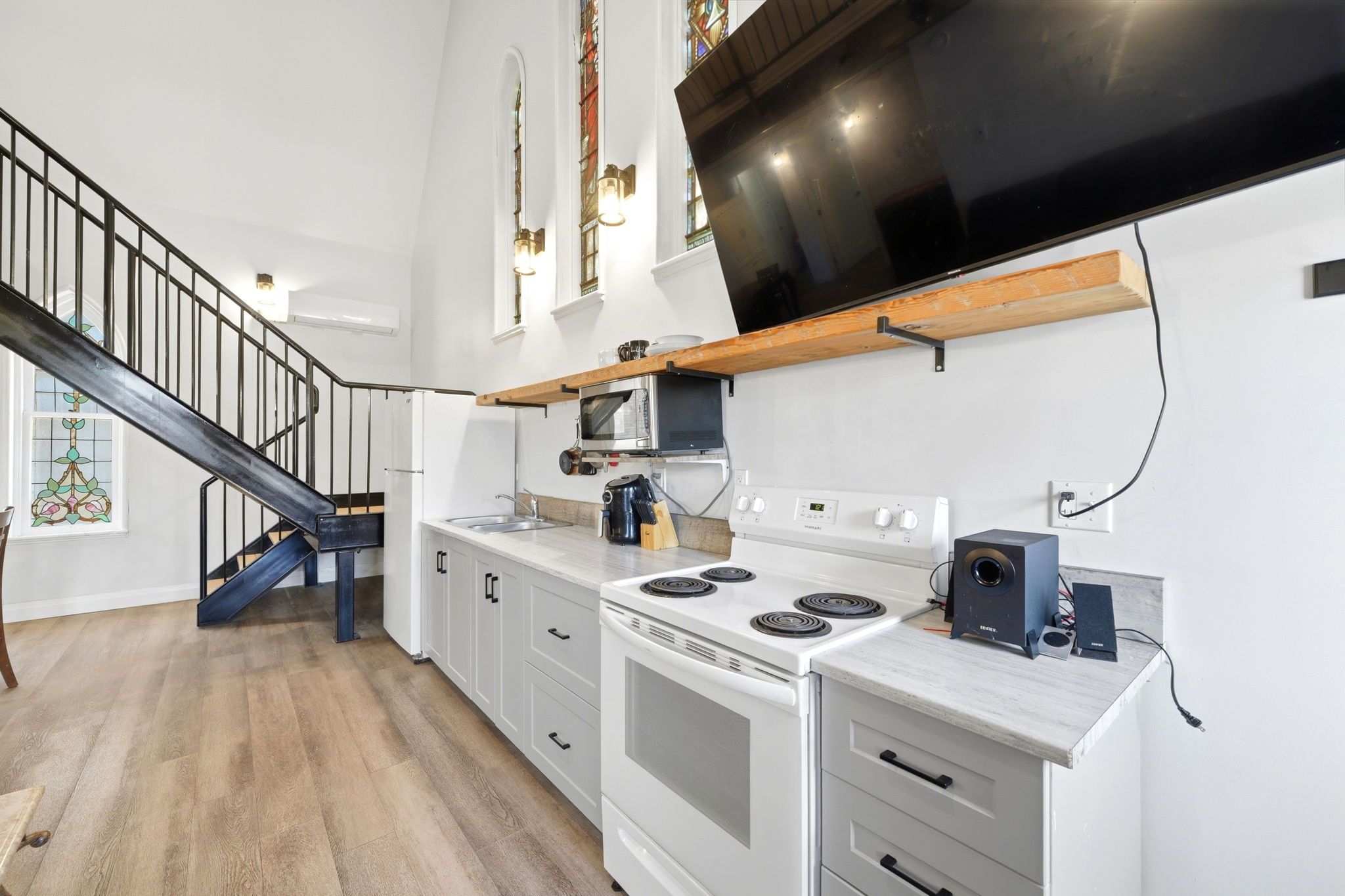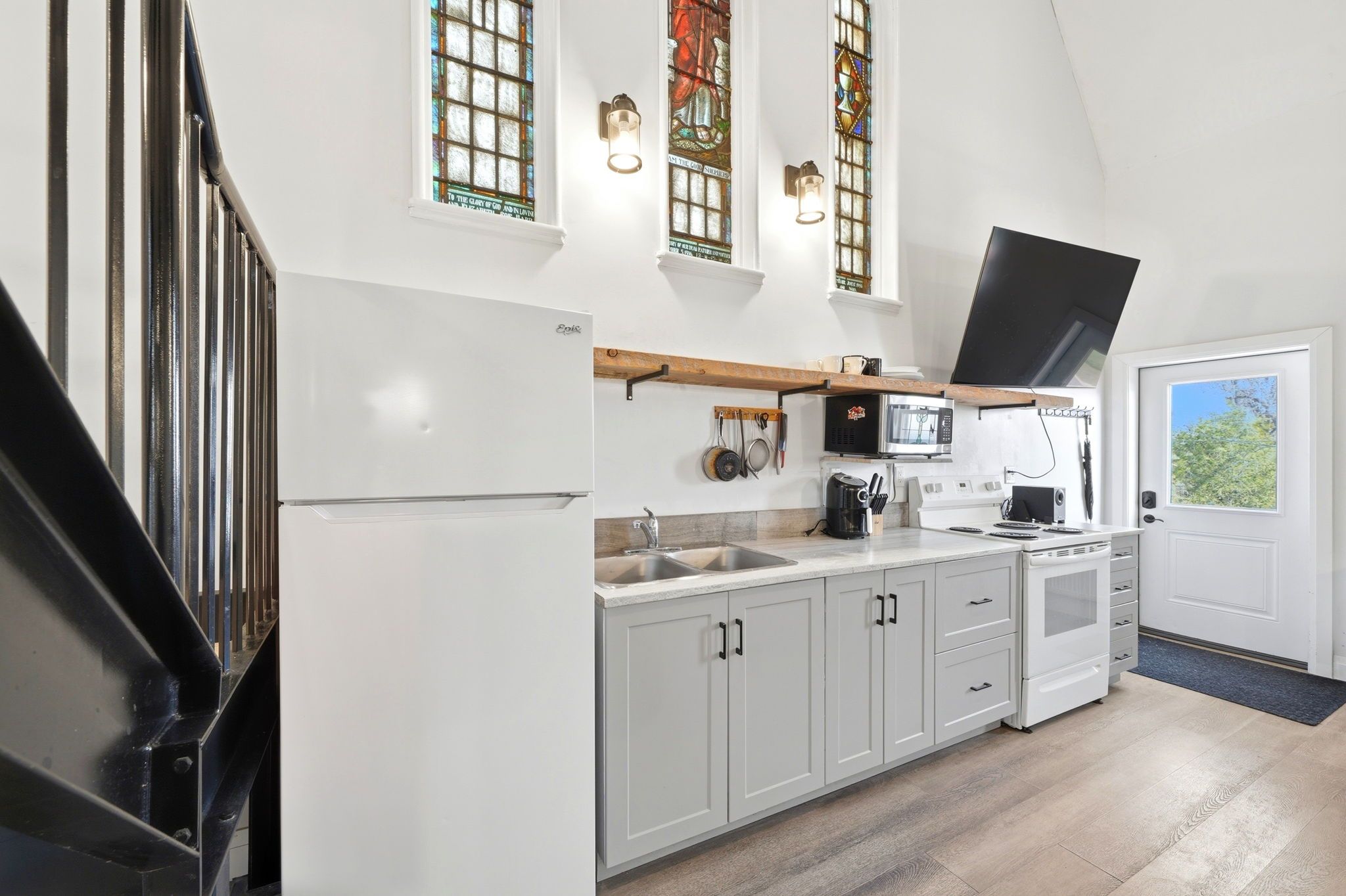 • Soaring cathedral ceilings and original stained glass windows enhance living spaces.