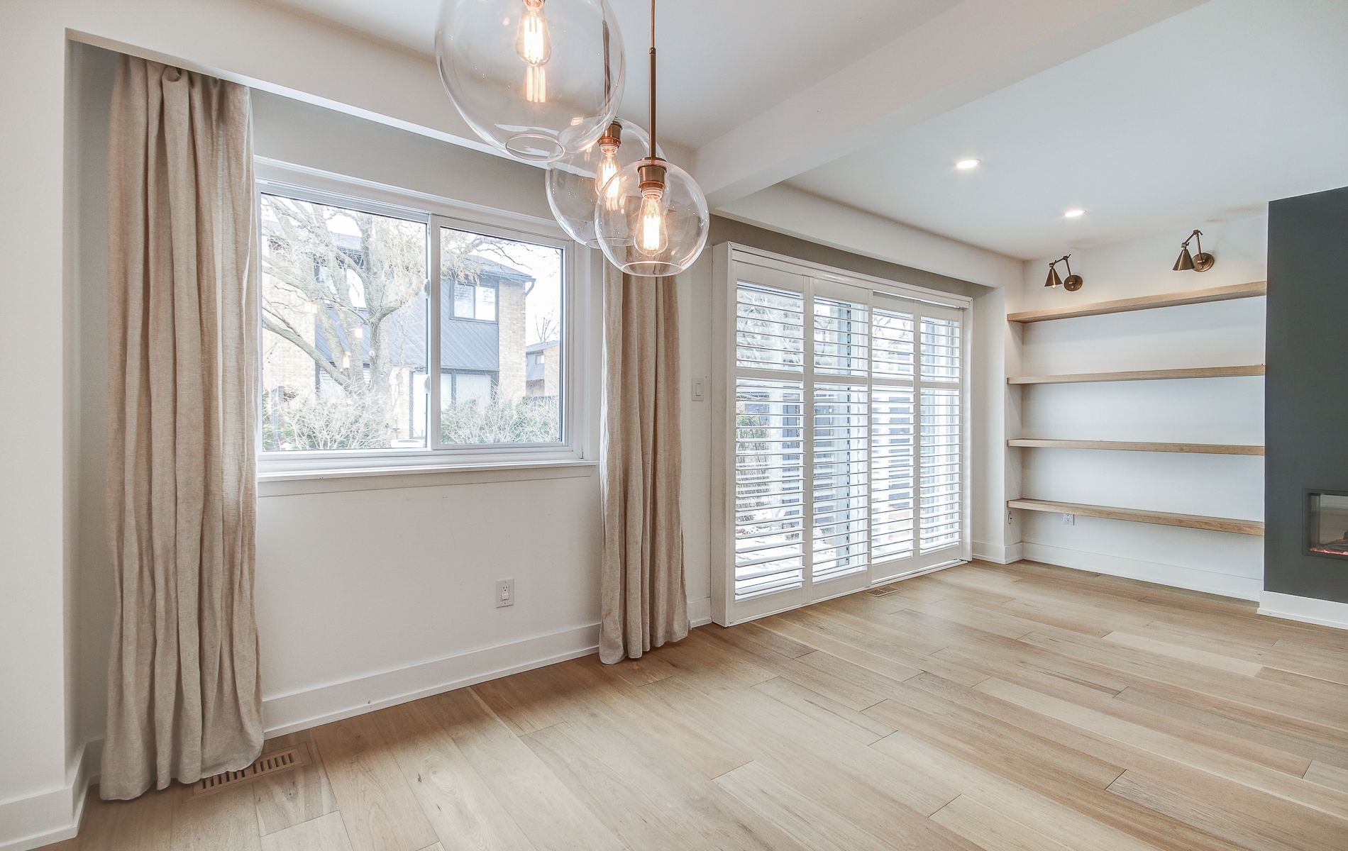 • Open-concept dining and family room filled with natural light and electric fireplace.