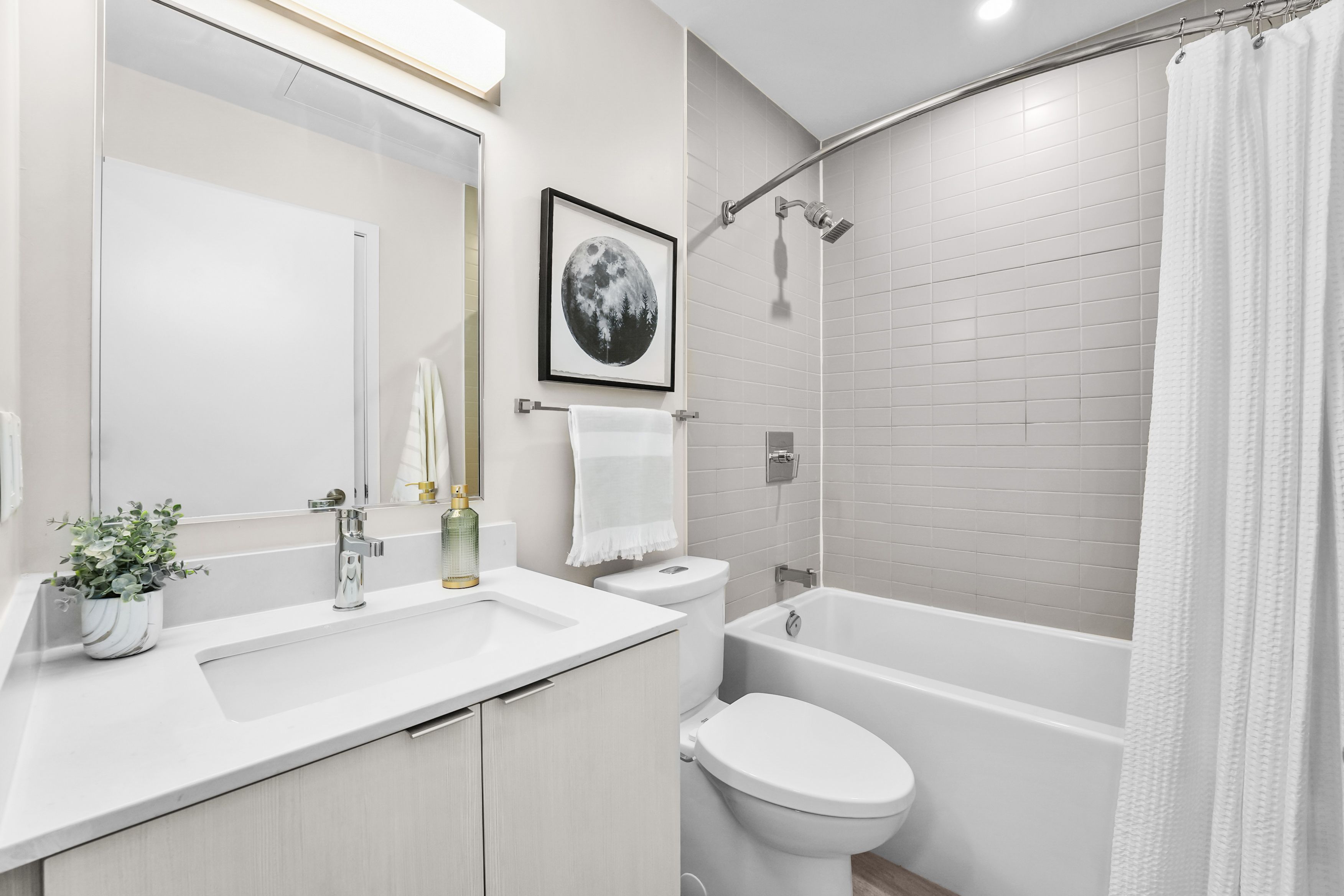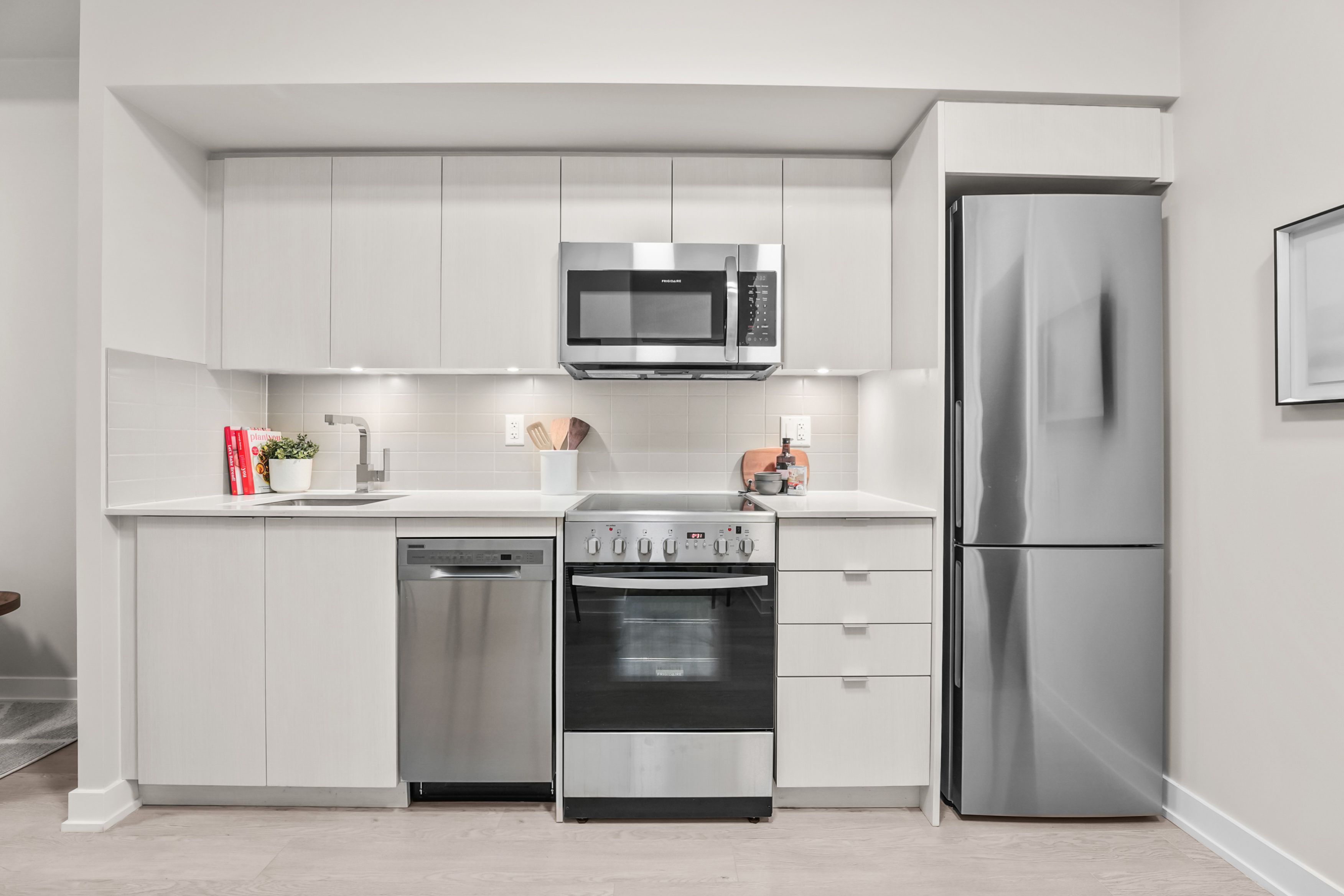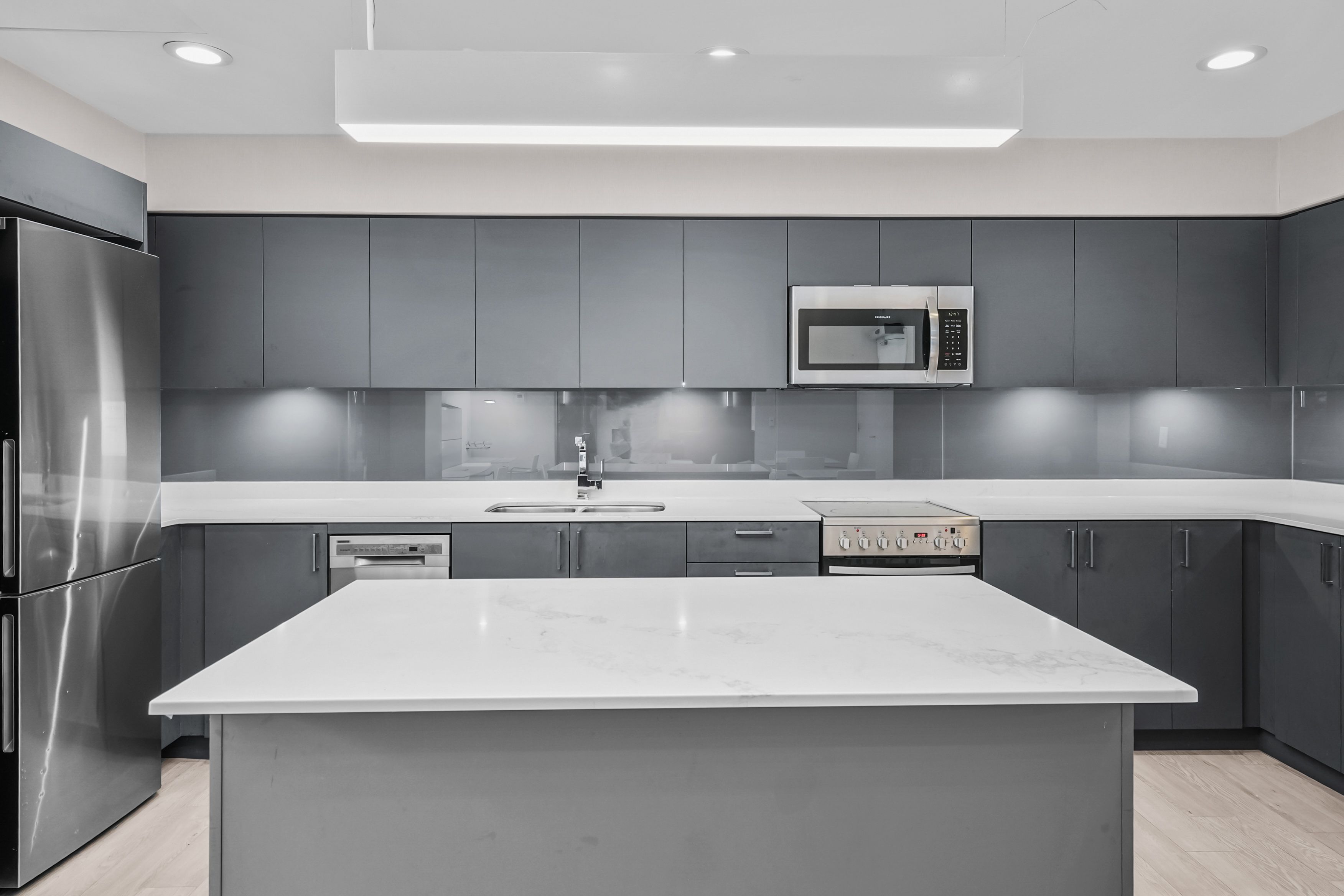 • Modern kitchen features stainless steel appliances and quartz countertops.