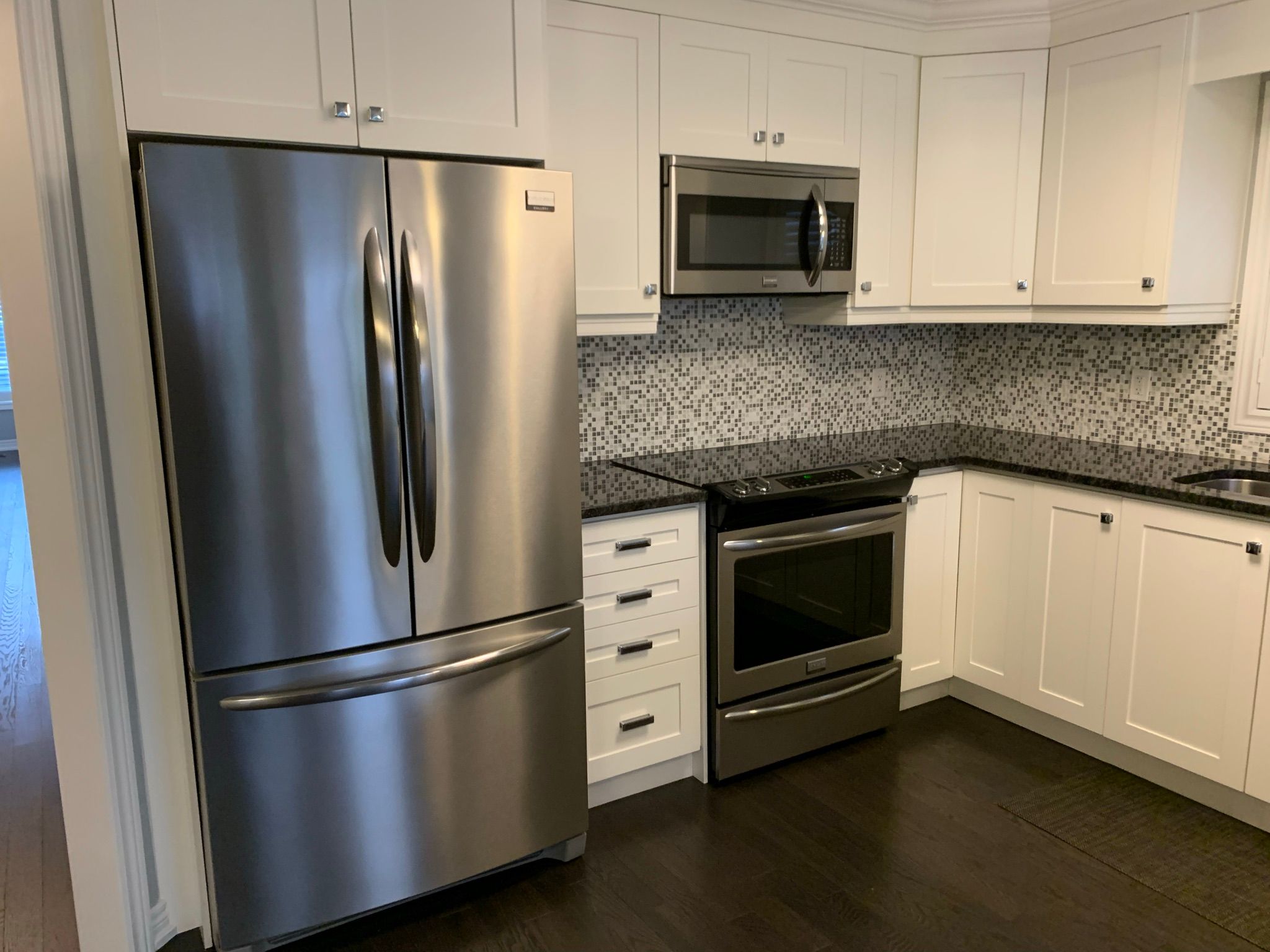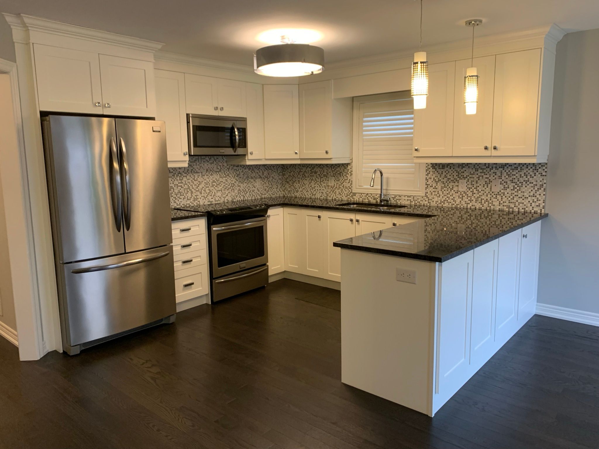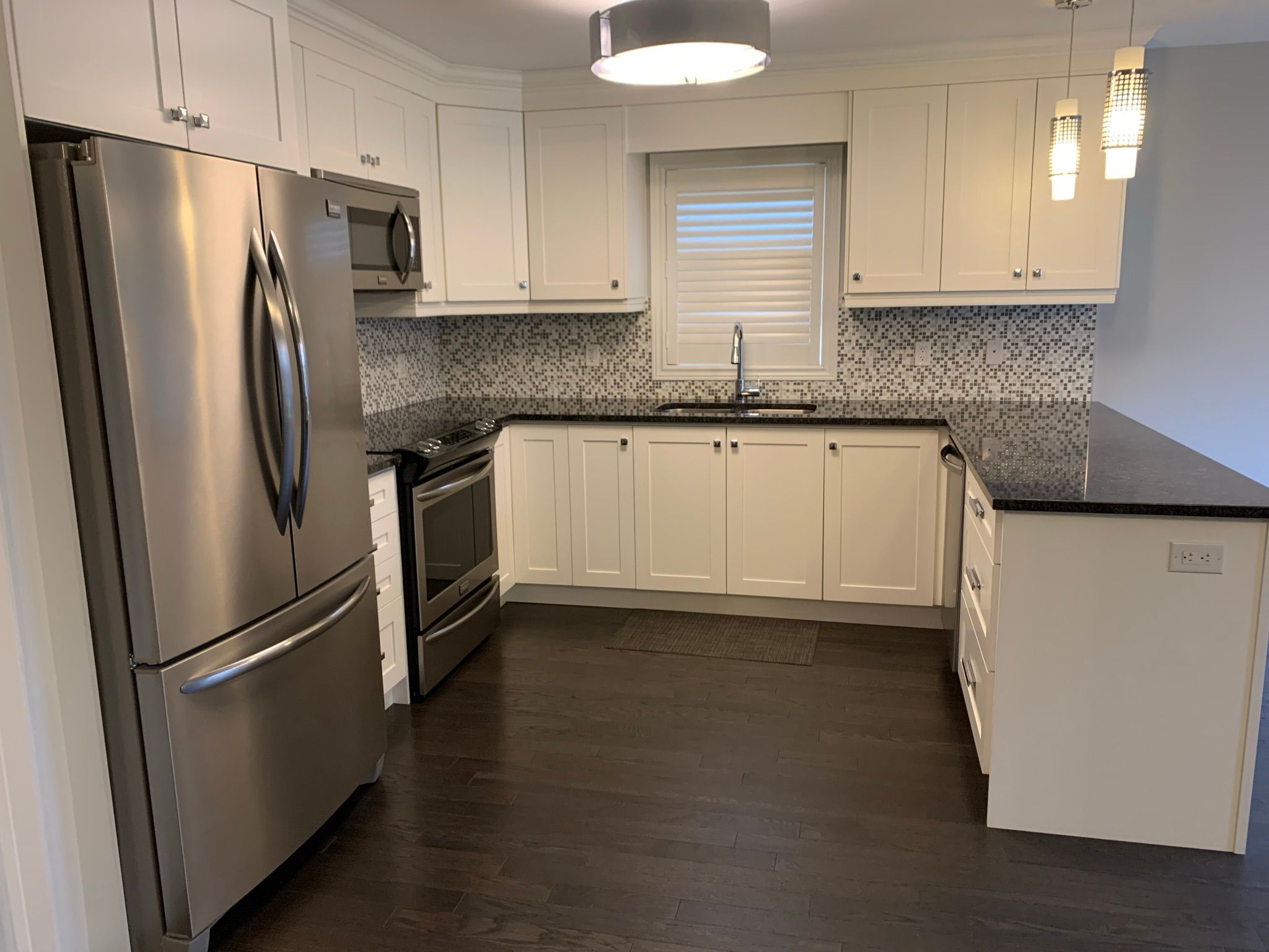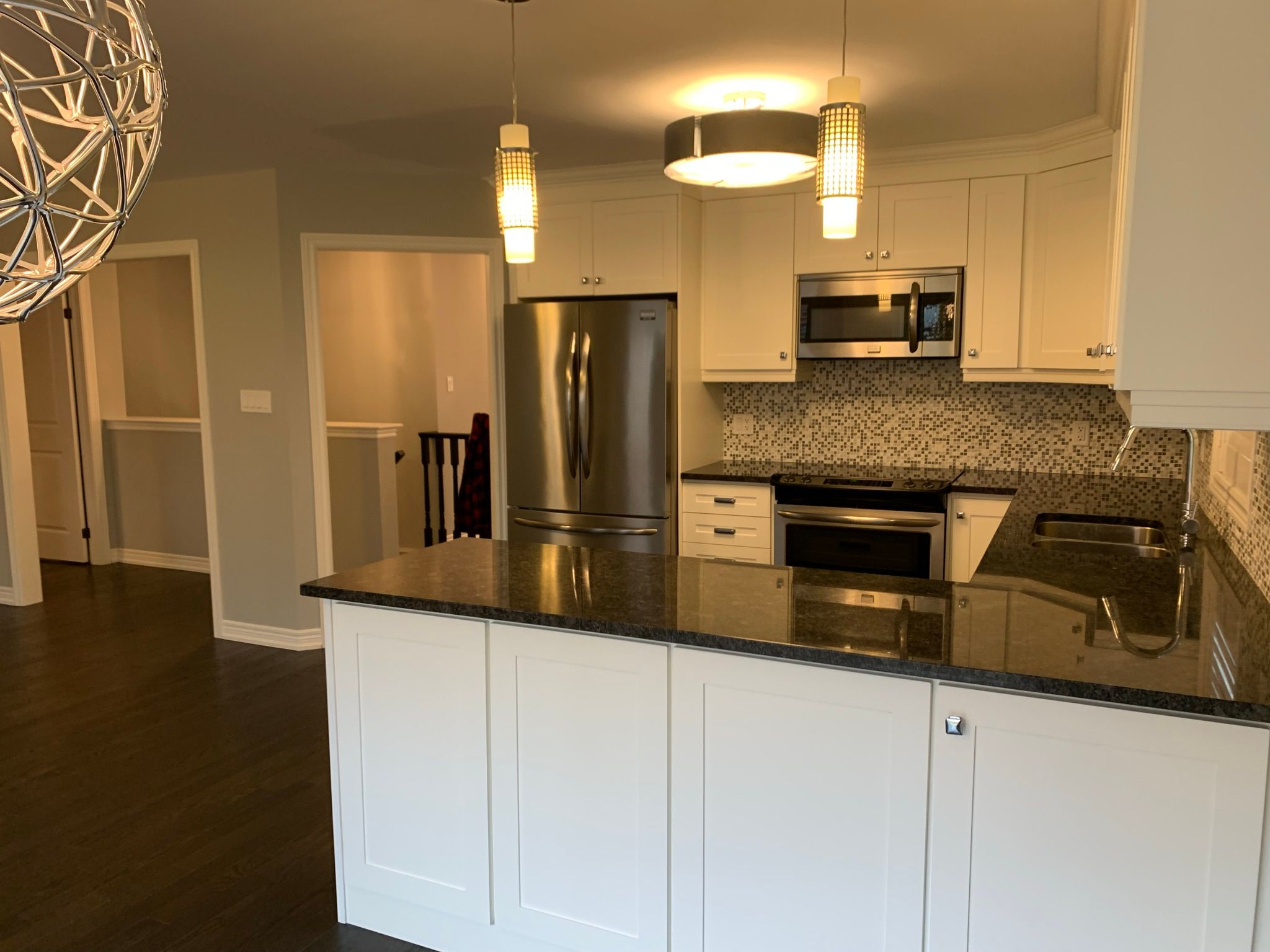 • Open concept kitchen features modern quartz countertops and stainless appliances.