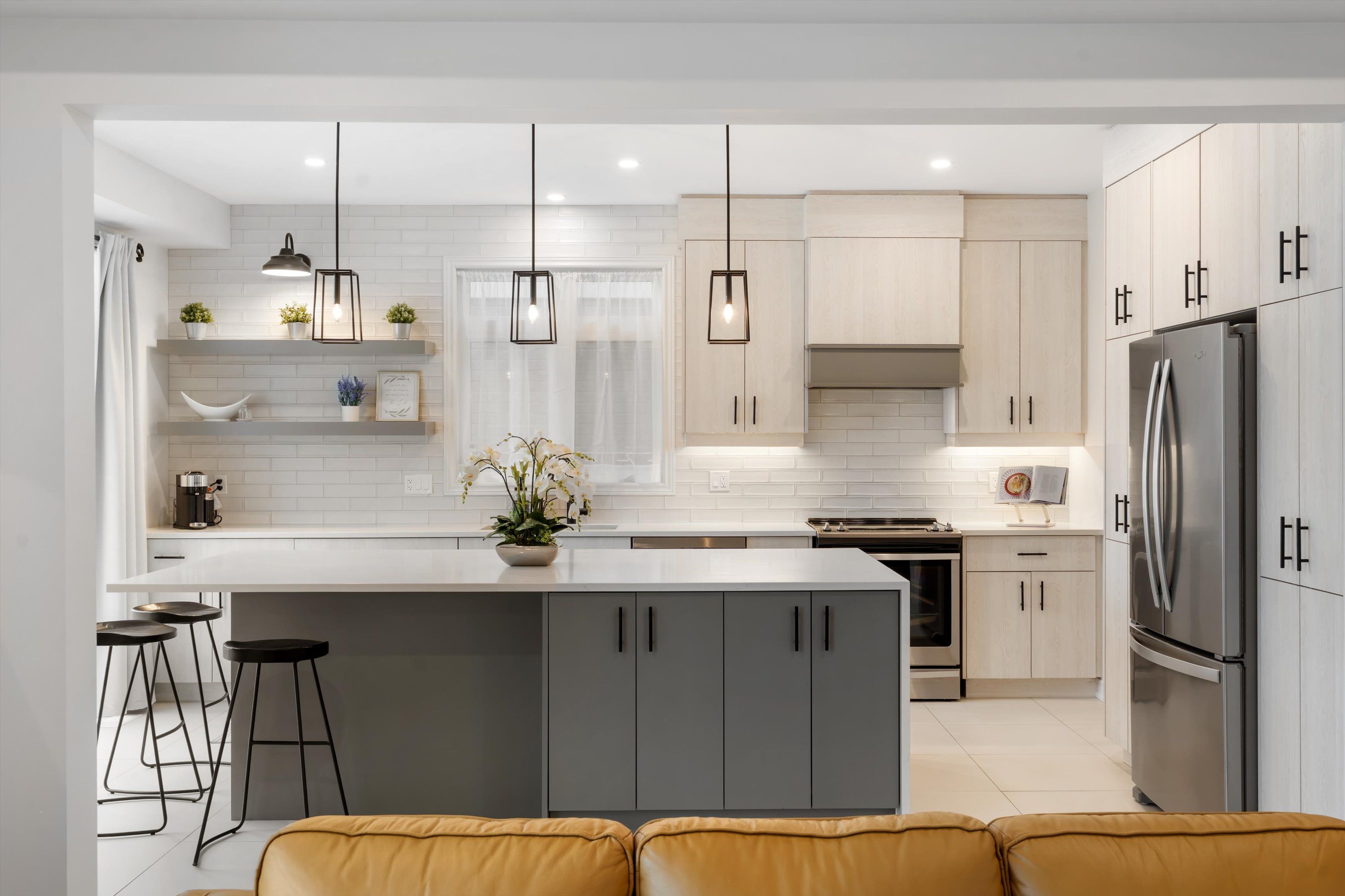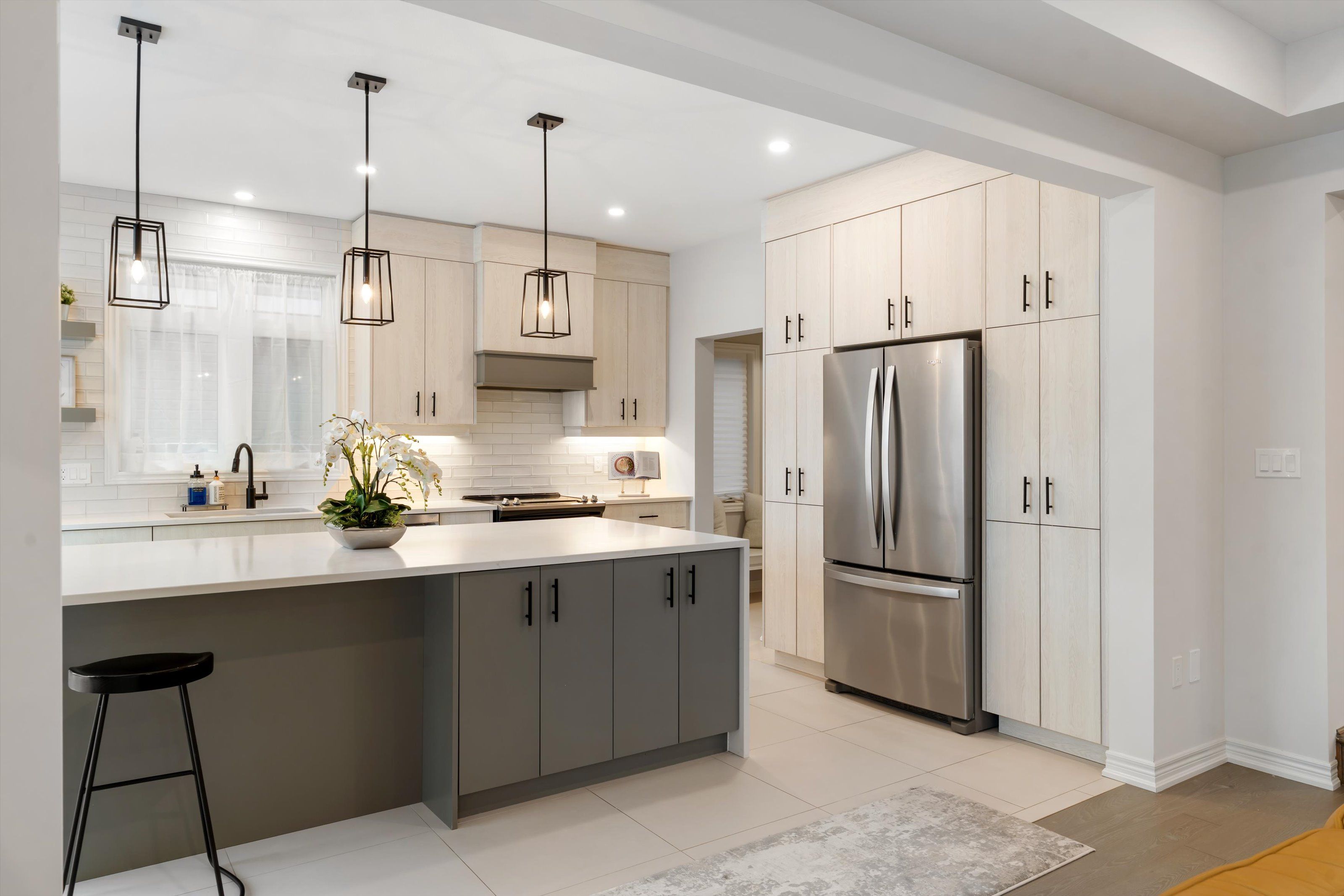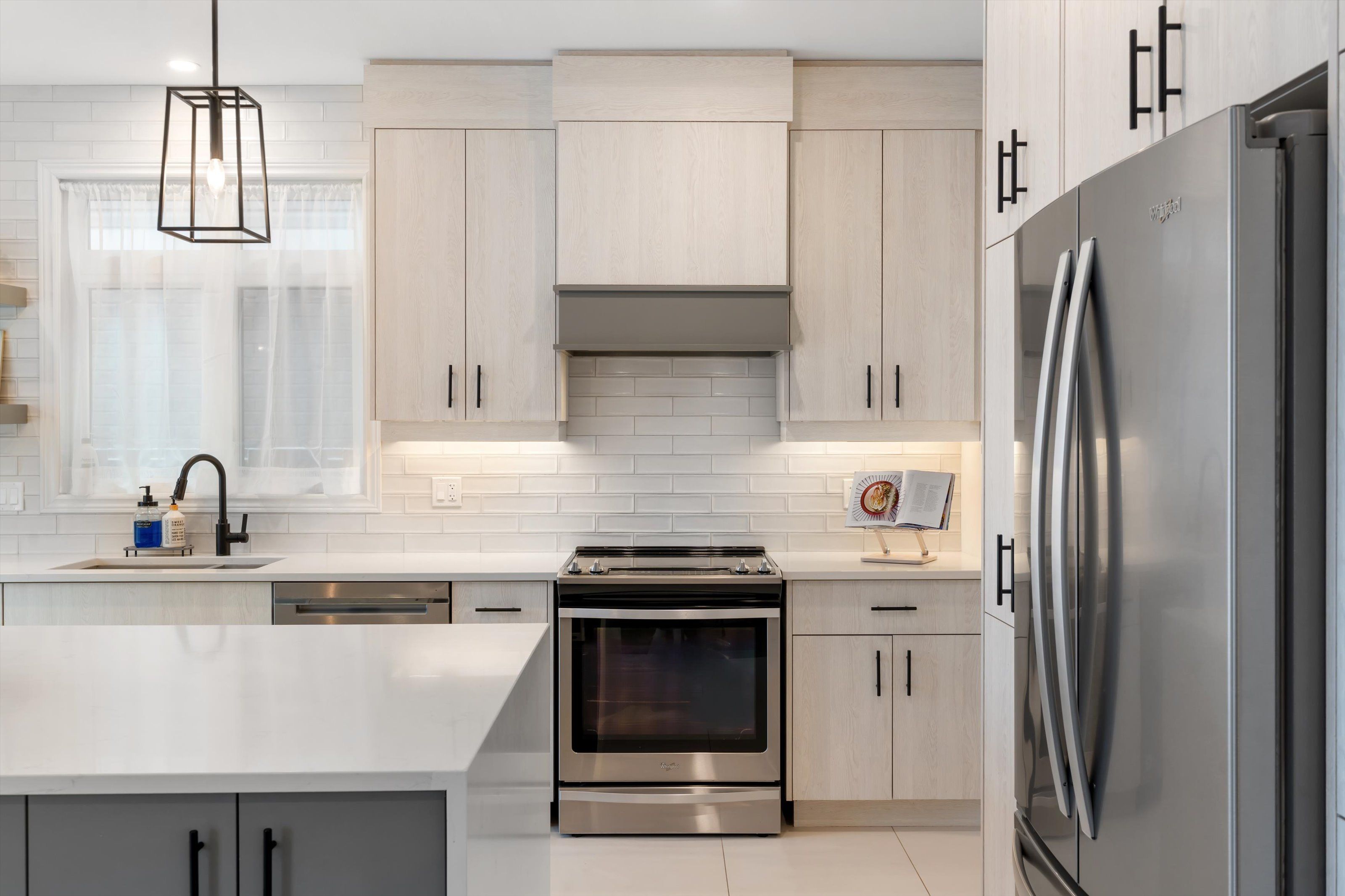 • High-end kitchen with quartz counters, stainless steel appliances, and ample storage.