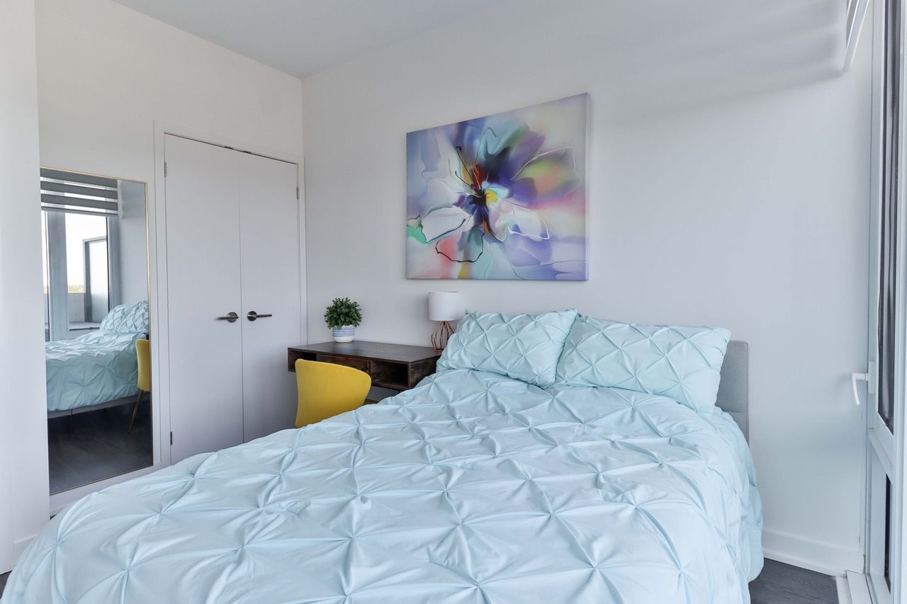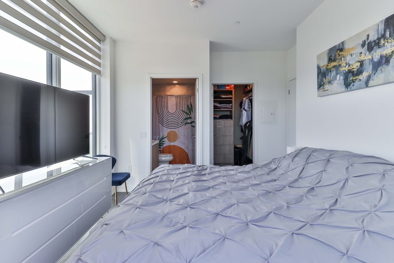 • Spacious primary bedroom with walk-in closet and city views.