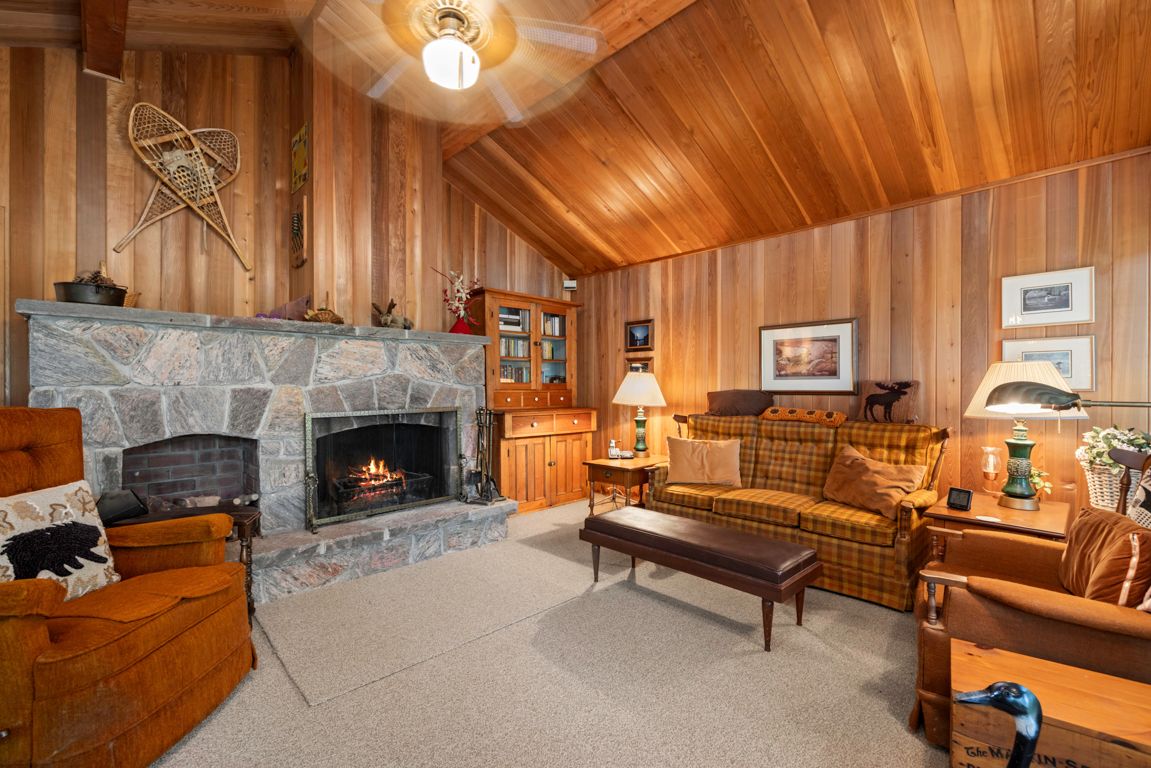 • Cozy great room with vaulted ceilings and stone fireplace.