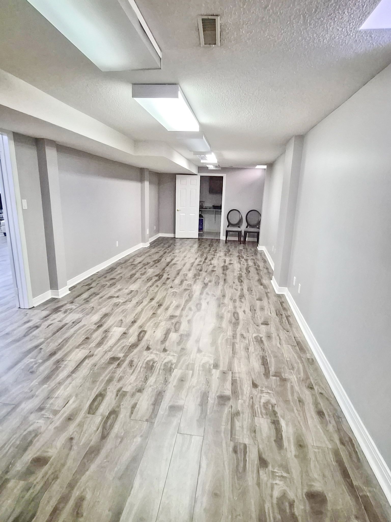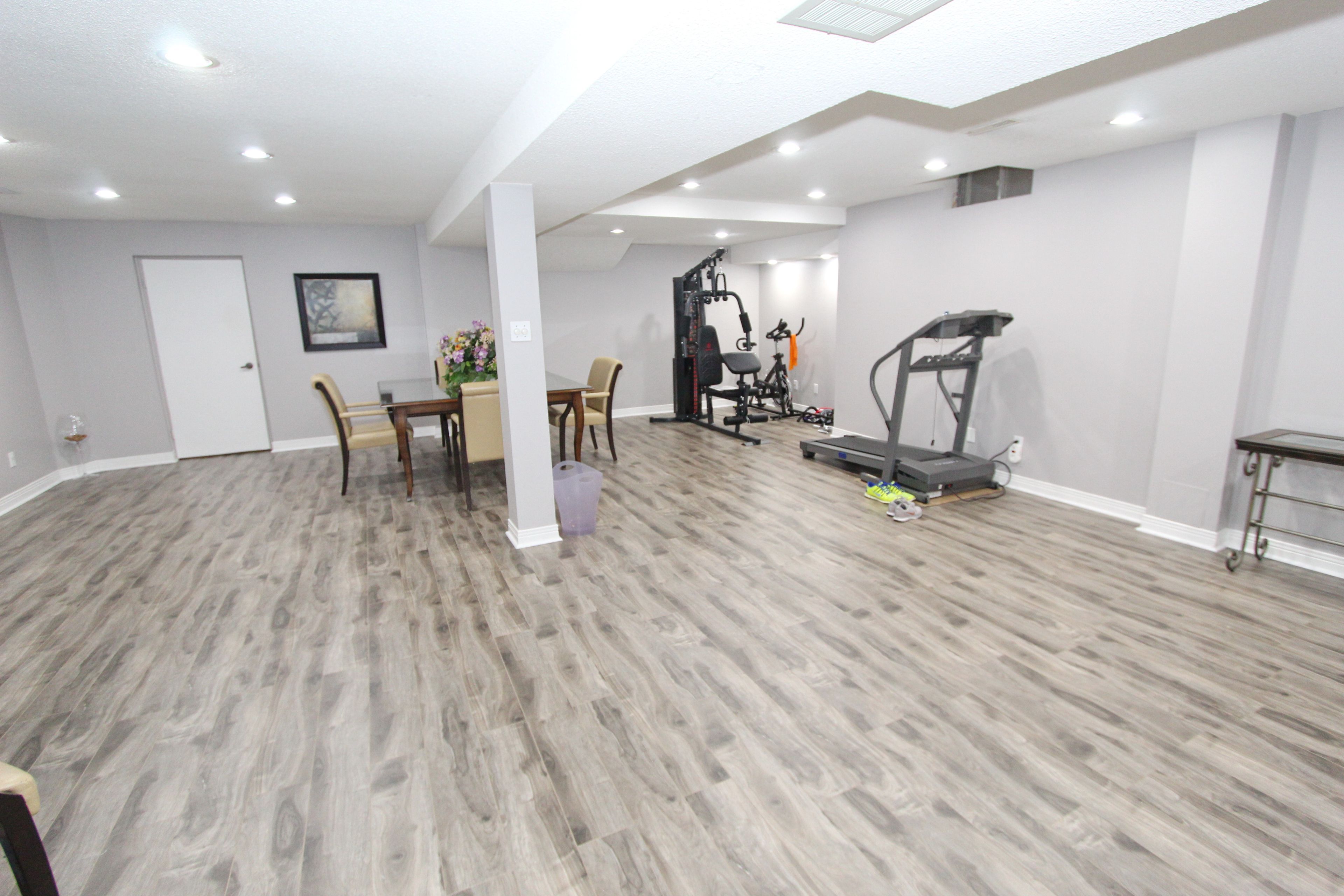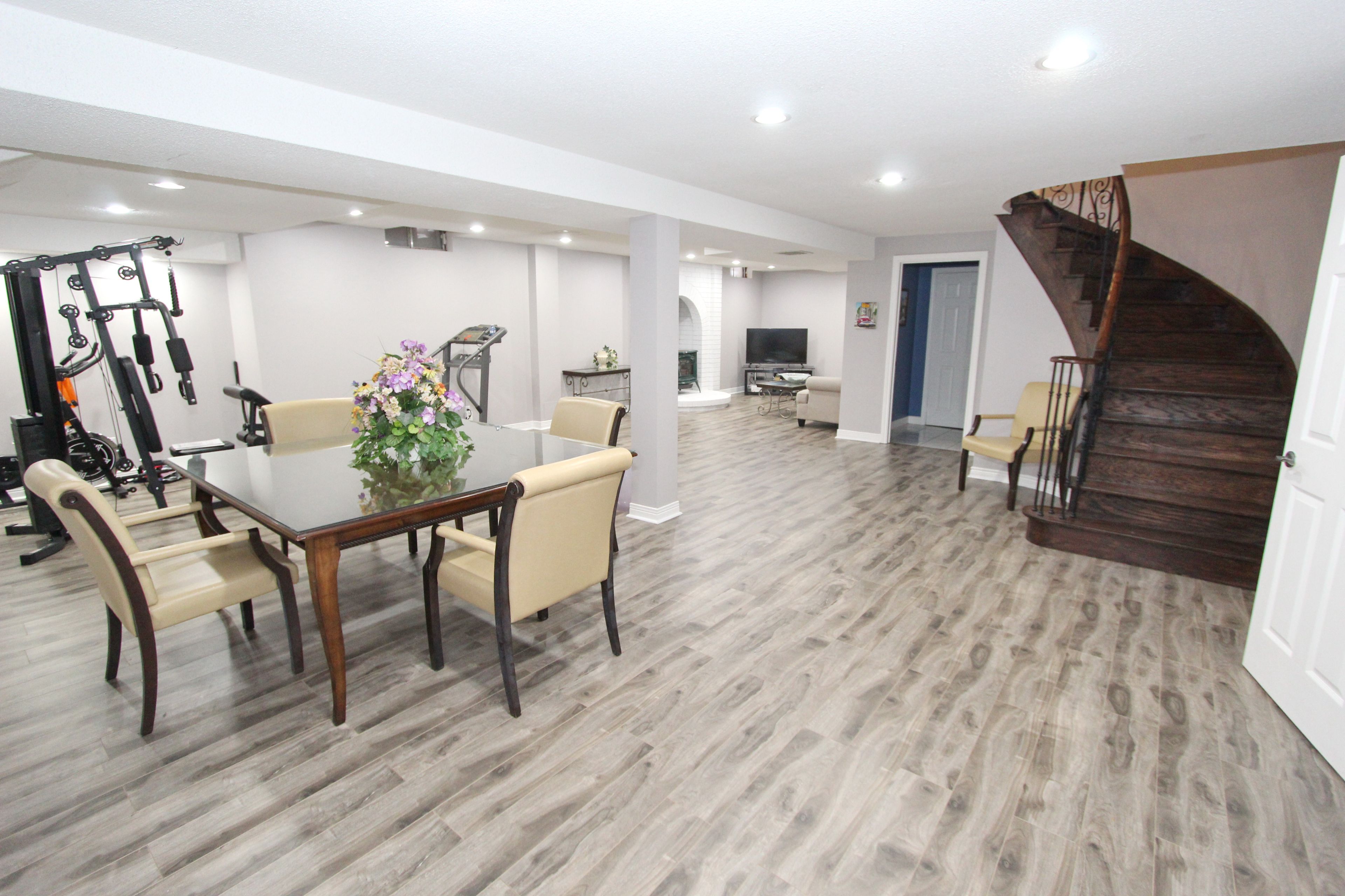 • Finished basement with recreation area, kitchen, and extra bedroom.