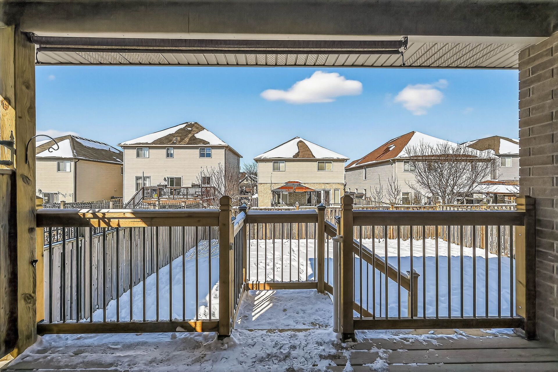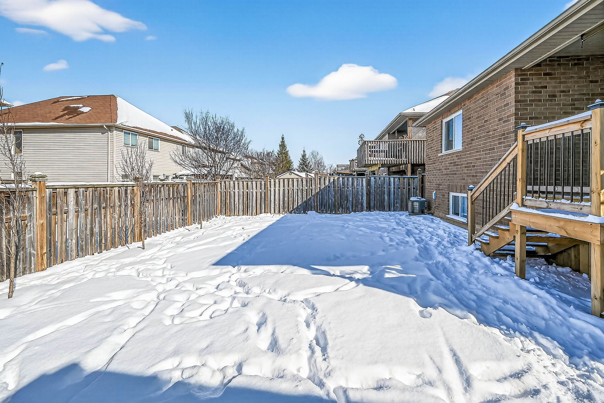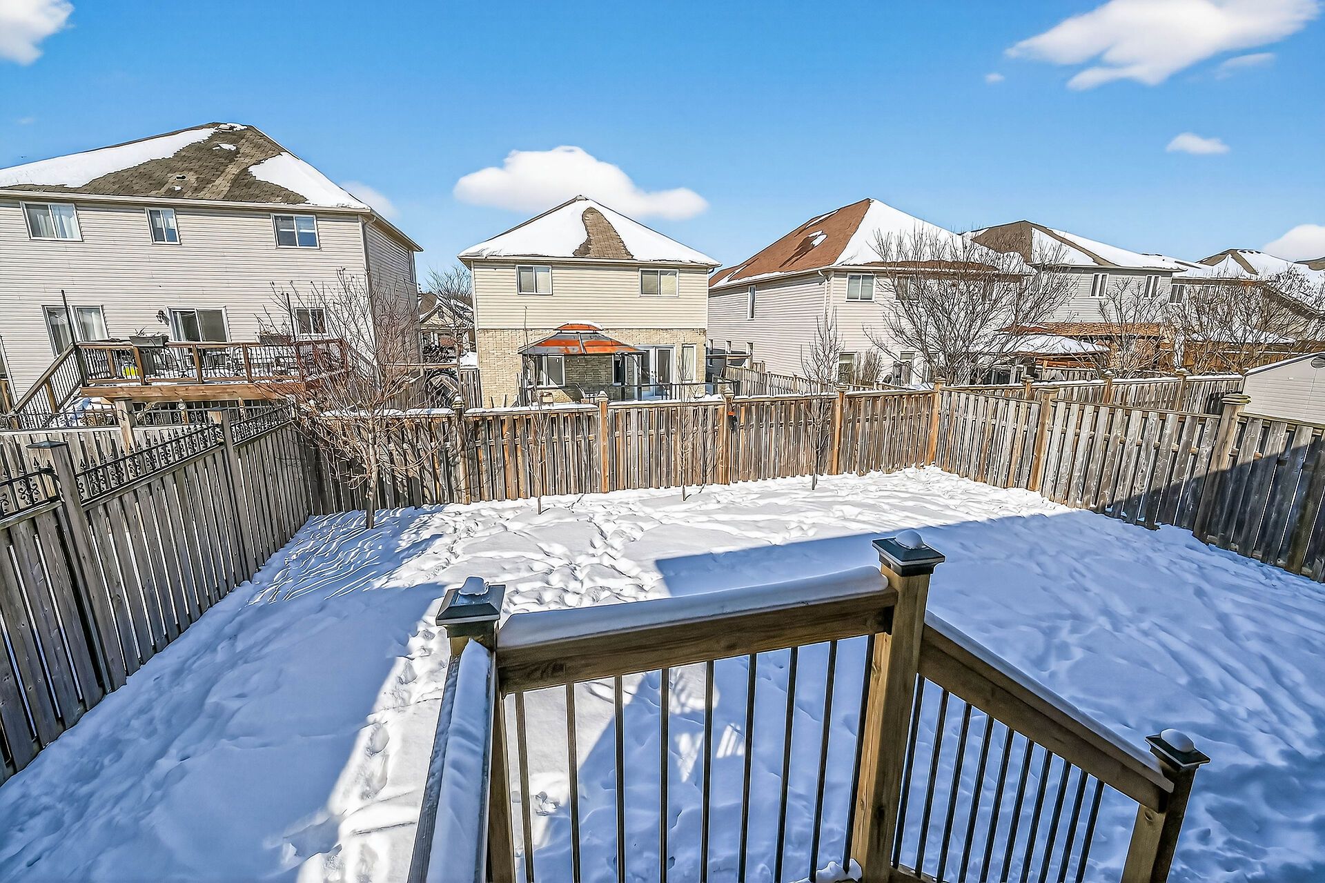 • Covered rear deck with gas BBQ hookup overlooking a fenced yard.