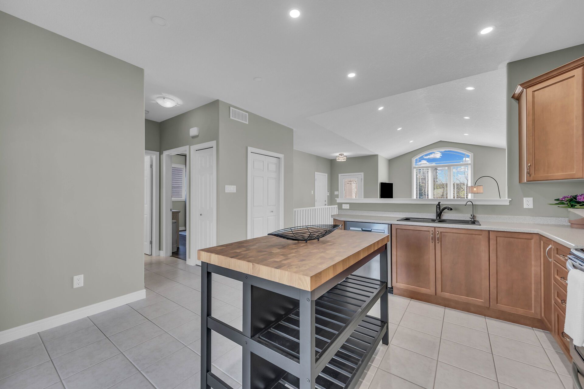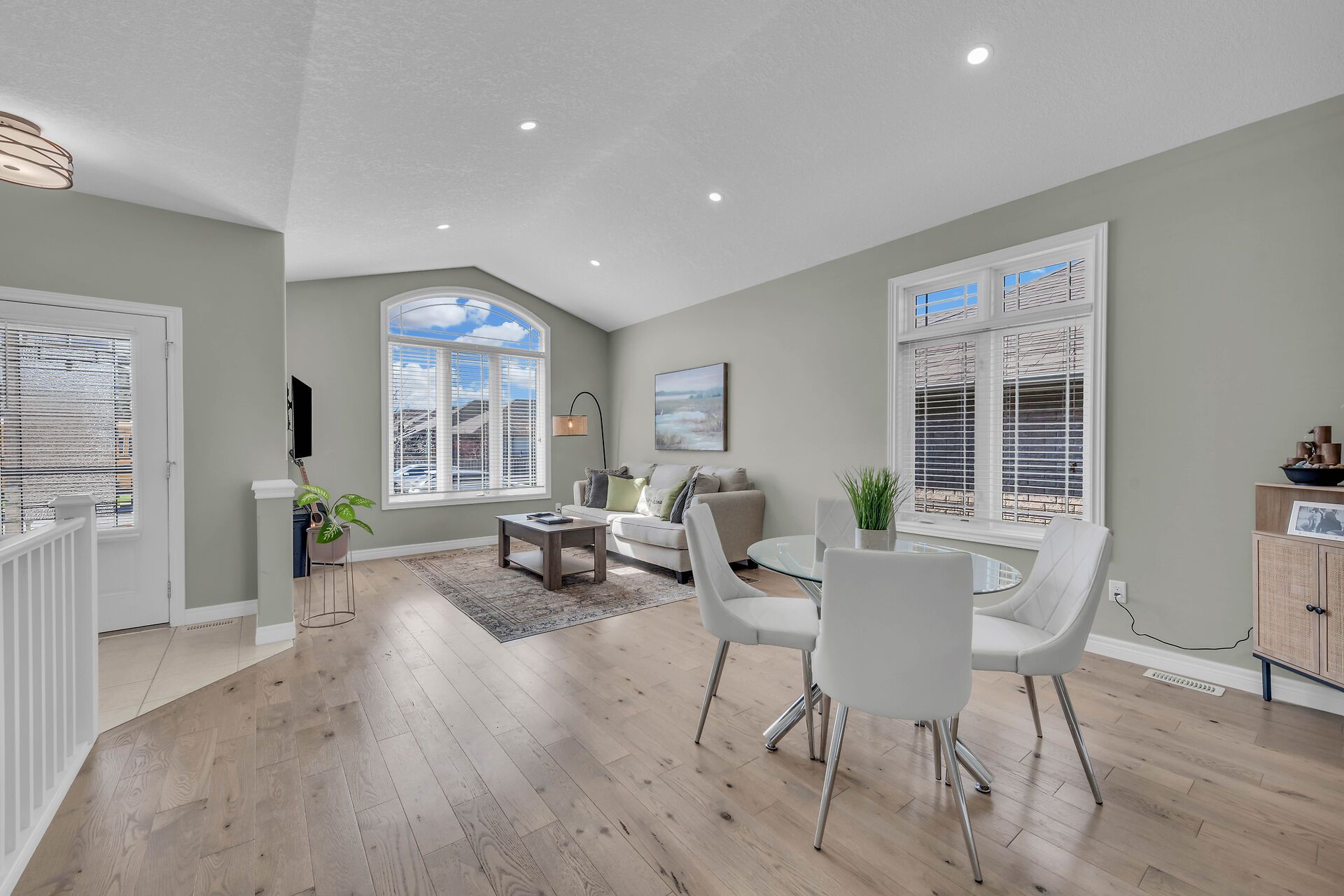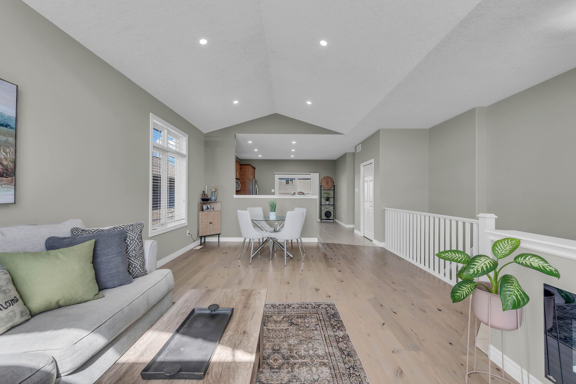 • Open-concept design with soaring ceilings and a bright kitchen.