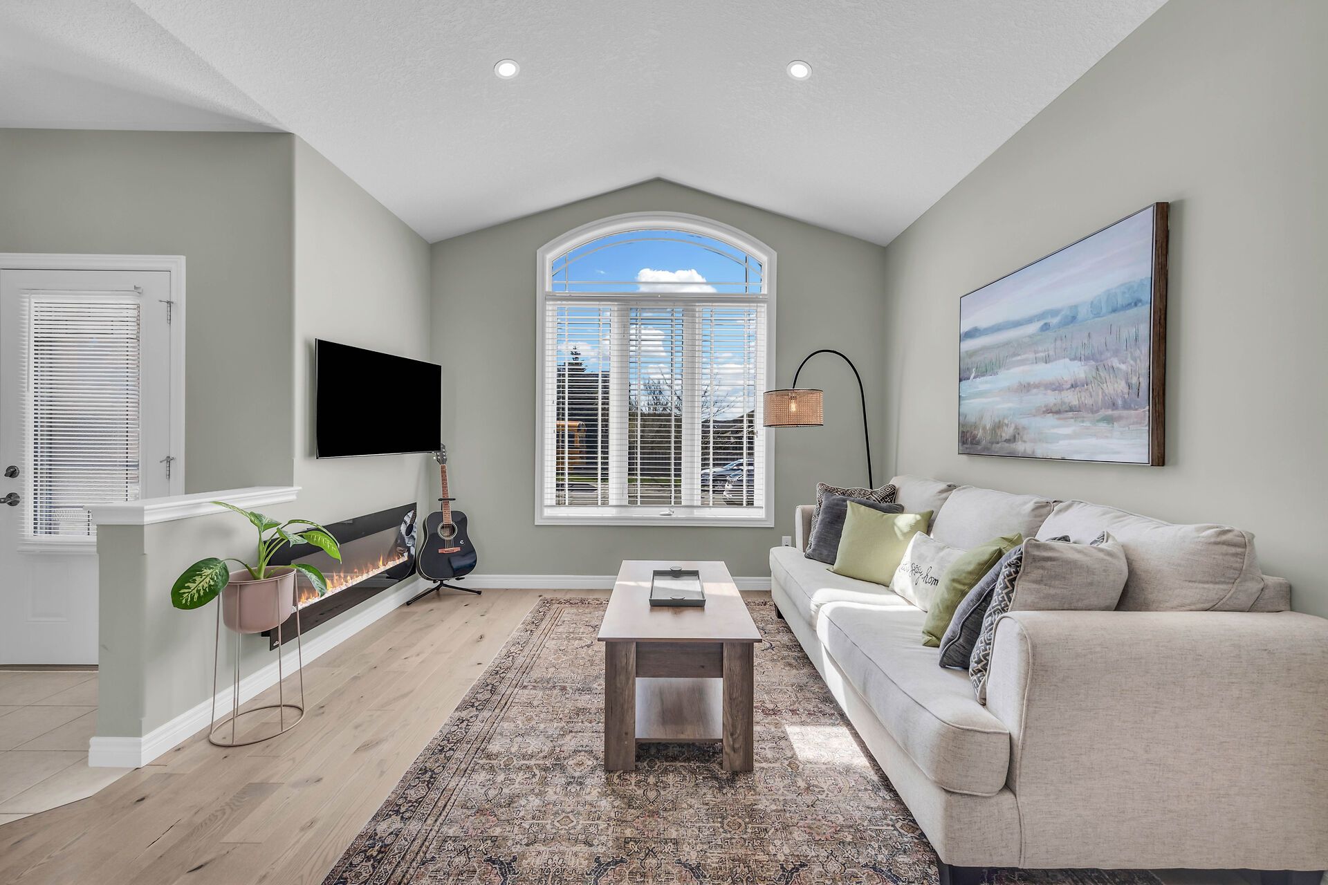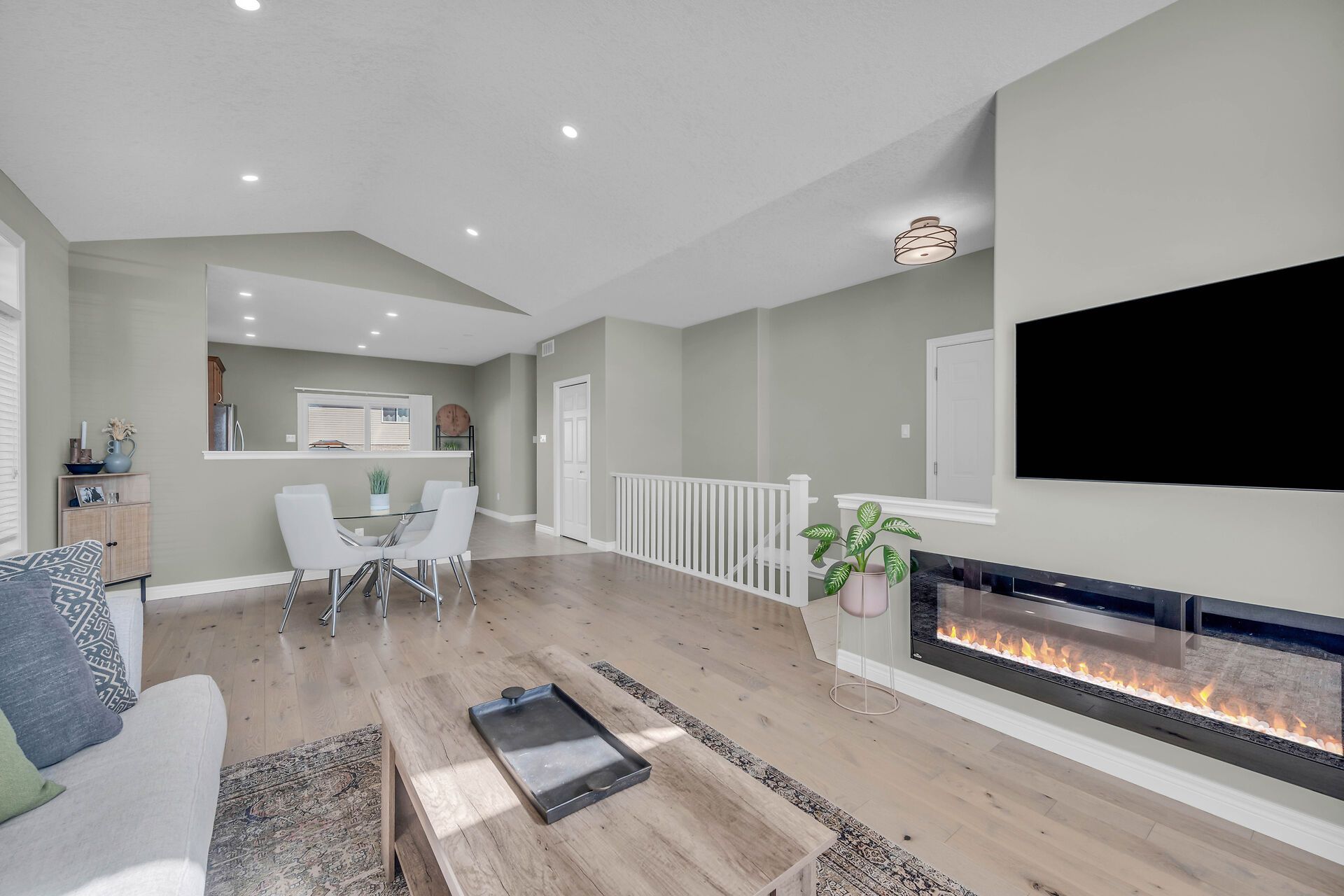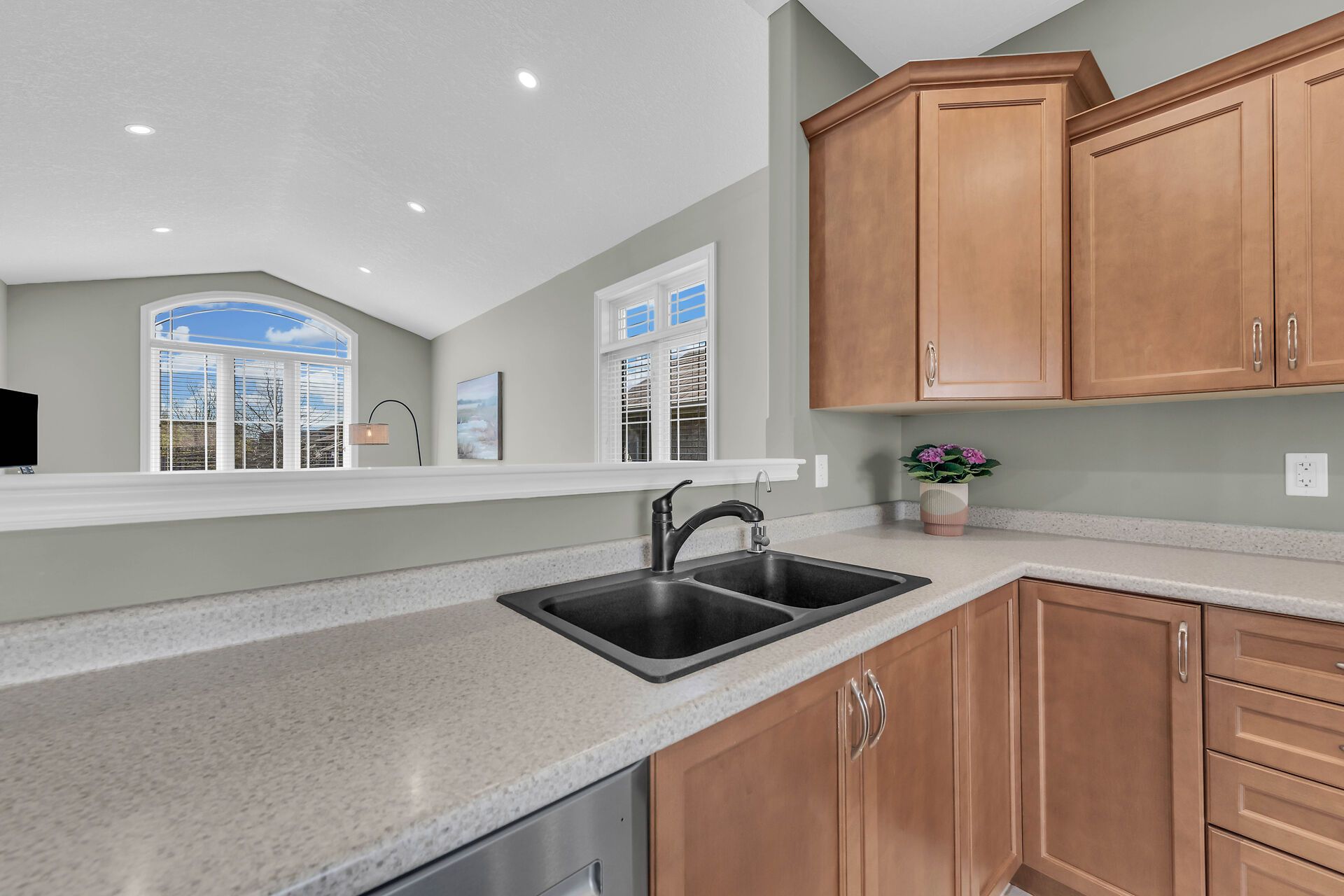 • Open-concept design with soaring ceilings and a bright kitchen.