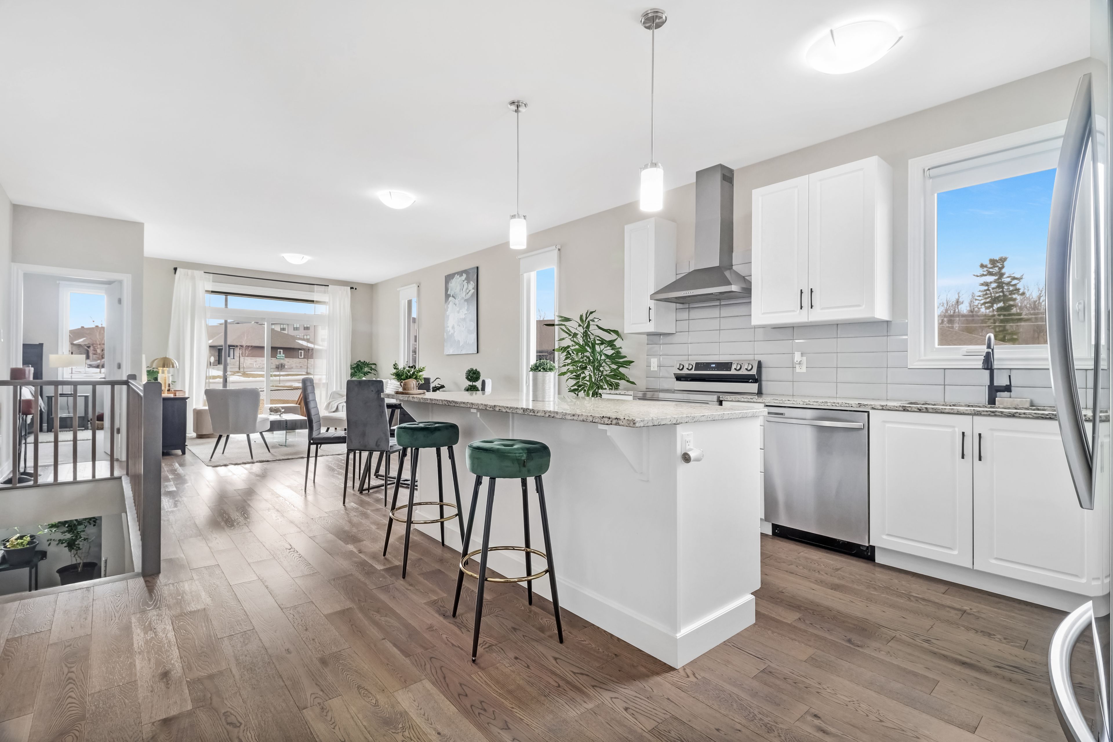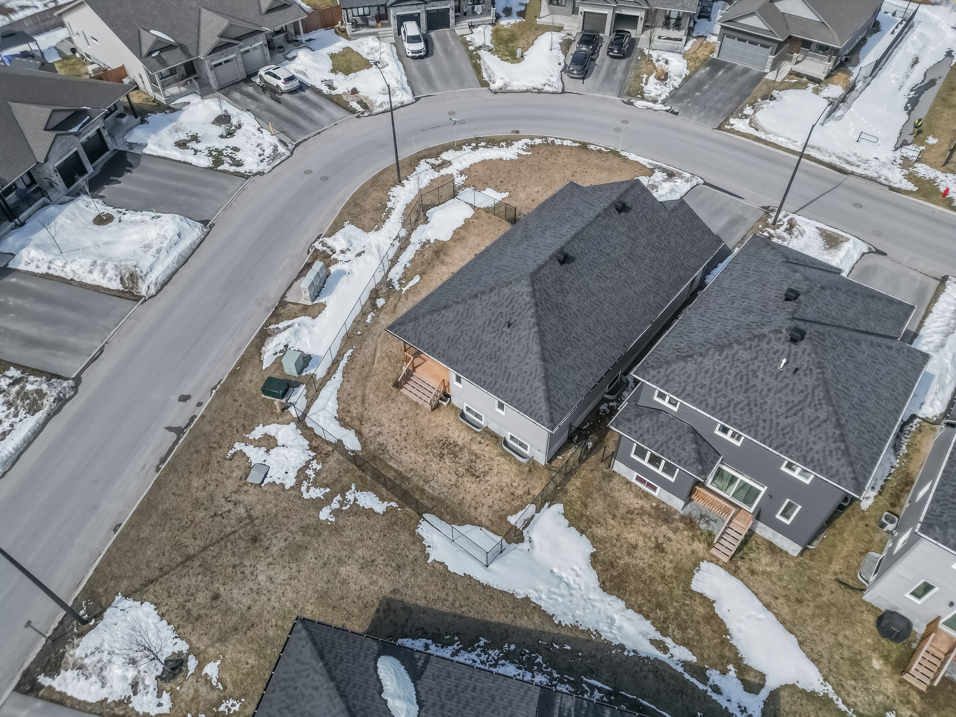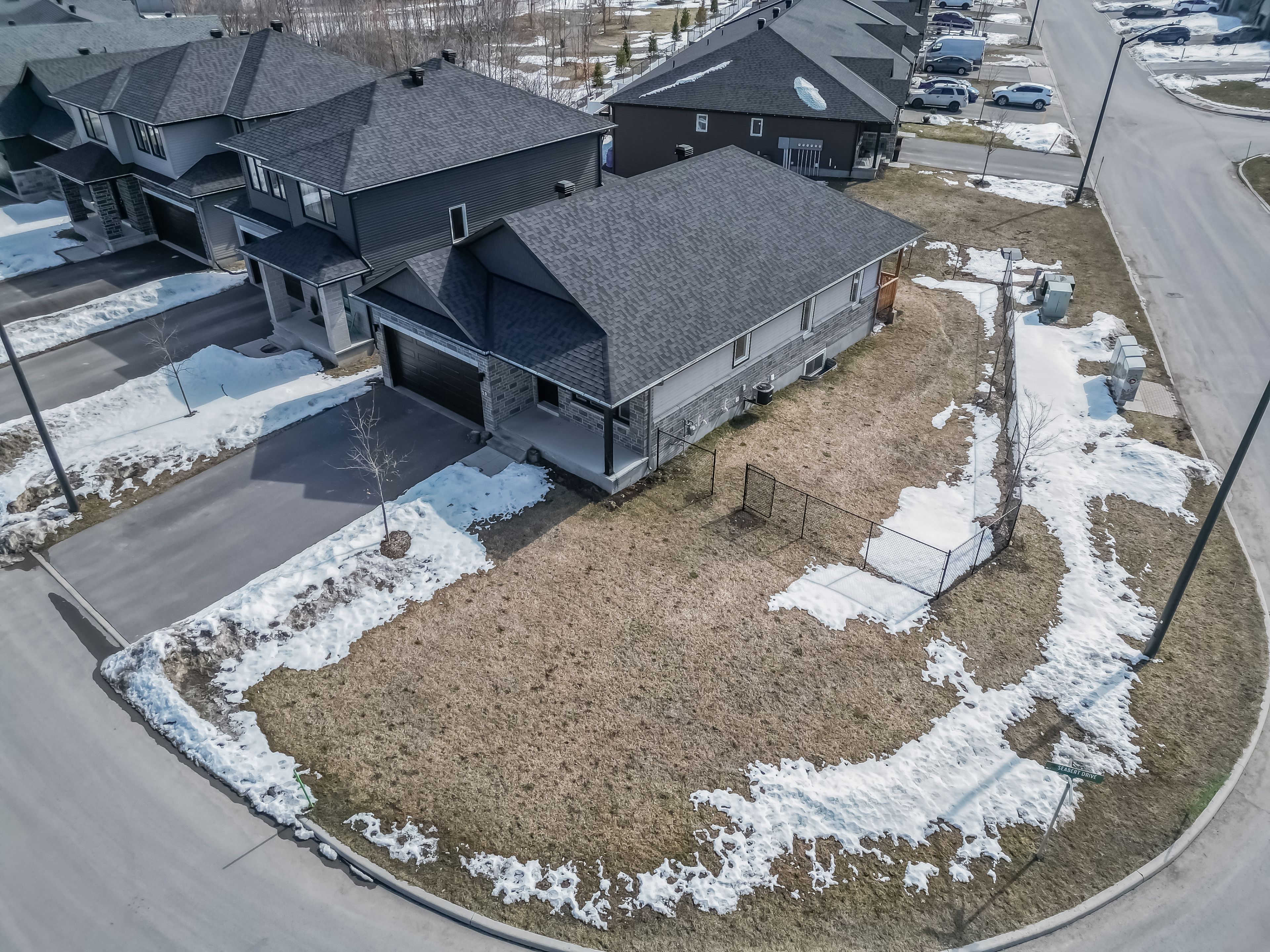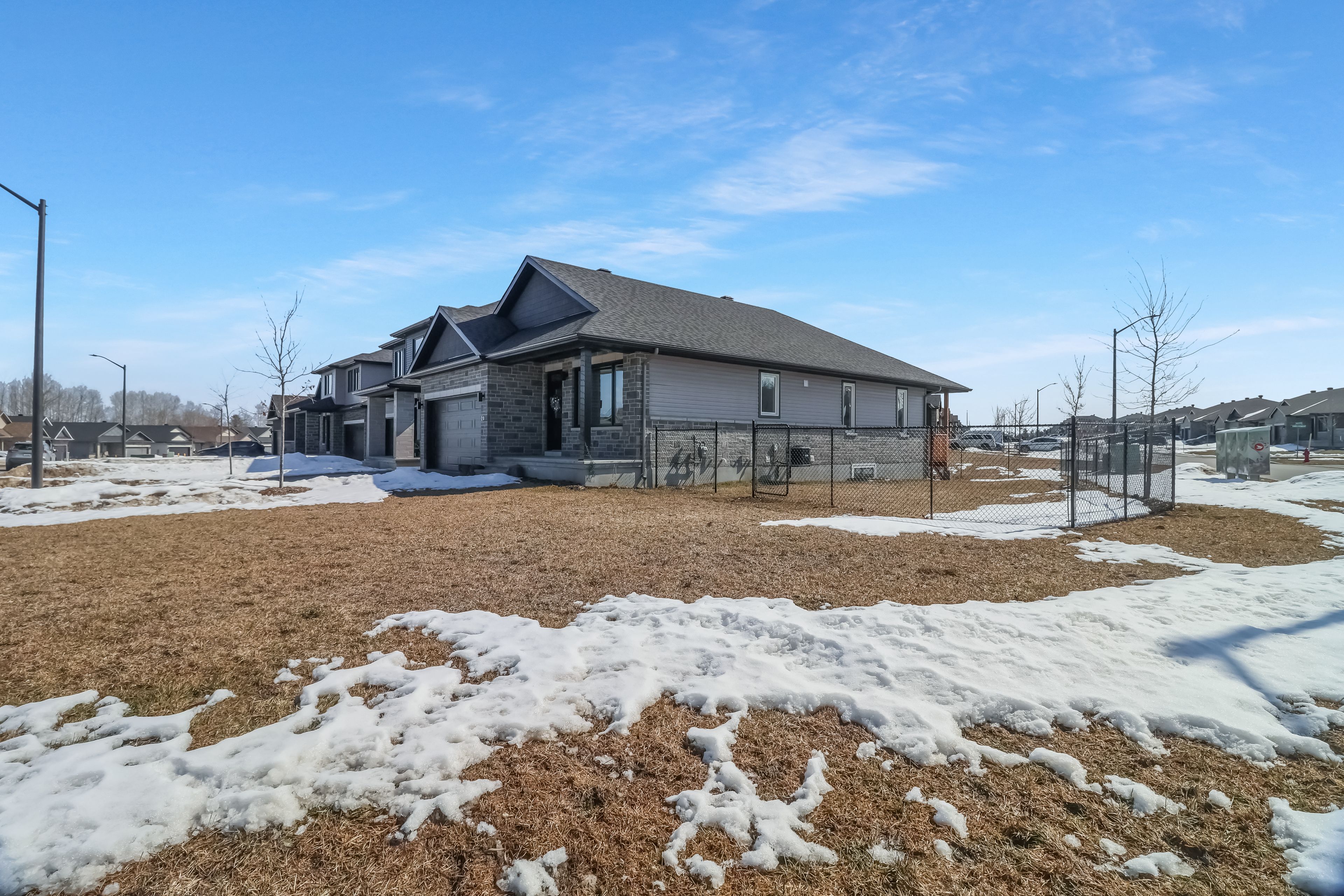 Discover this exquisite 4-bedroom + den, 3-full-bathroom detached bungalow with a 2-car garage, perfectly situated on a massive corner lot. Flooded with natural light, this home welcomes you with a grand foyer and a versatile den, currently serving as a formal dining space but easily suitable as an office or other flexible area. The main floor unveils a gourmet kitchen that flows effortlessly into a bright, open living area. Featuring granite countertops, a tiled backsplash, a spacious center island, abundant cabinetry, and a charming chimney, the kitchen exudes both style and warmth. Sliding doors from the living area open to a stunning backyard deck, ideal for serene outdoor relaxation. The expansive primary suite offers a generous walk-in closet and a private ensuite with a convenient walk-in shower, joined by two additional well-sized bedrooms and a second full bathroom on the main level. The fully finished lower level, equally bathed in natural light, impresses with a fourth bedroom, a full bathroom, a vast recreation room, and ample storage to accommodate all your needs. Nestled on a prime corner lot that maximizes brightness, this bungalow blends modern upgrades with thoughtful design, creating an inviting and functional sanctuary. Its unbeatable location places you just minutes from the highway, surrounded by all existing amenities, and within walking distance to exciting upcoming retail, making this home a perfect harmony of convenience and contemporary living. Don't miss this extraordinary opportunity, schedule your tour today to experience this captivating residence for yourself!