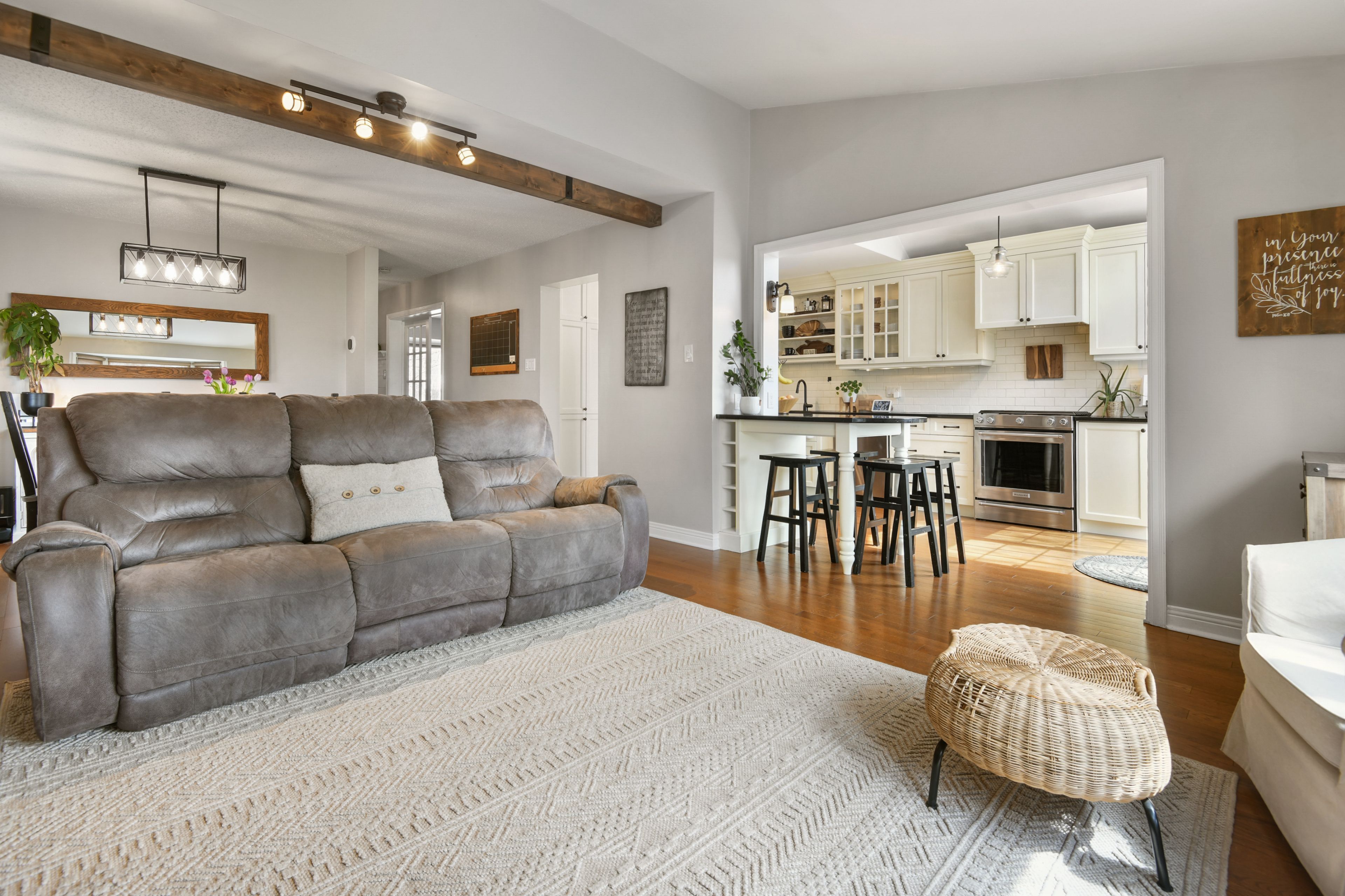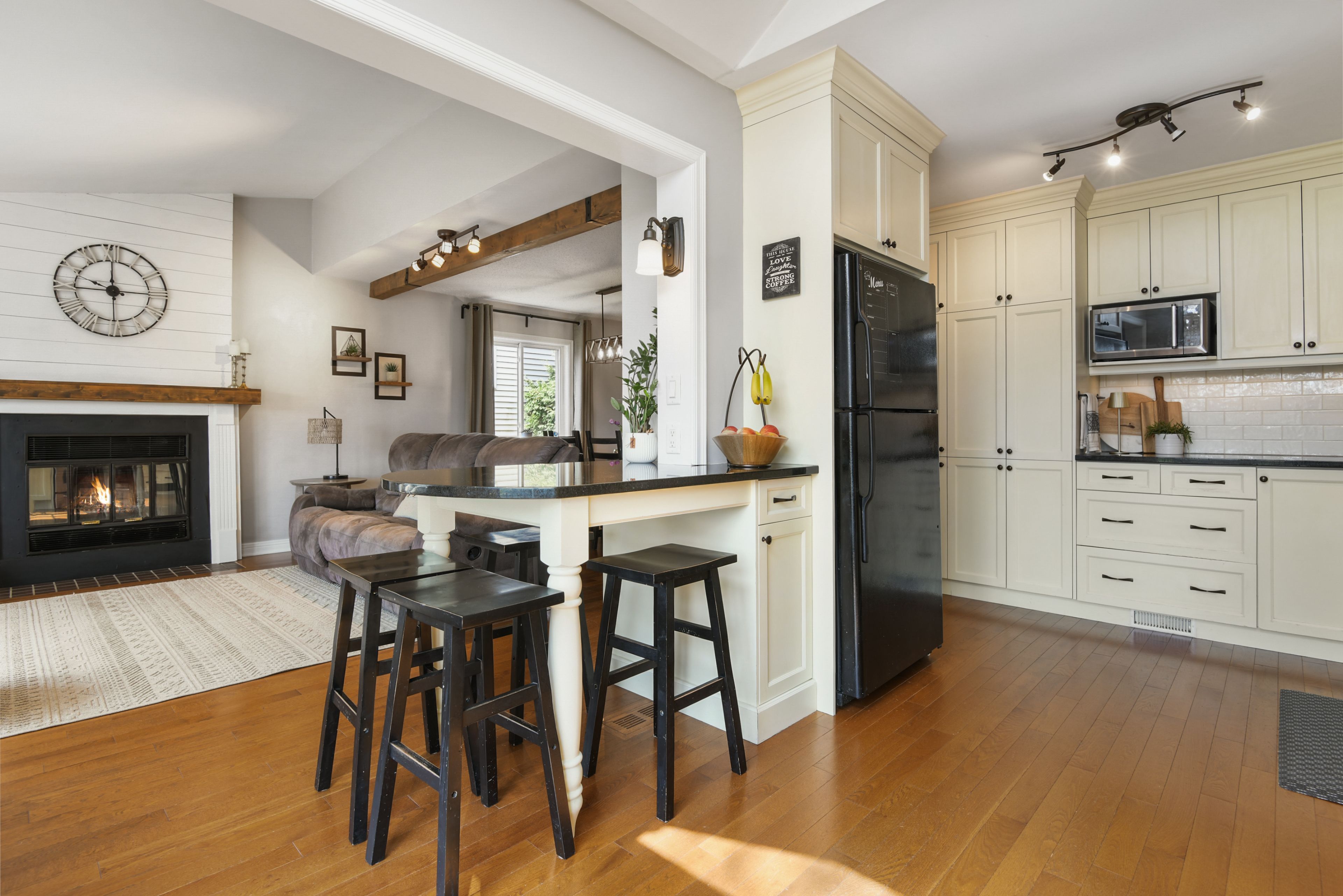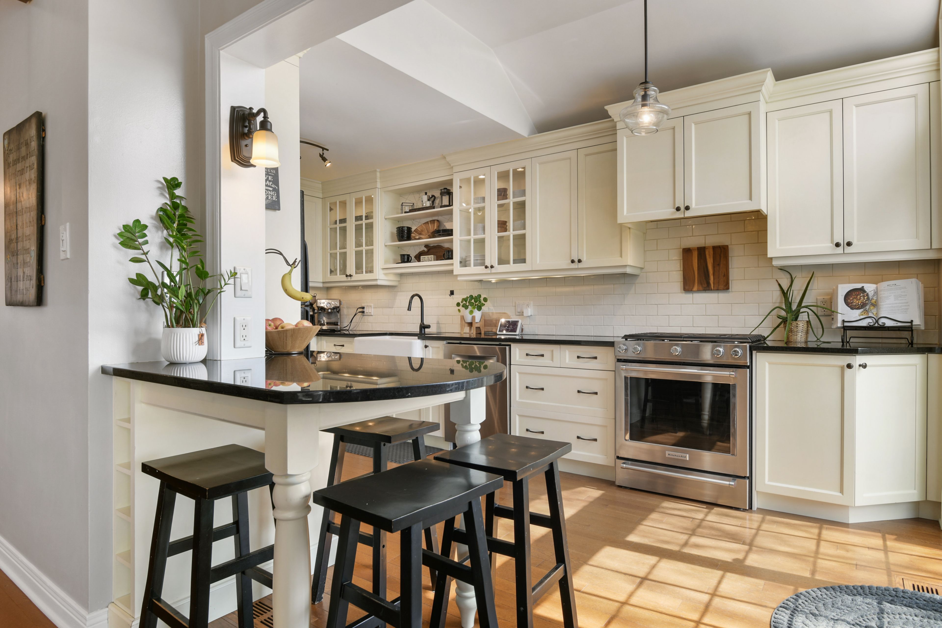 • Updated kitchen with granite countertops and gas stove for modern cooking.