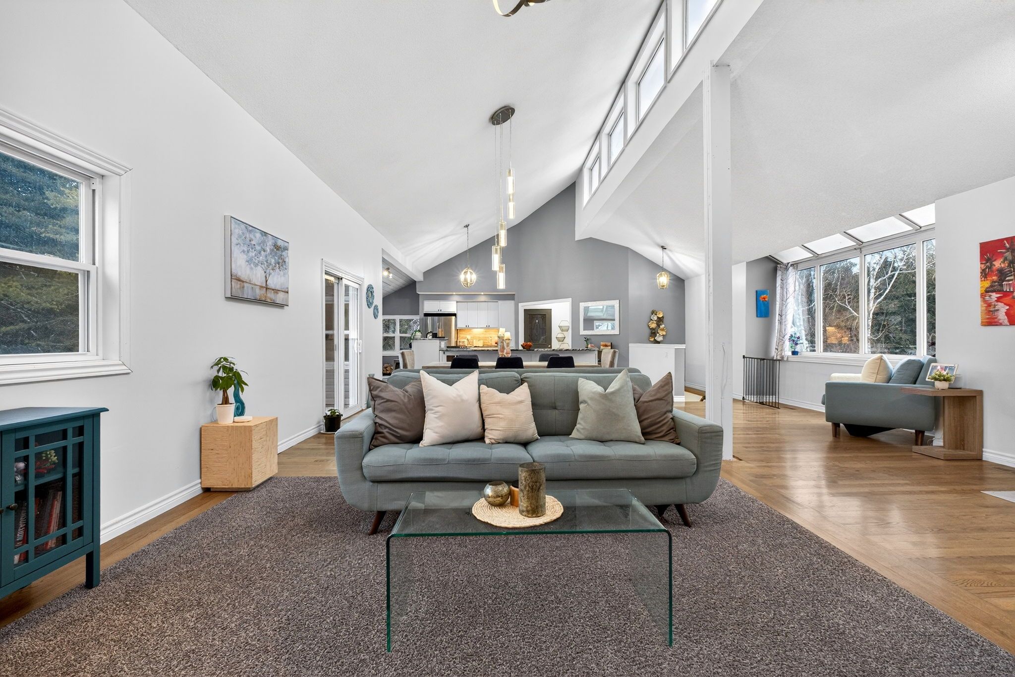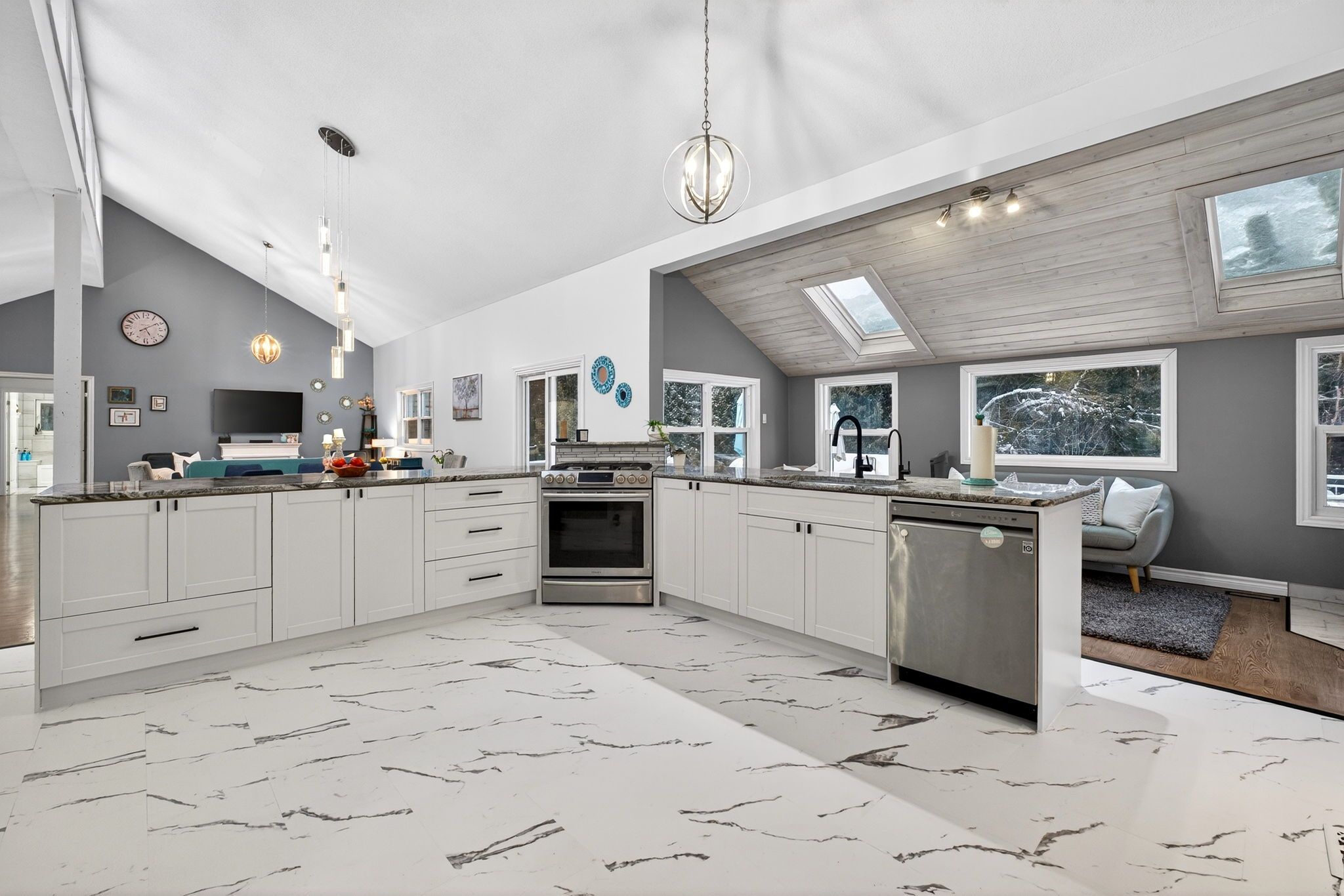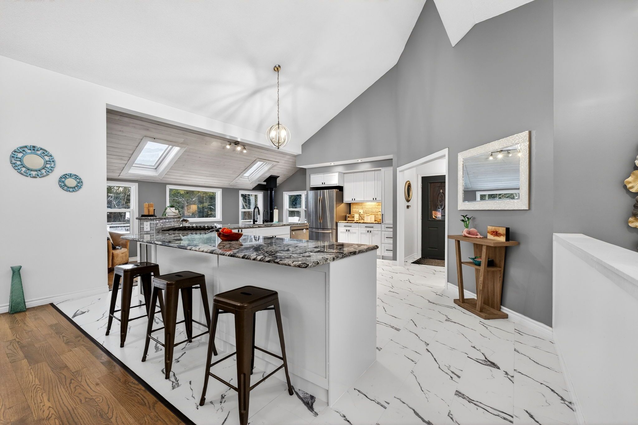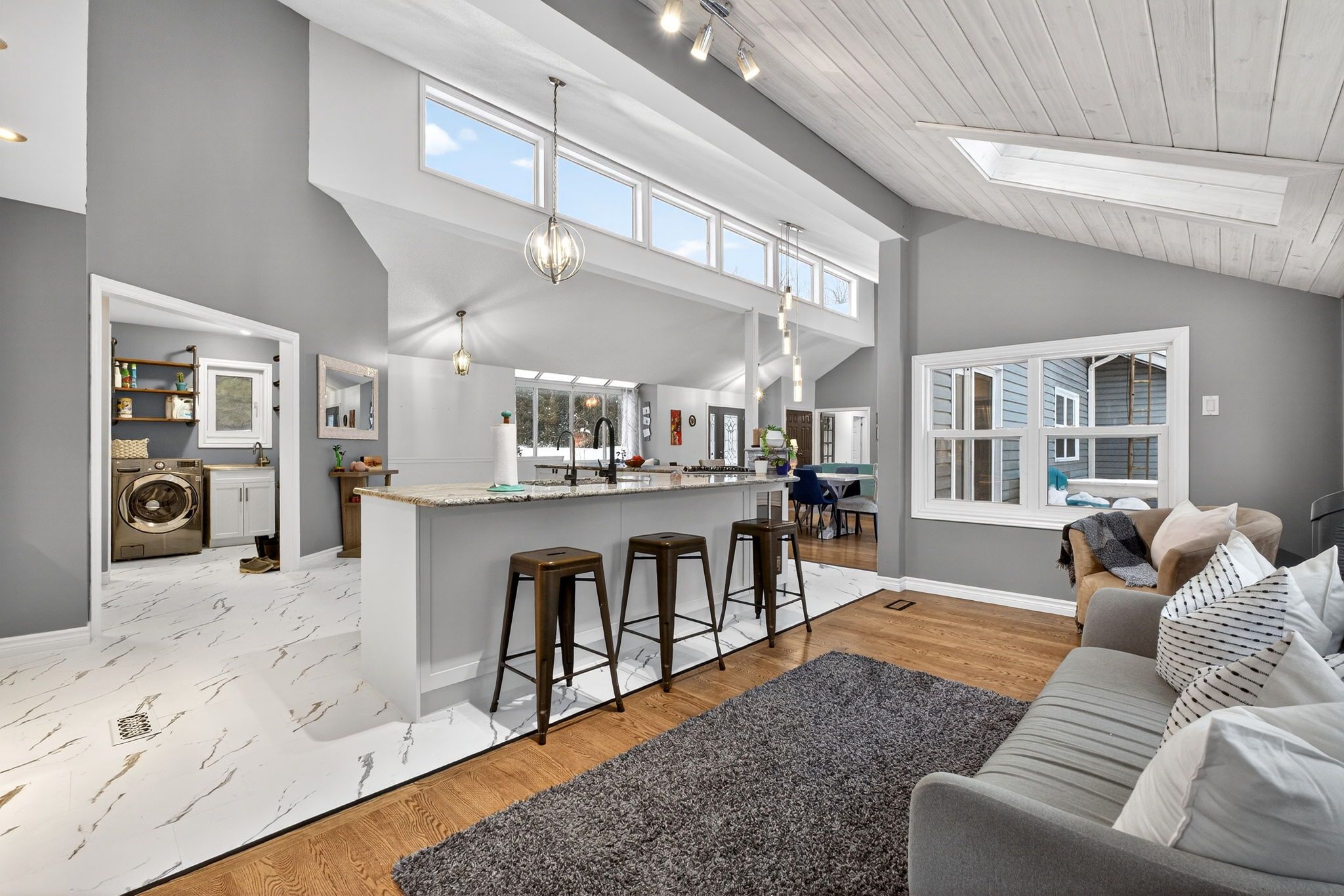 • Open-concept main level with high ceilings and large kitchen.