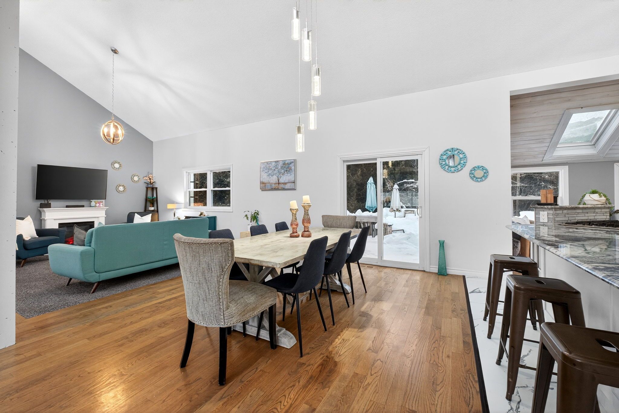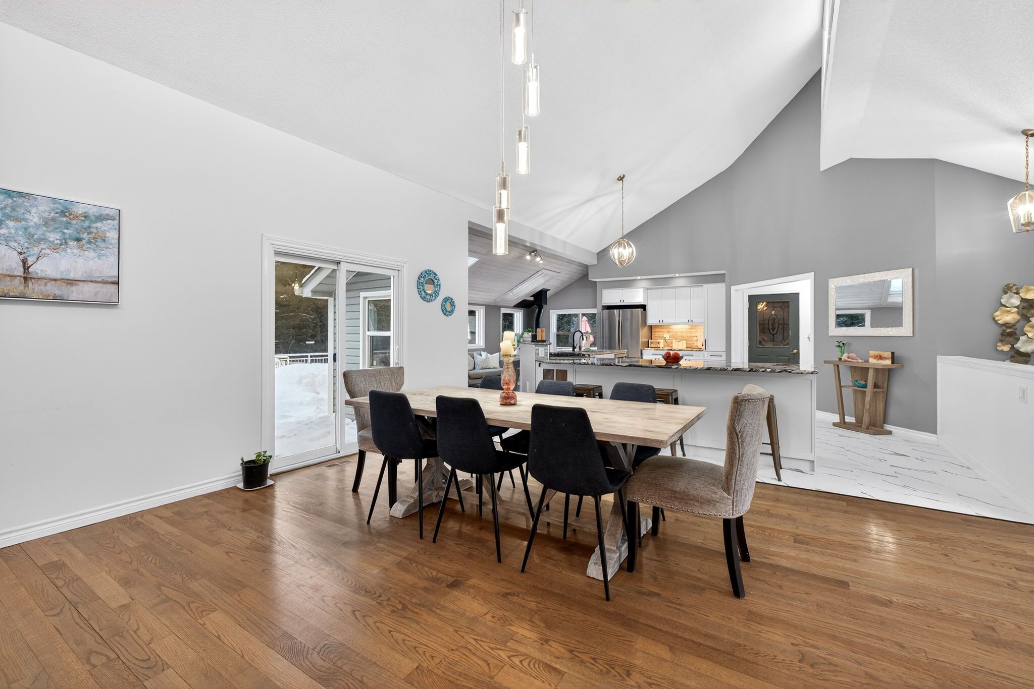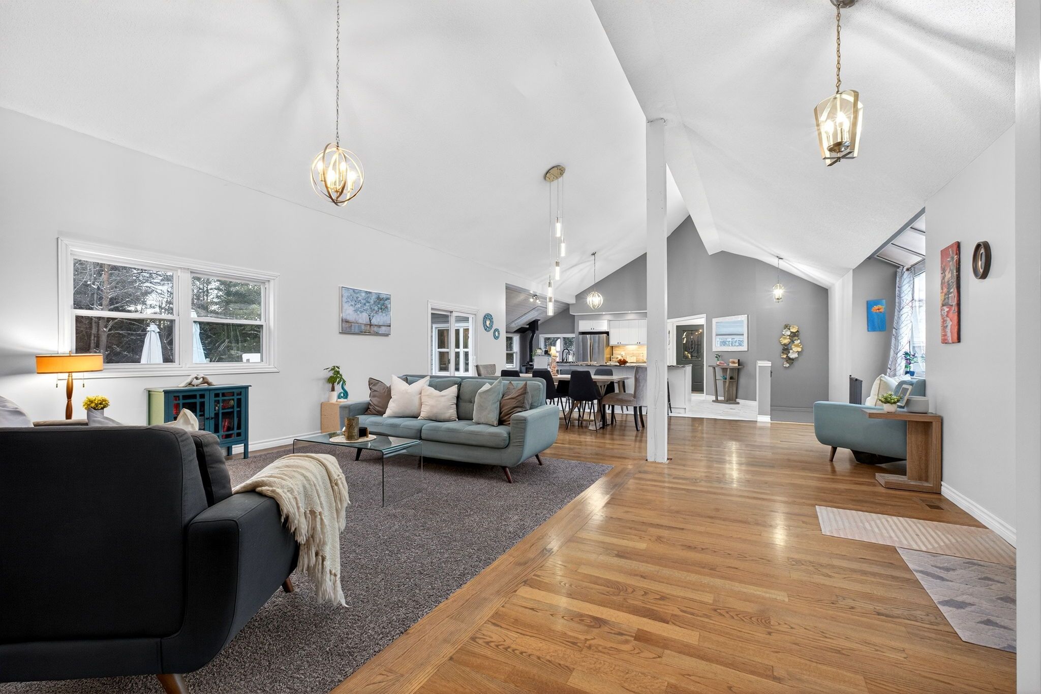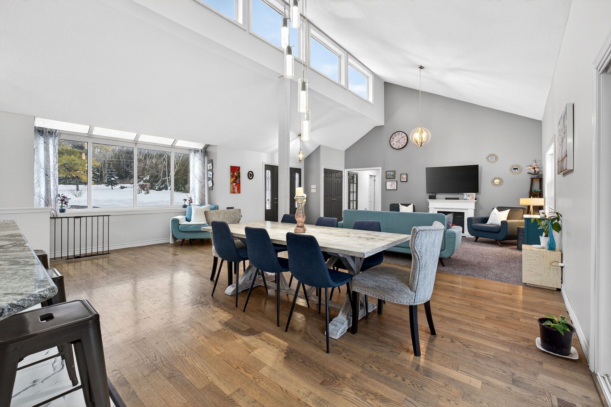 • Open-concept main level with high ceilings and large kitchen.