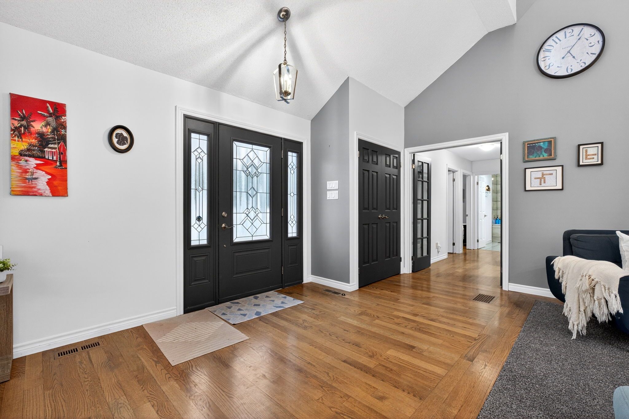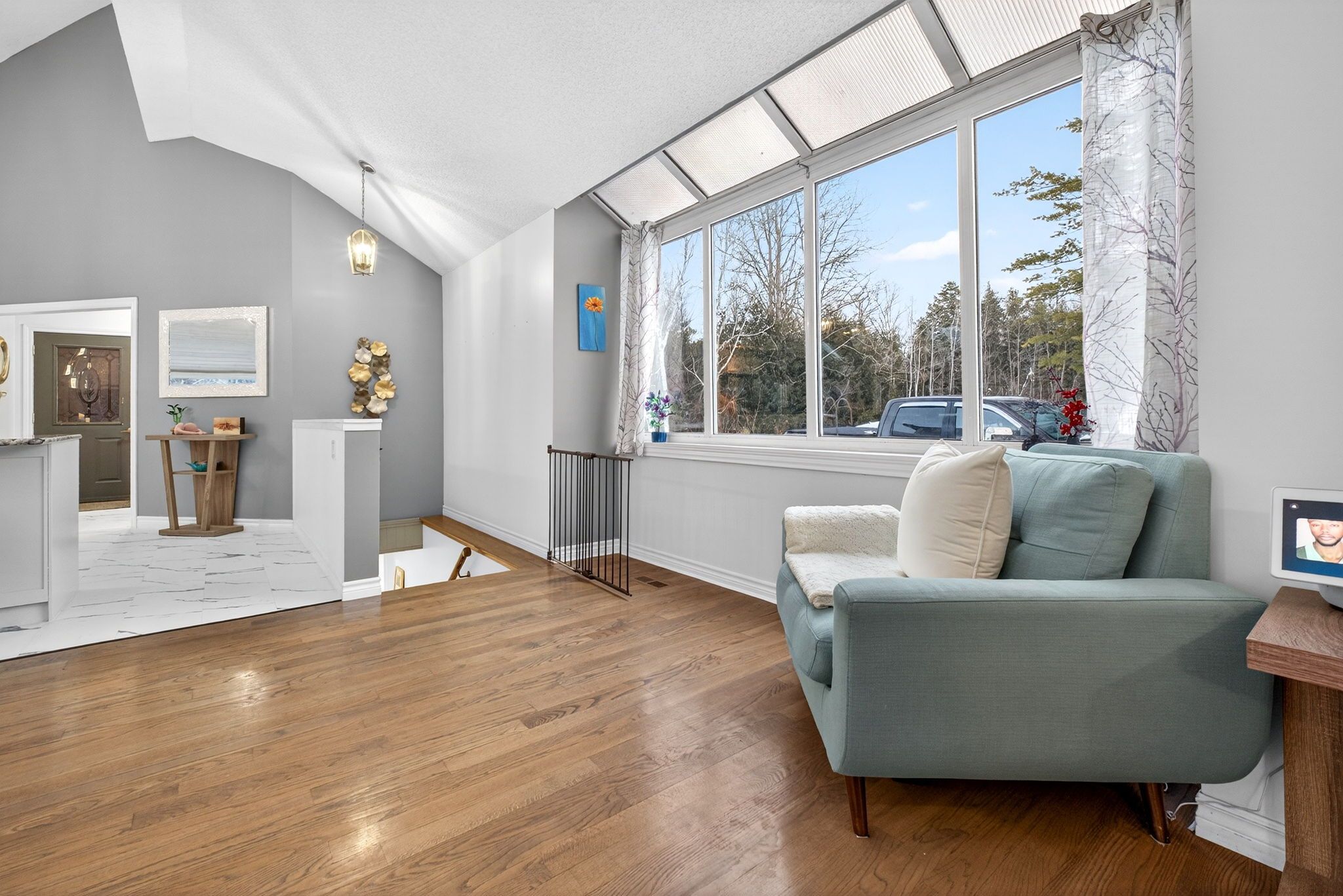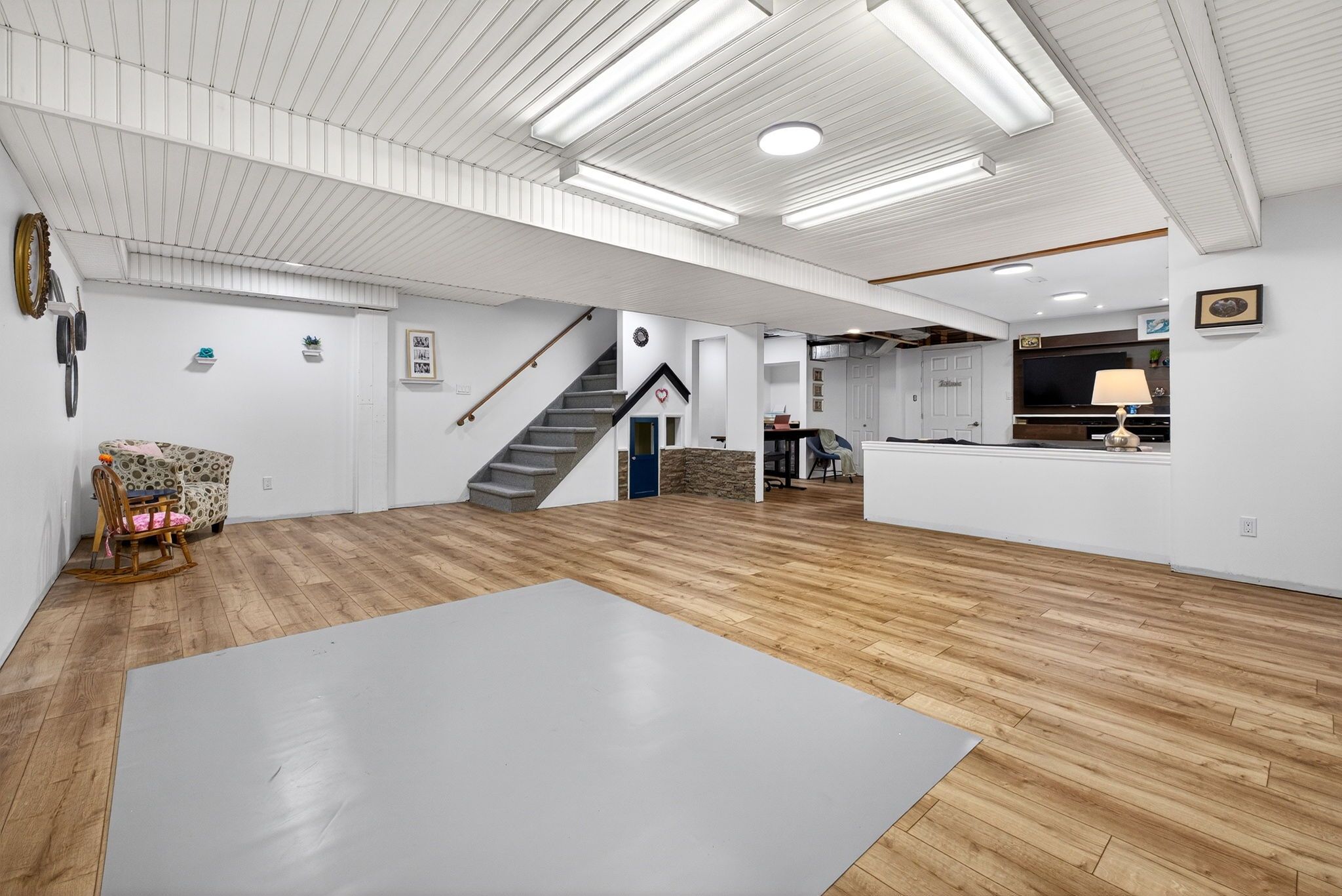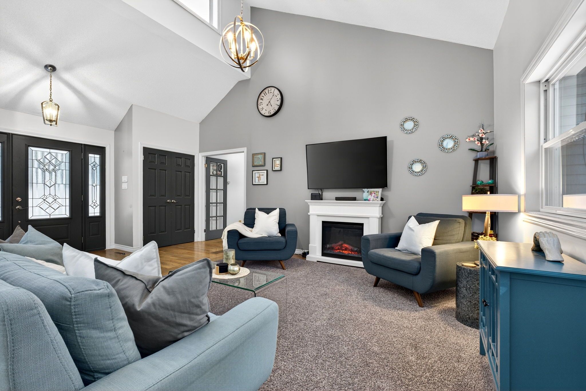 • Open-concept main level with high ceilings and large kitchen.