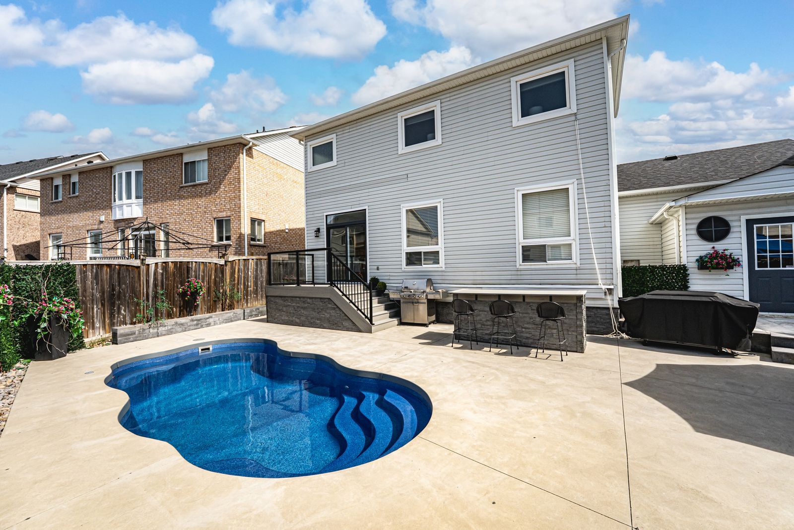 Sought-after innishore address with nearly 3,000 fin sq ft & a resort-style backyard with in-ground pool! Ditch the lawn chair for a poolside lounger because a heated in-ground saltwater pool is only the beginning of what this nearly 3,000 finished sq ft innishore home has in store. Forget the standard cookie-cutter arrival; this stone-accented home makes its entrance with a wraparound porch, double-door entry, a double garage with a garage heater, and parking for 4 more in the driveway. Built in 2005, this well-kept 4-bedroom, 4-bathroom home carries its pride of ownership beautifully, with fresh paint, hardwood floors, 9-foot ceilings on the main level, and main floor laundry. The kitchen presents granite countertops, stainless steel appliances, extensive dark cabinetry, a large single-basin sink, garburator, servery, and excellent storage. An upgraded back sliding door opens from the dining area to the composite deck and backyard, creating an easy connection to the outdoor space where the newer heated pool, gas bbq hookup, storage shed, included pool equipment, outdoor decorations, plants, and moveable bar make summer feel very well accounted for. Upstairs, 4 bedrooms include a spacious primary retreat with a walk-in closet and a 5-piece ensuite, while a main 4-piece bath serves the remaining bedrooms. The partially finished basement adds a rec room, powder room, and space to customize over time to suit your needs. Shingles were replaced in 2021, upper windows have been replaced, and with no rental items, an owned water heater, water softener, central vac, and a high-efficiency furnace already in place, this home has been thoughtfully maintained from top to bottom. Set on a sought-after street in barrie's innishore neighbourhood, this address places you within walking distance to schools, parks, and trails, with barrie south go just 5 minutes away and hwy access, costco, walmart, park place shopping centre, dining, and daily essentials roughly 10 minutes away.