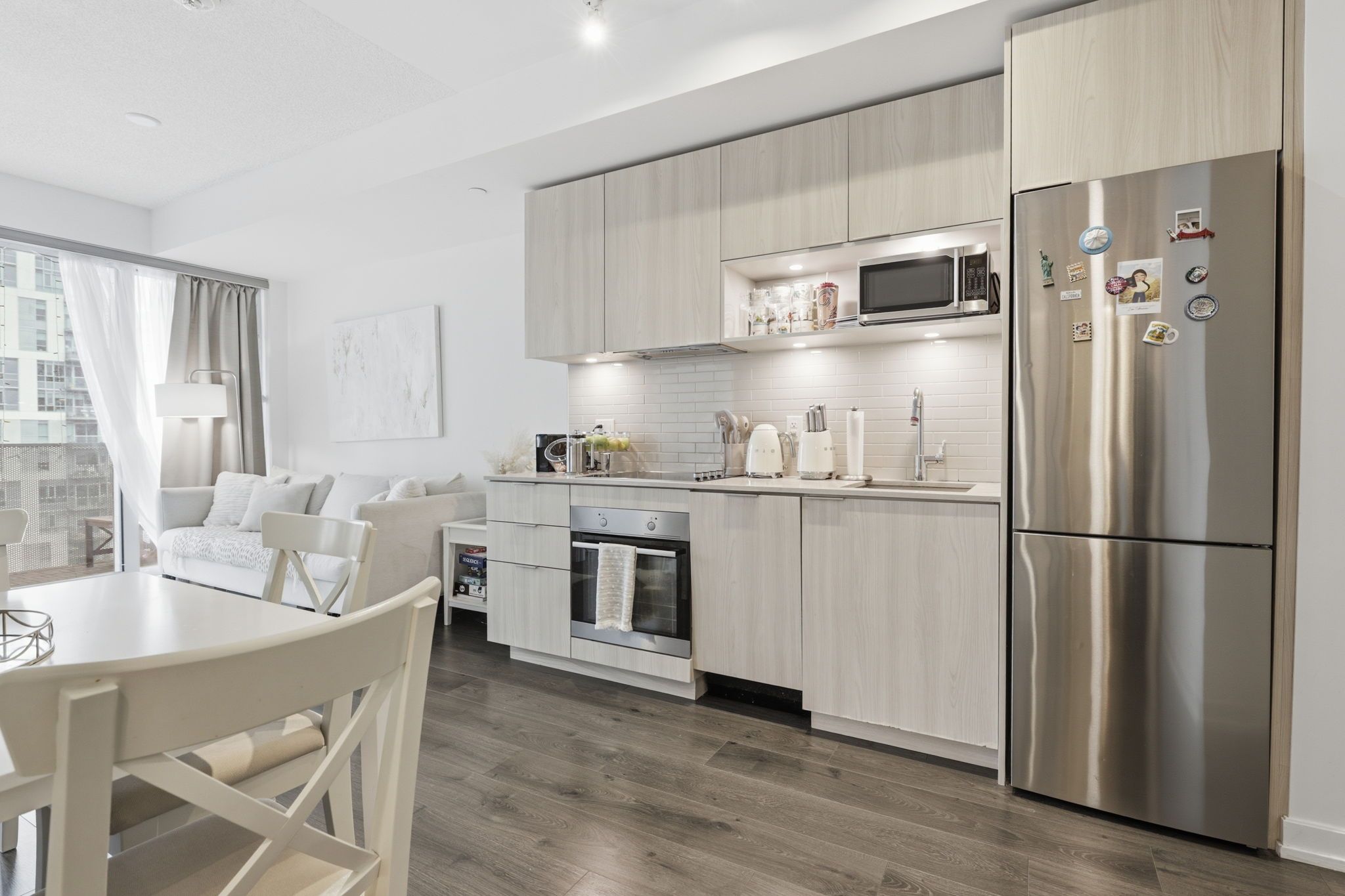 Located in the heart of regent park - one of downtown toronto's most dynamic and growing neighbourhoods-this bright and modern 1-bedroom suite at the wyatt condominiums, built by daniels, offers a thoughtfully designed open-concept layout that maximizes space and functionality. Floor-to-ceiling windows bring in abundant natural light, creating an airy feel throughout. The sleek contemporary kitchen features stainless steel and built-in appliances, ample storage, and flows seamlessly into the living and dining area. Step out onto the large private balcony with southeast views, providing a comfortable outdoor retreat. The suite also includes custom roller blinds and a convenient storage locker. Residents enjoy an exceptional range of amenities, including a fully equipped fitness centre, rock climbing wall, sports and recreation facilities, theatre room, craft room, study and co-working spaces, guest suites, outdoor bbq area, visitor's parking and a rooftop terrace with panoramic views. With ttc at your doorstep and just minutes to the dvp, toronto metropolitan university, university of toronto, eaton centre, parks, restaurants, groceries, the distillery district, and st. Lawrence market, this is an excellent opportunity for first-time buyers, investors, or those seeking stylish and convenient downtown living.