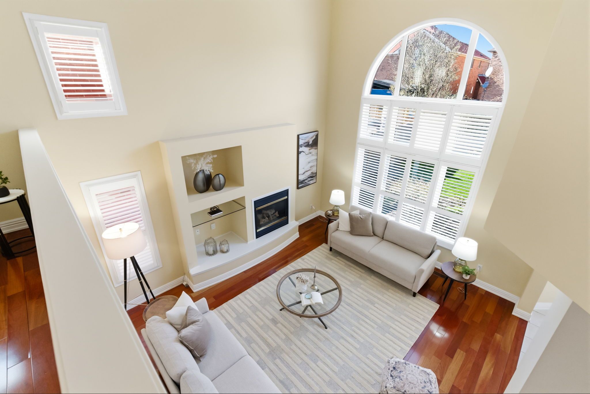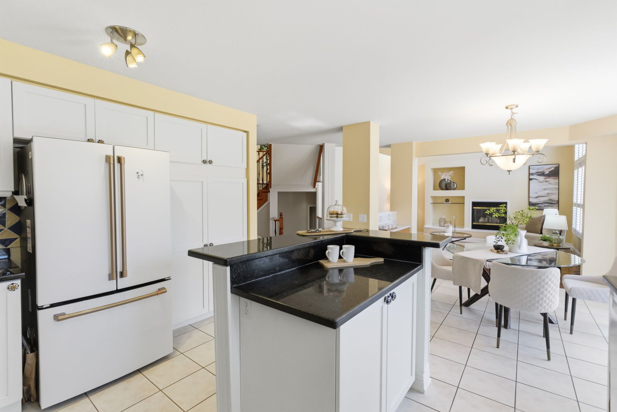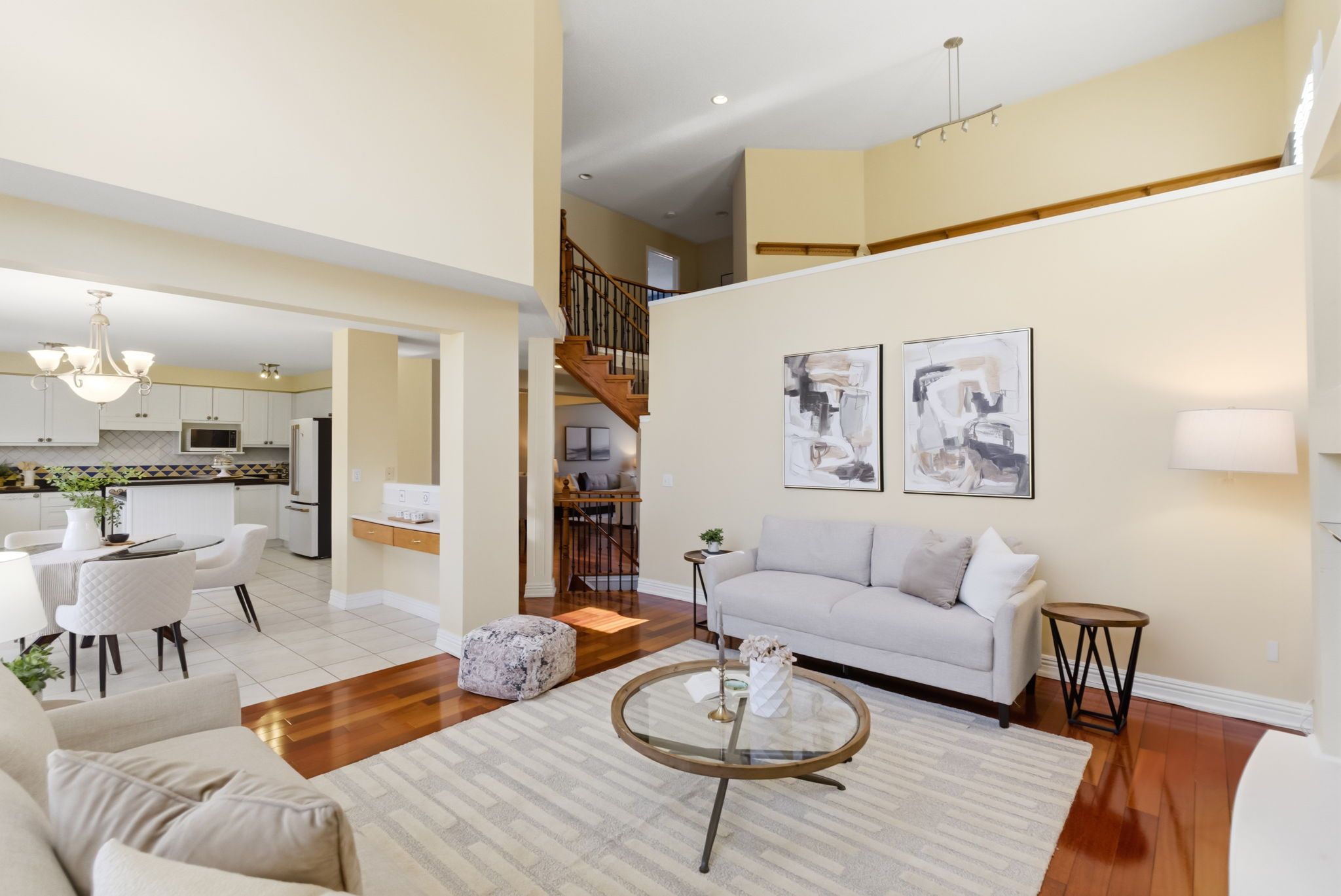 • Cozy family room with high ceilings and a warm fireplace.