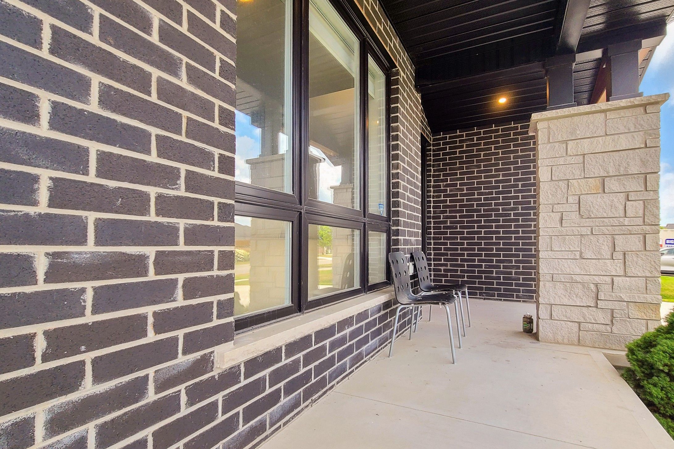 • Stylish home with a mix of brick, wood-tone siding, and stone.