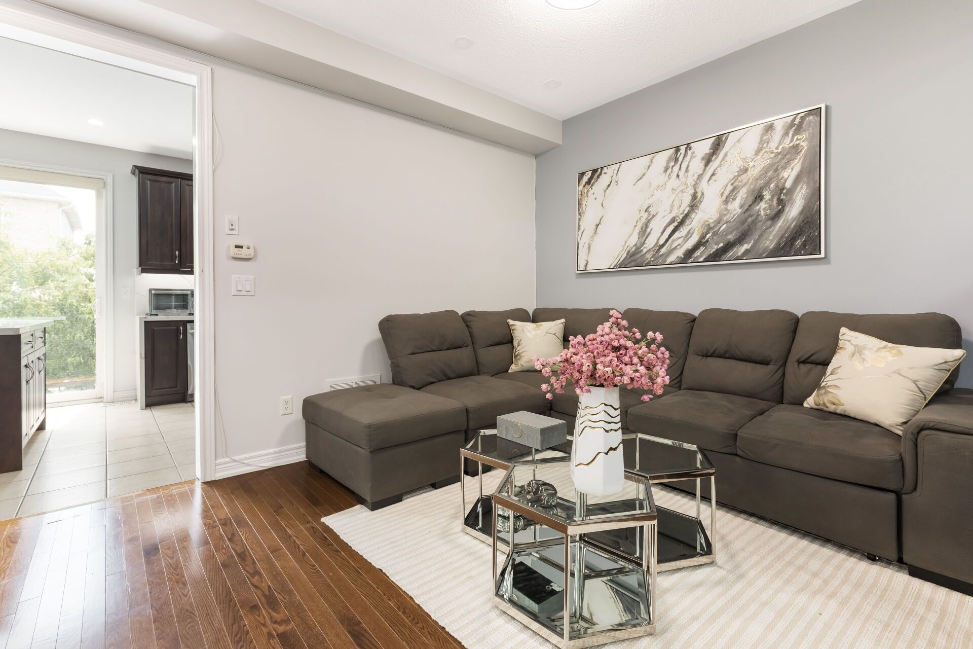 • Modern kitchen features quartz countertops, gas stove, and large island.