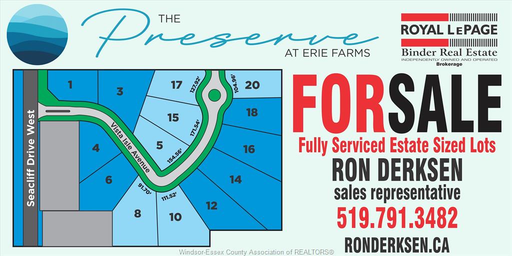 Welcome to "the preserve" at erie farms, an upscale subdivision featuring estate-sized lots offering breathtaking views of lake erie, beautiful sunsets, including pelee island views and located just south and west of seacliff drive west and fraser road in leamington ontario. The fully serviced "one of a kind" subdivision featuring street lights, sidewalks. Sanitary and storm water drainage, all utilities, mail, lake views. Easy access to walking and biking trails is an absolutely stunning development with municipal of leamington building permits available for february 11/2026.