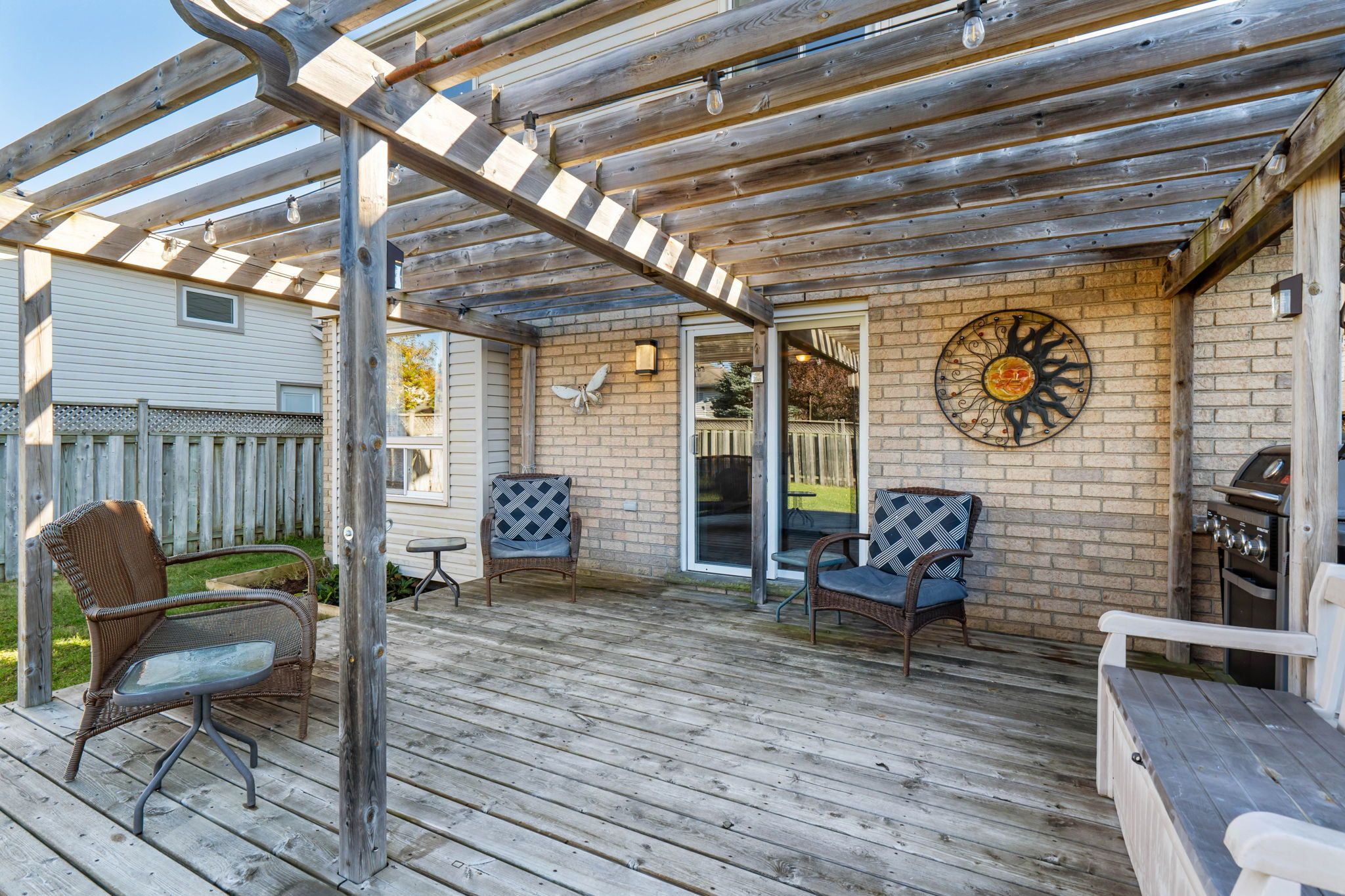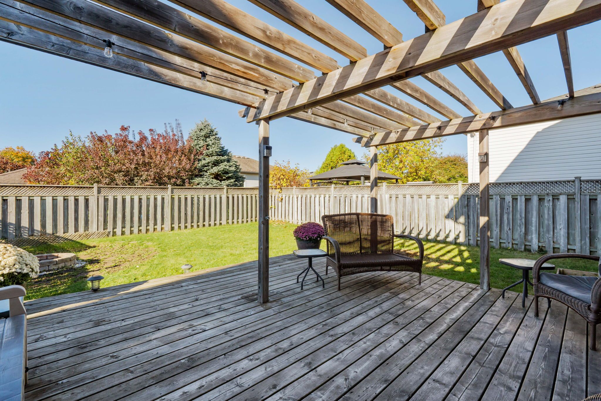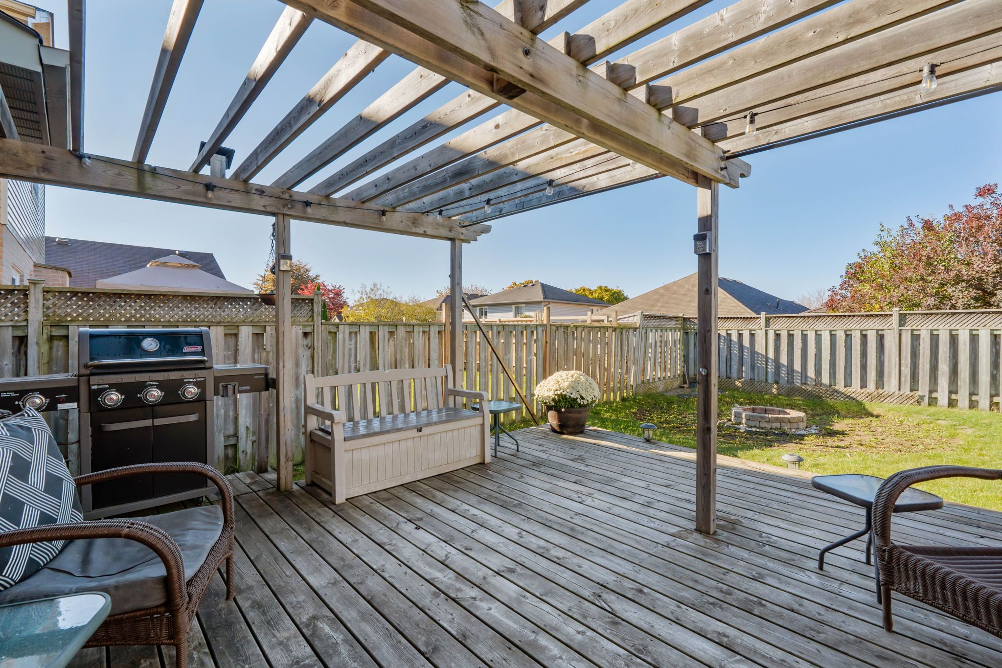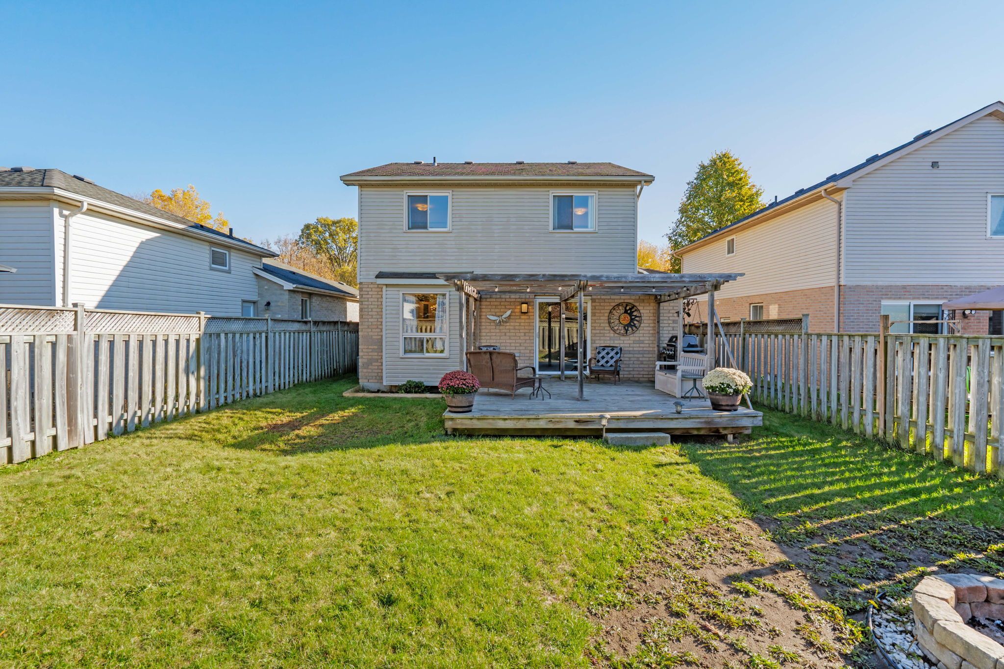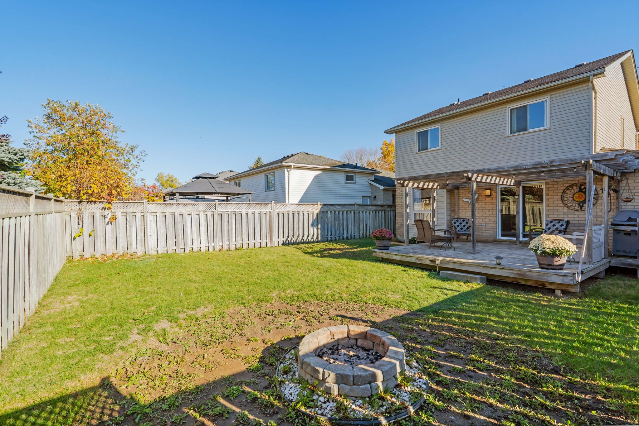 • Large fenced backyard with a deck and fire pit for outdoor fun.