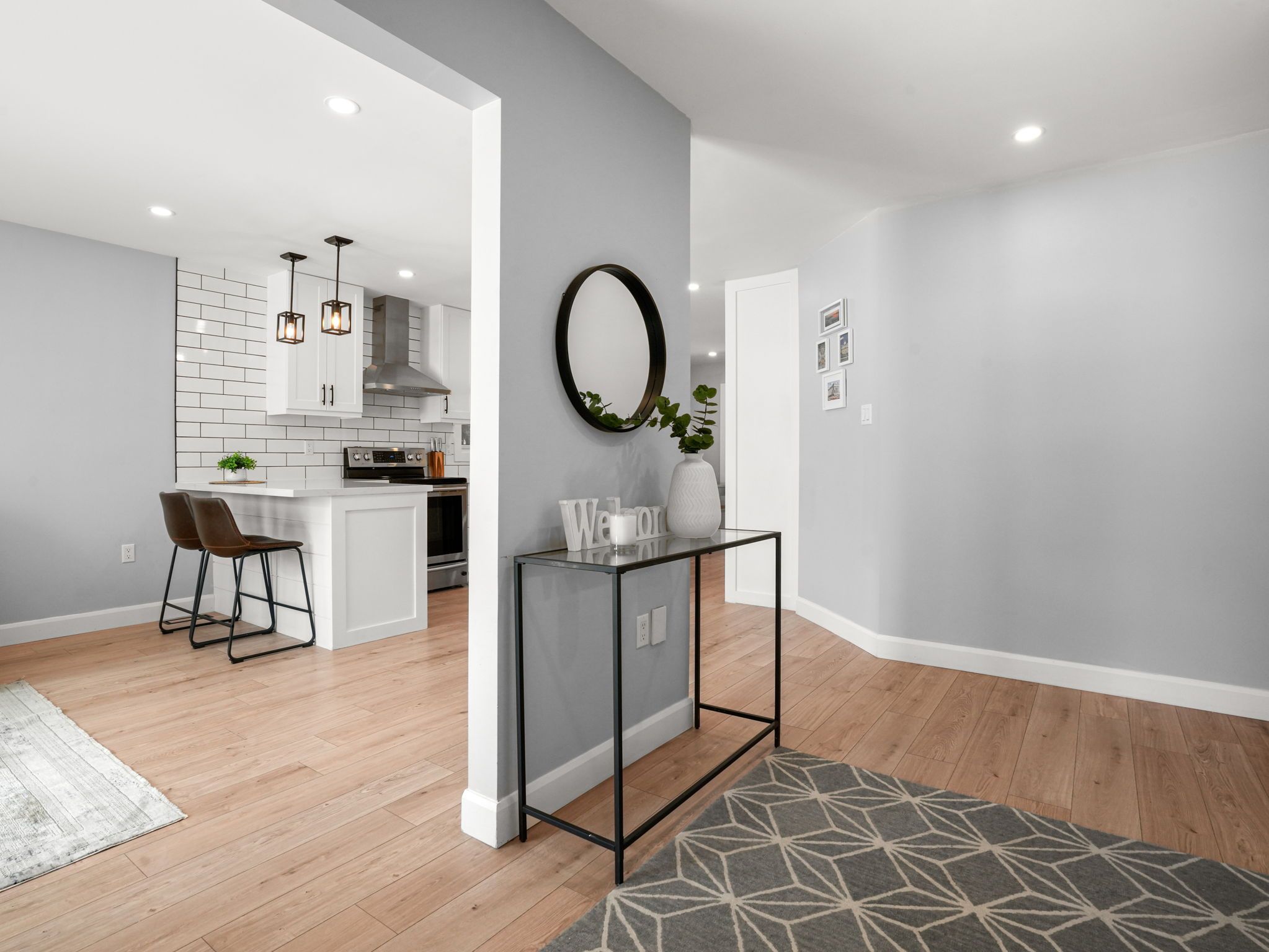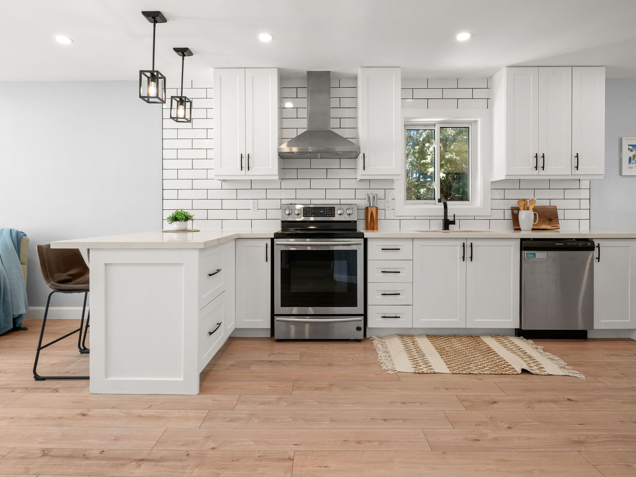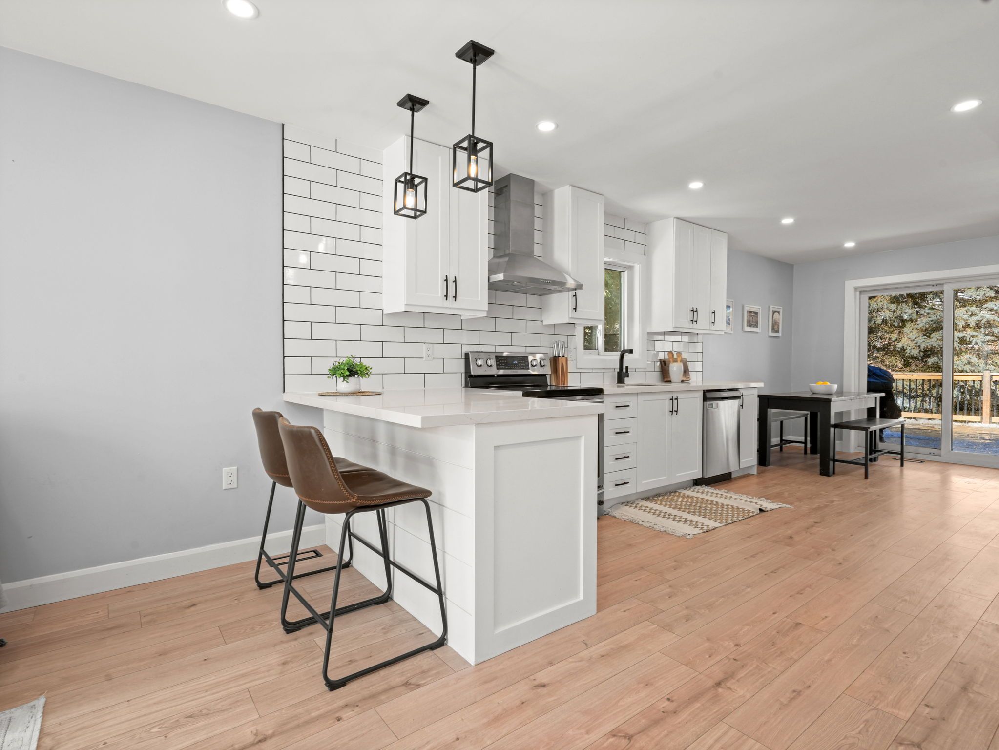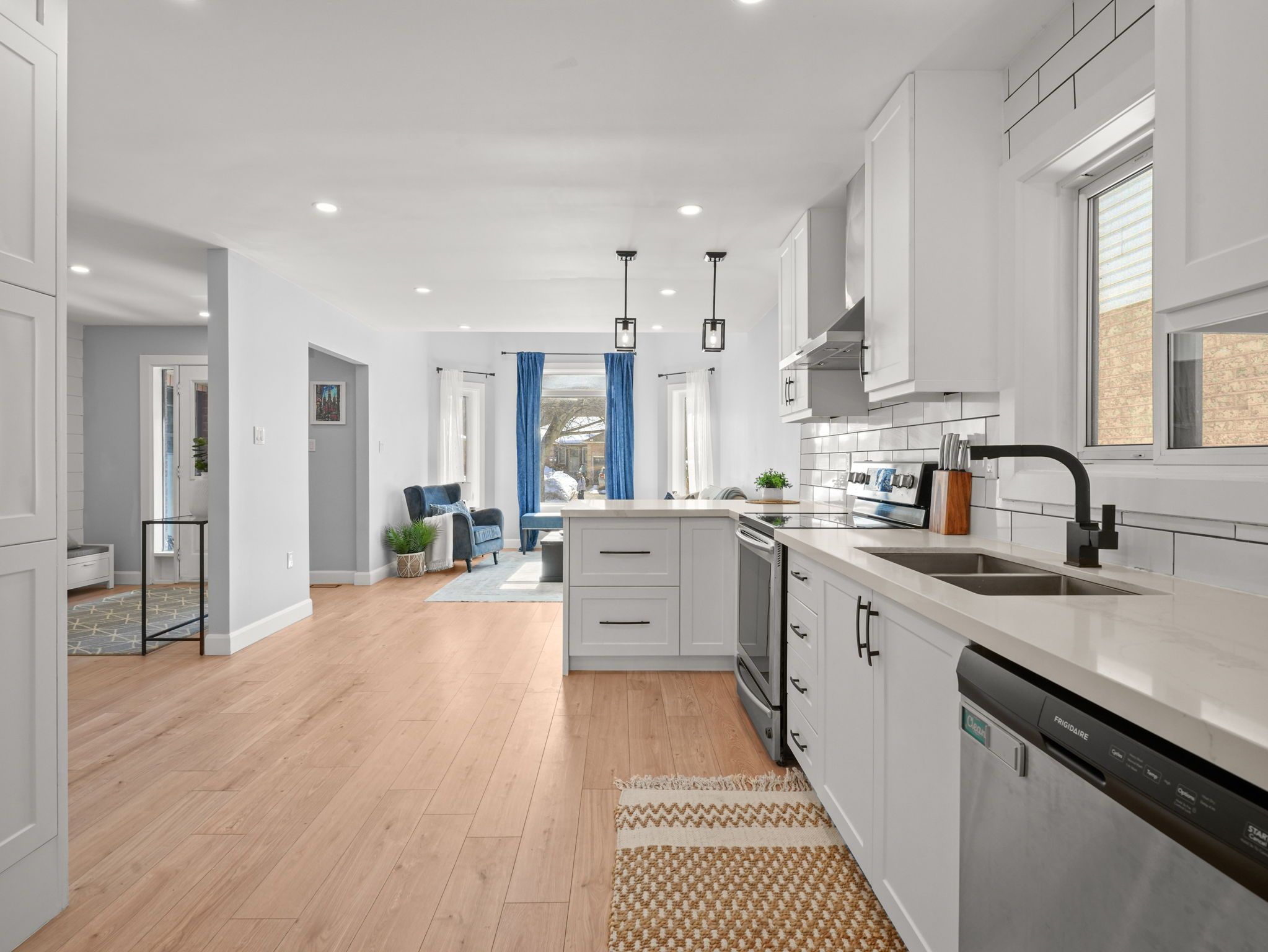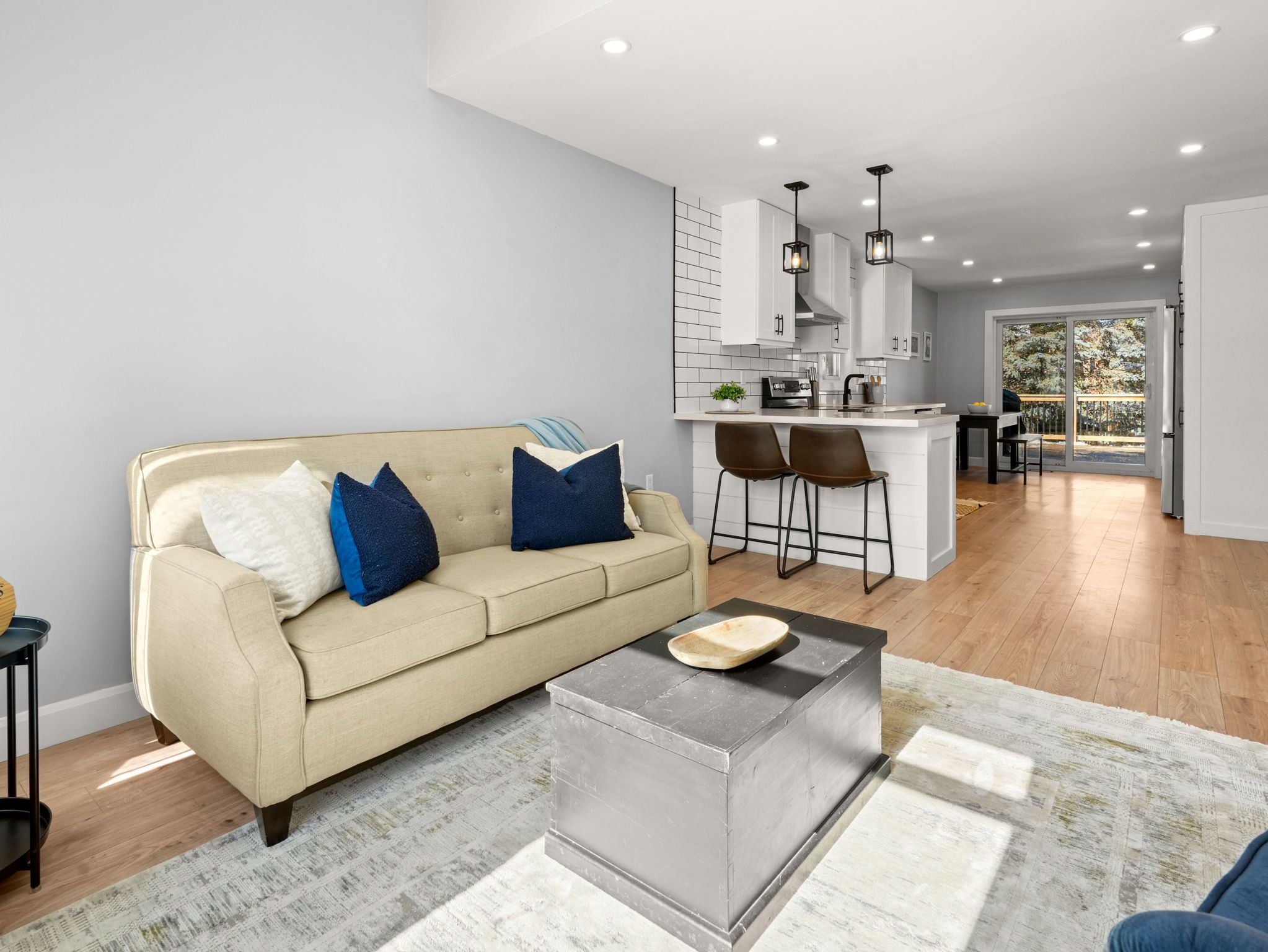 • Modern open concept kitchen overlooking the cozy living room.