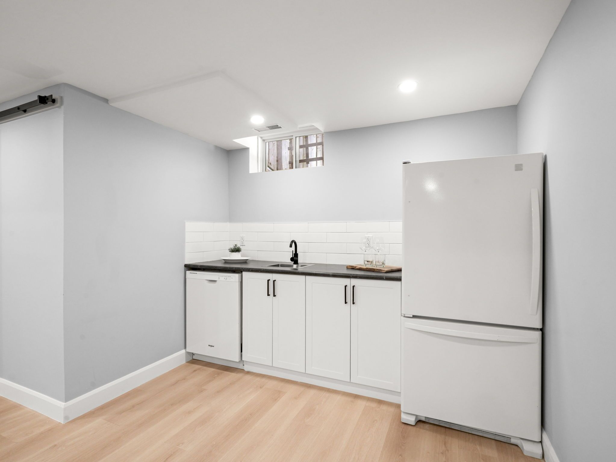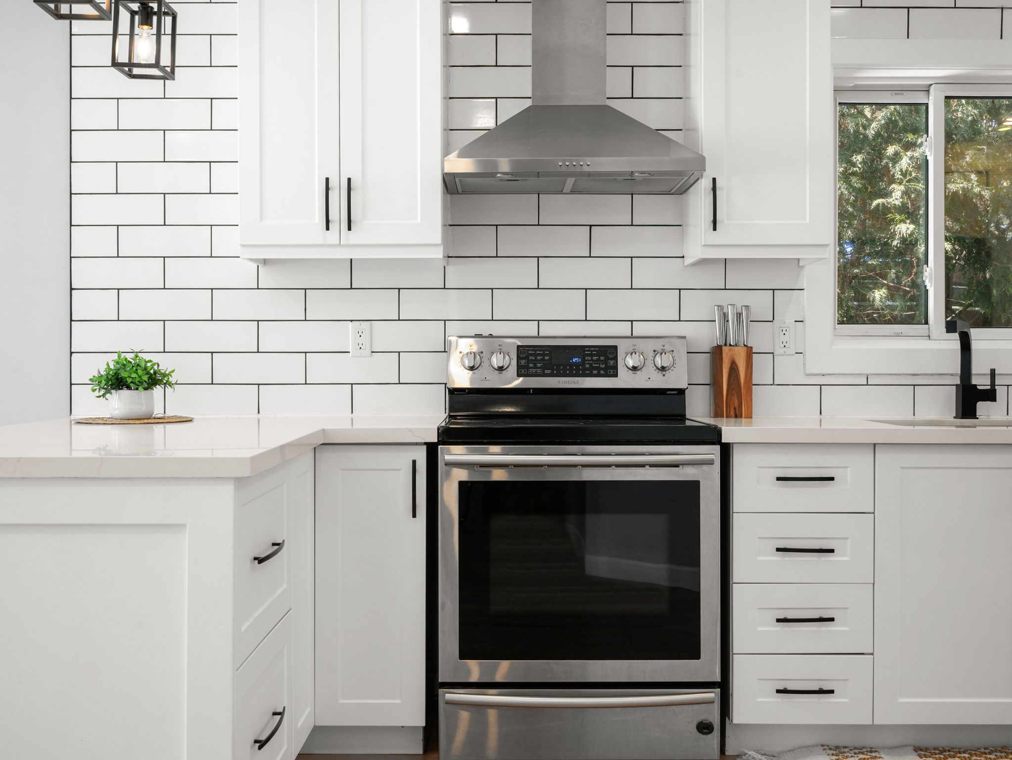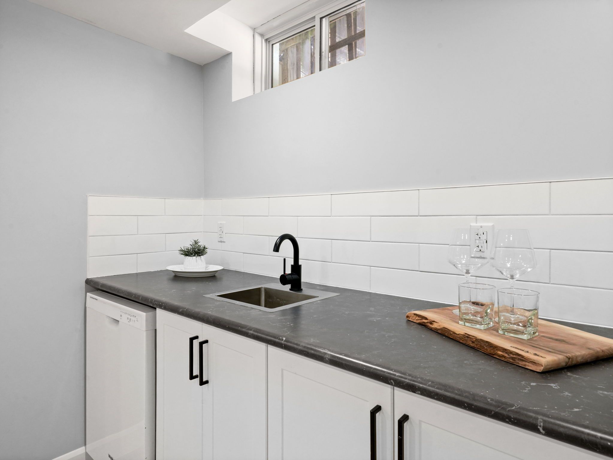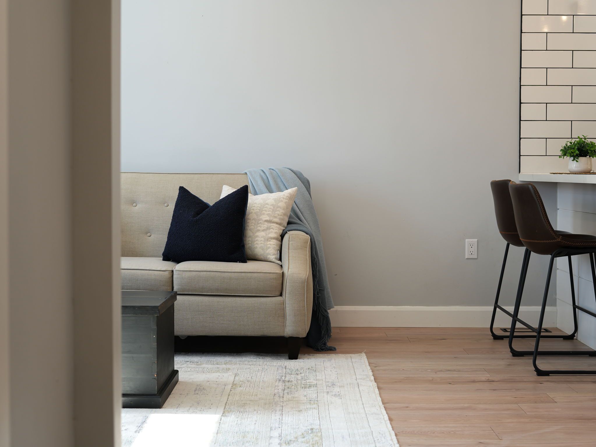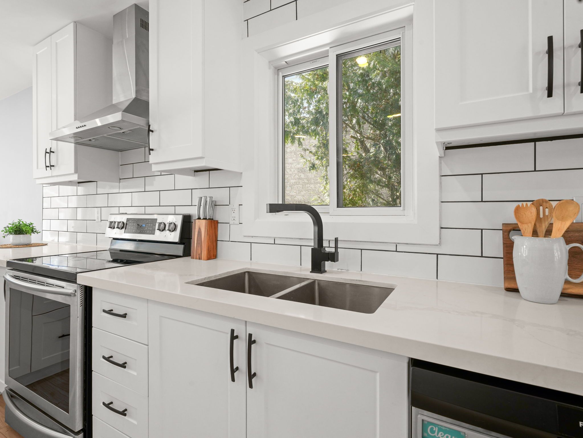 • Modern open concept kitchen overlooking the cozy living room.