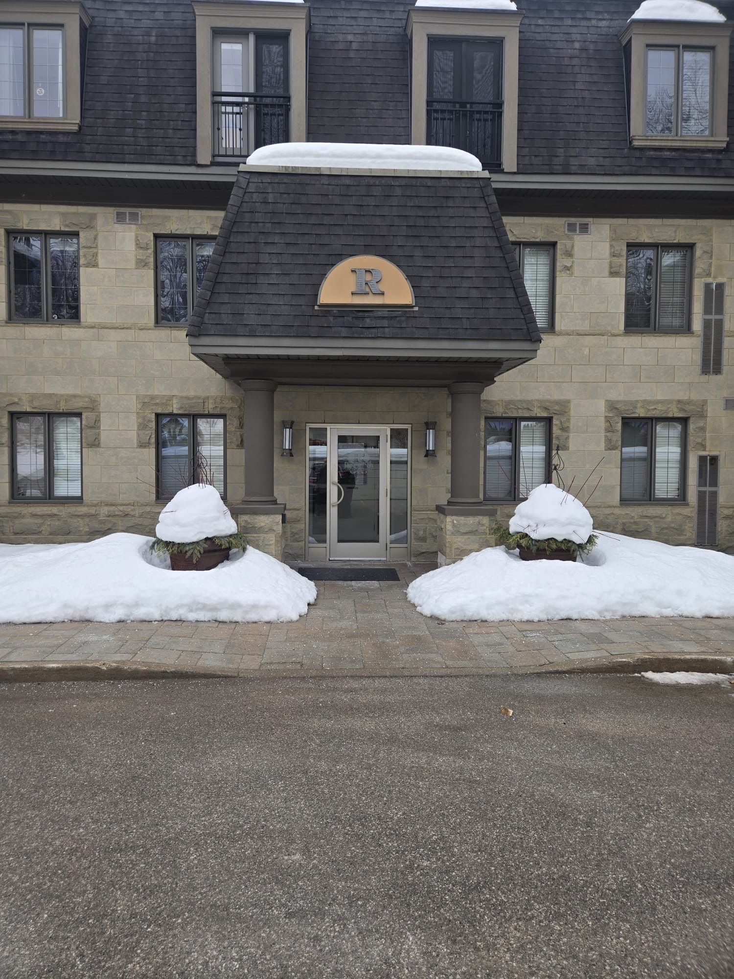 Discover the epitome of luxury living at "the roxborough" condos in downtown barrie! One of barrie's most stunning works of architecture. This elegant 3-story stone building is surrounded by lush gardens, a private gazebo, and an outdoor dining space. Inside this 2-bedroom second floor unit, you'll find a balcony overlooking the gardens, an open-concept kitchen, dining, and living area, as well as in-suite laundry. This sun filled unit offers great space with an open concept kitchen/living room combo. A large master with two closets and a work space looking out over the gardens. Other features include hardwood floors (no carpet), crown mouldings and a fire place. The building features underground parking, a party room, a guest suite, and visitor parking. Enjoy a hassle-free lifestyle just steps from the waterfront and downtown barrie's vibrant amenities restaurants, shopping, theatres, art galleries, festivals, and the renowned farmers' market. Units in this quiet, highly sought-after building are rarely available don't miss your chance! Recent updates include a new roof (2023), a new patio, and a new gazebo.