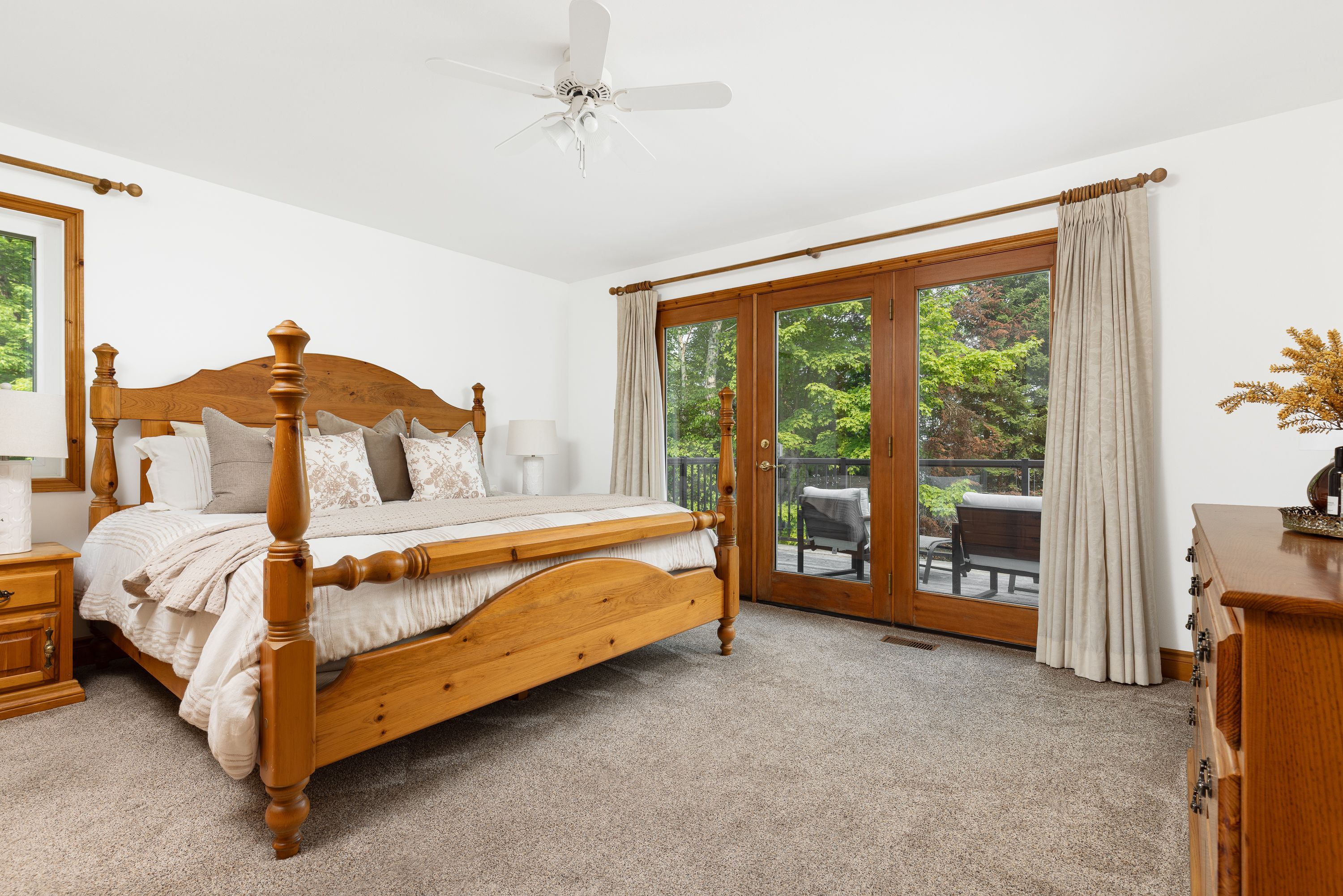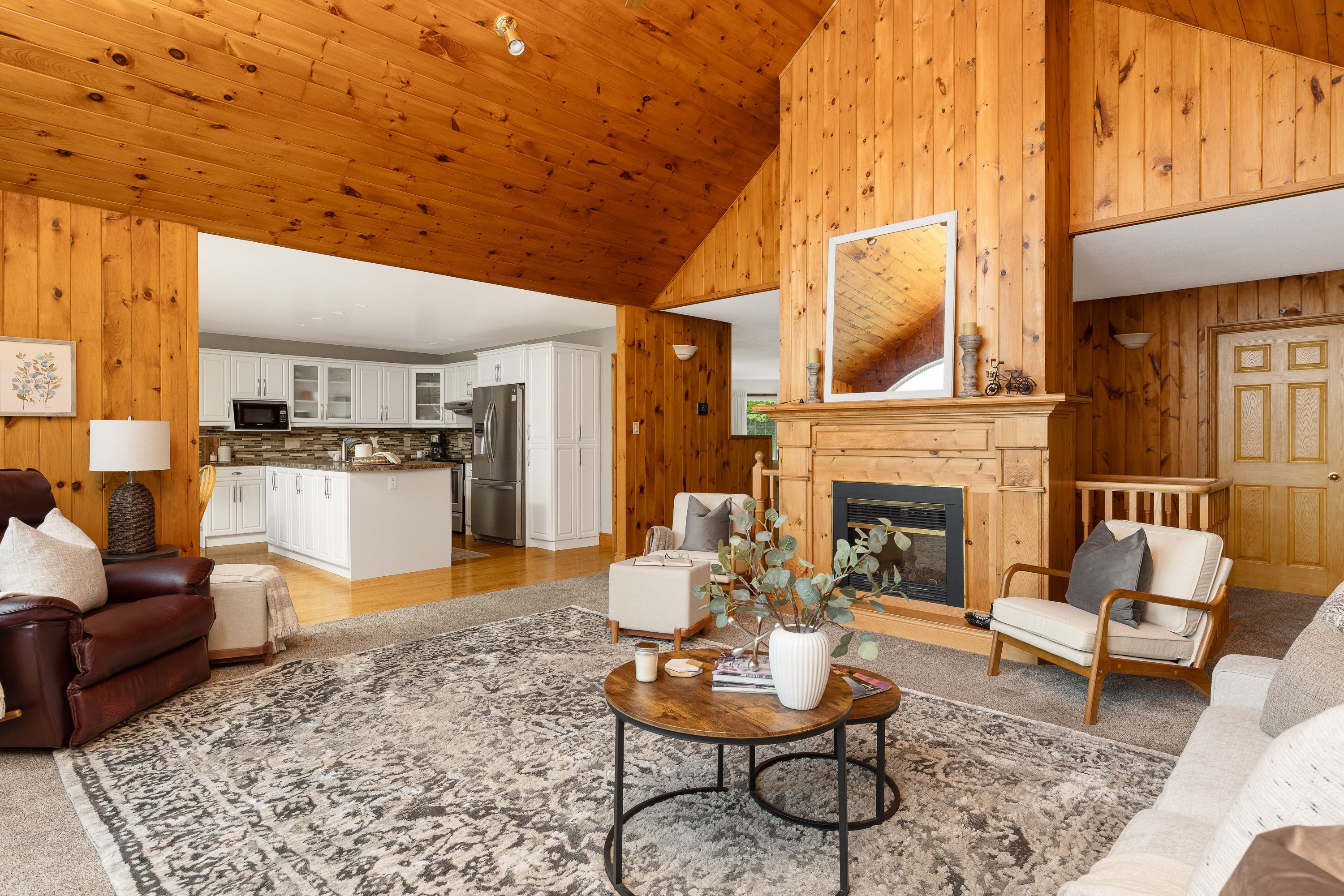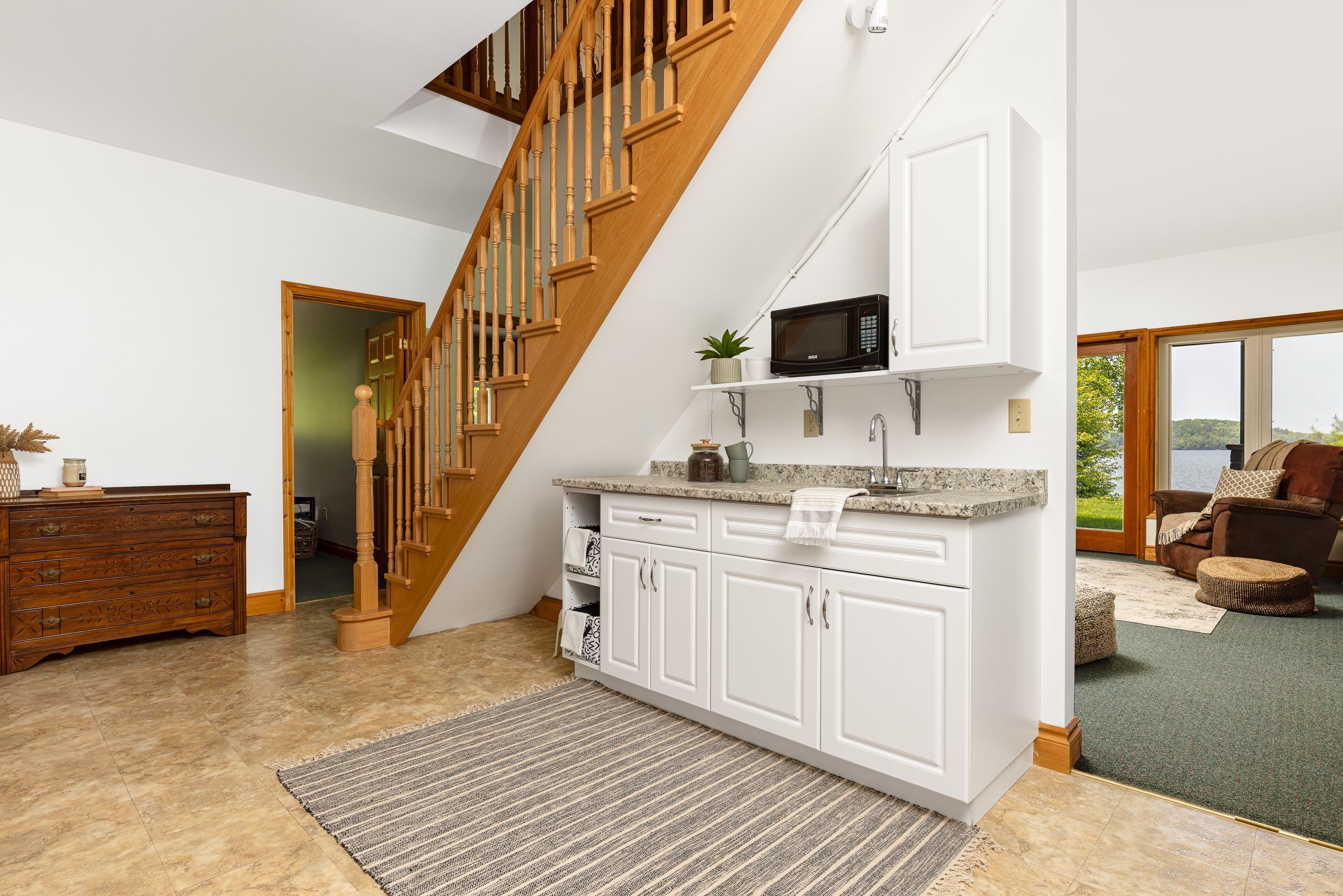• Spacious interior with vaulted ceilings and lakeside deck for relaxation.
