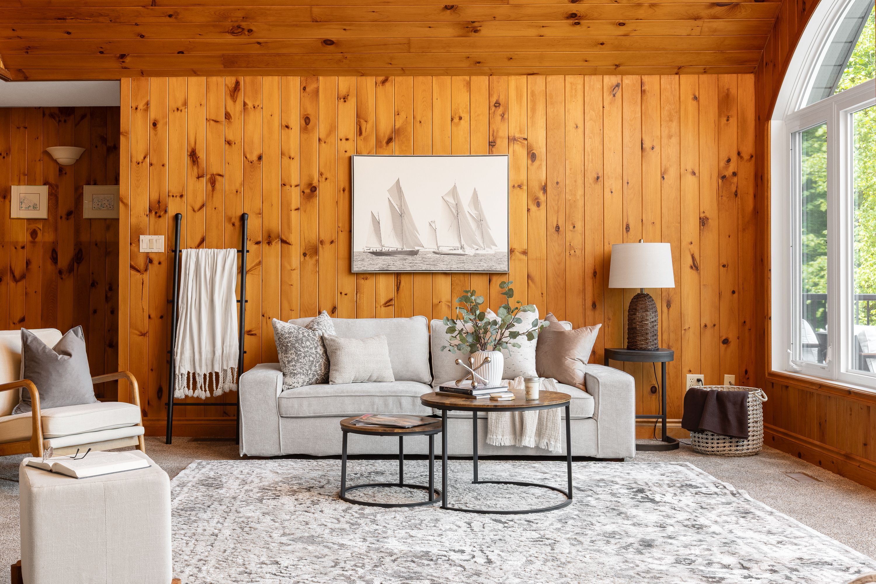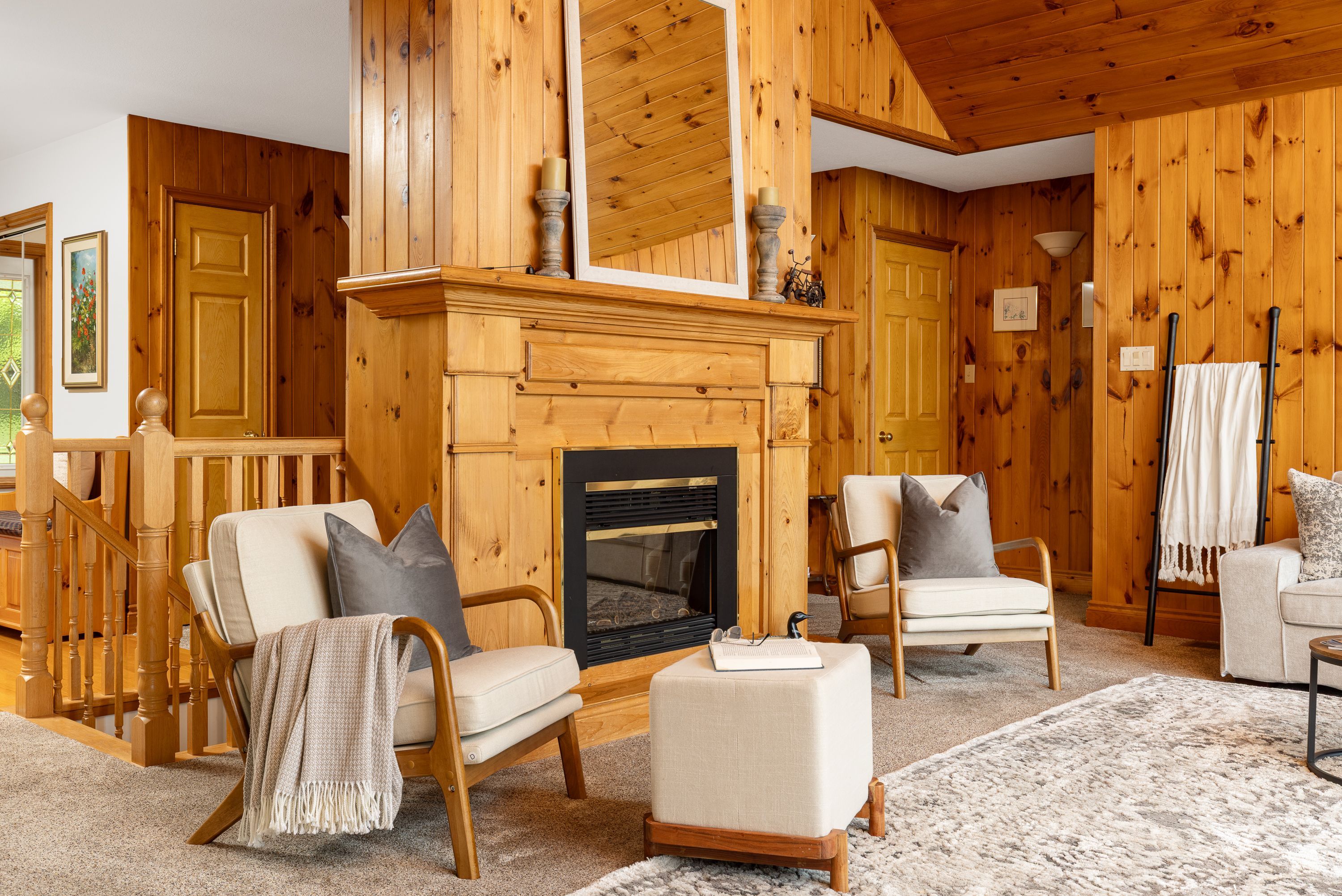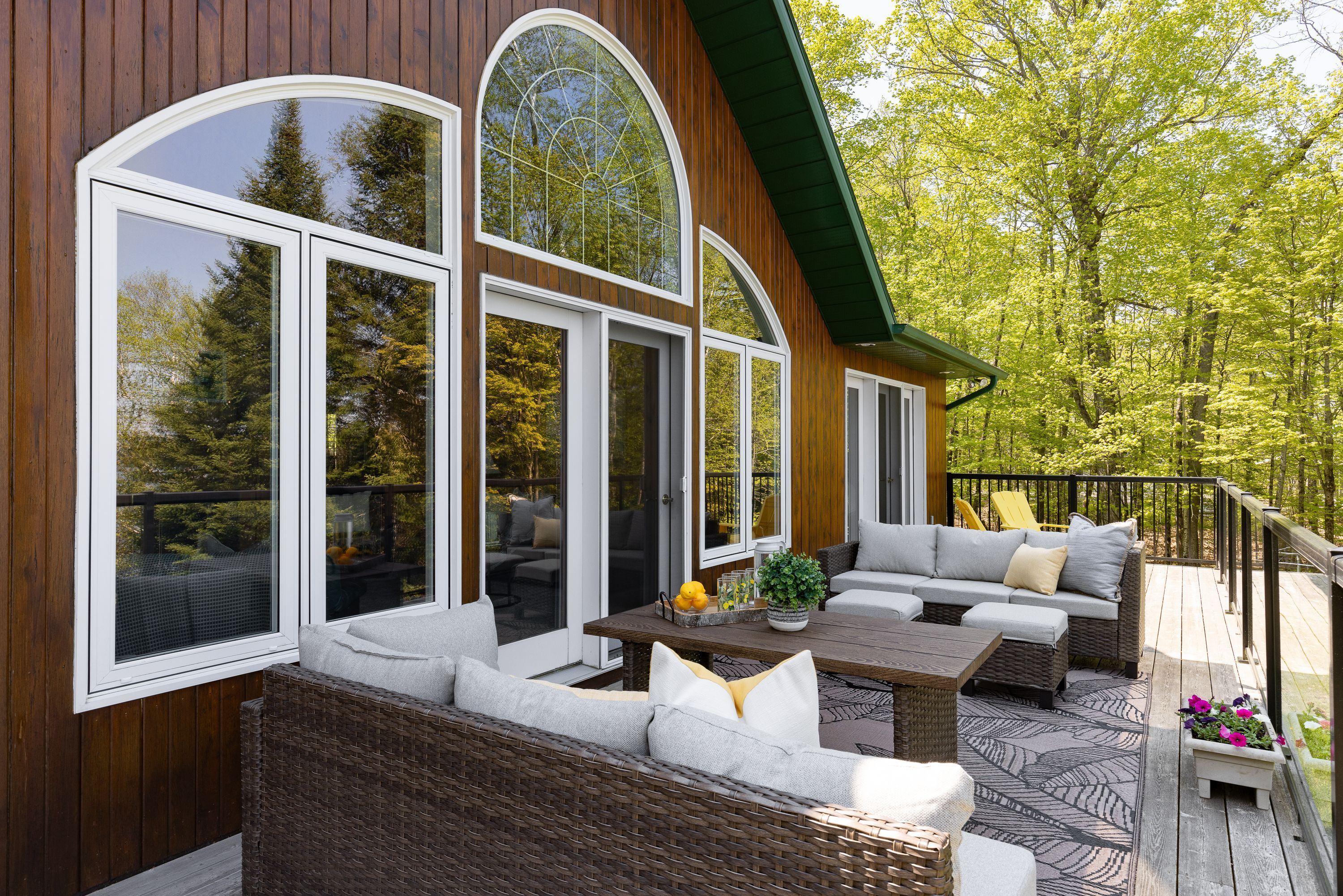 • Spacious interior with vaulted ceilings and lakeside deck for relaxation.