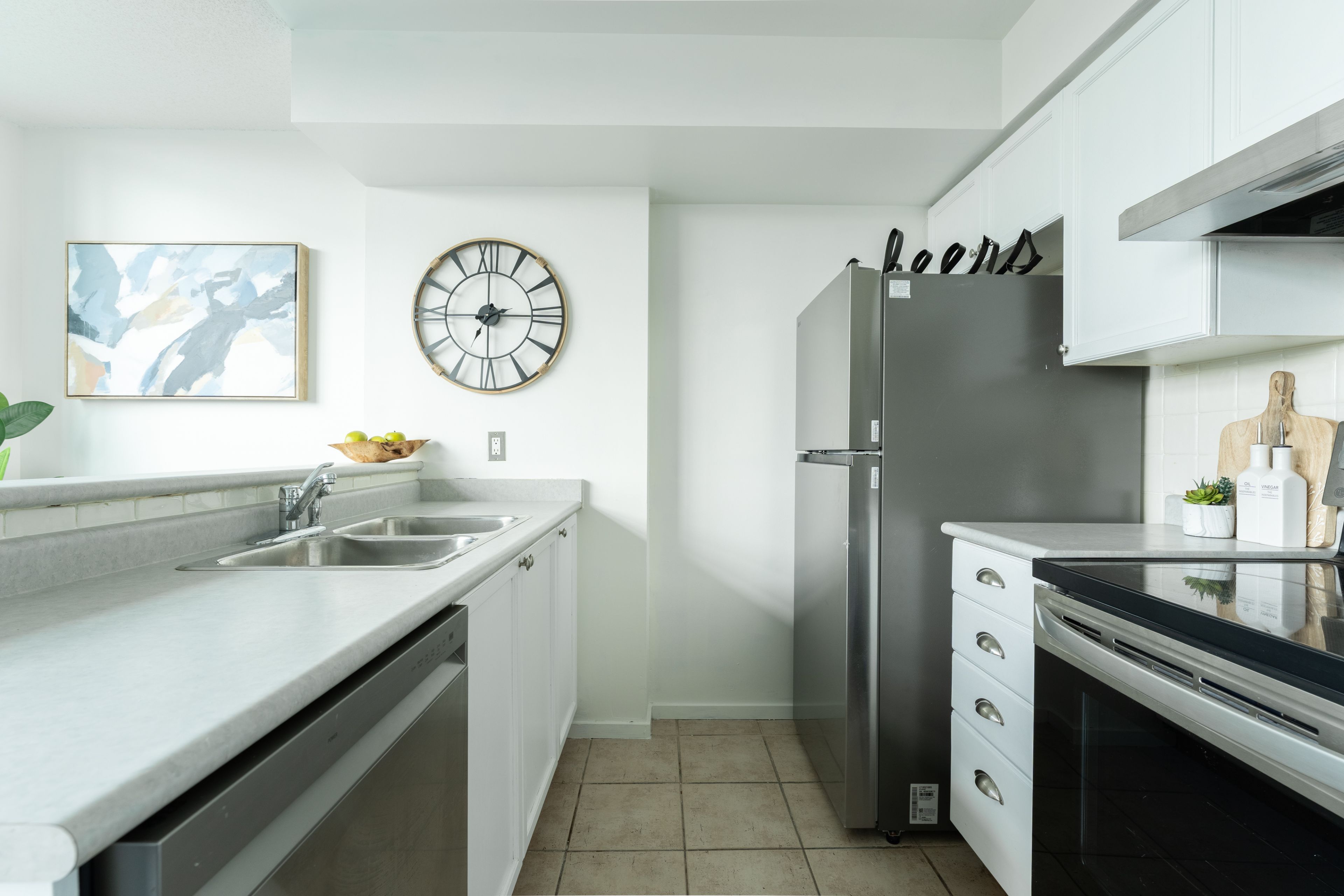 • New vinyl flooring and stainless steel appliances for modern living.