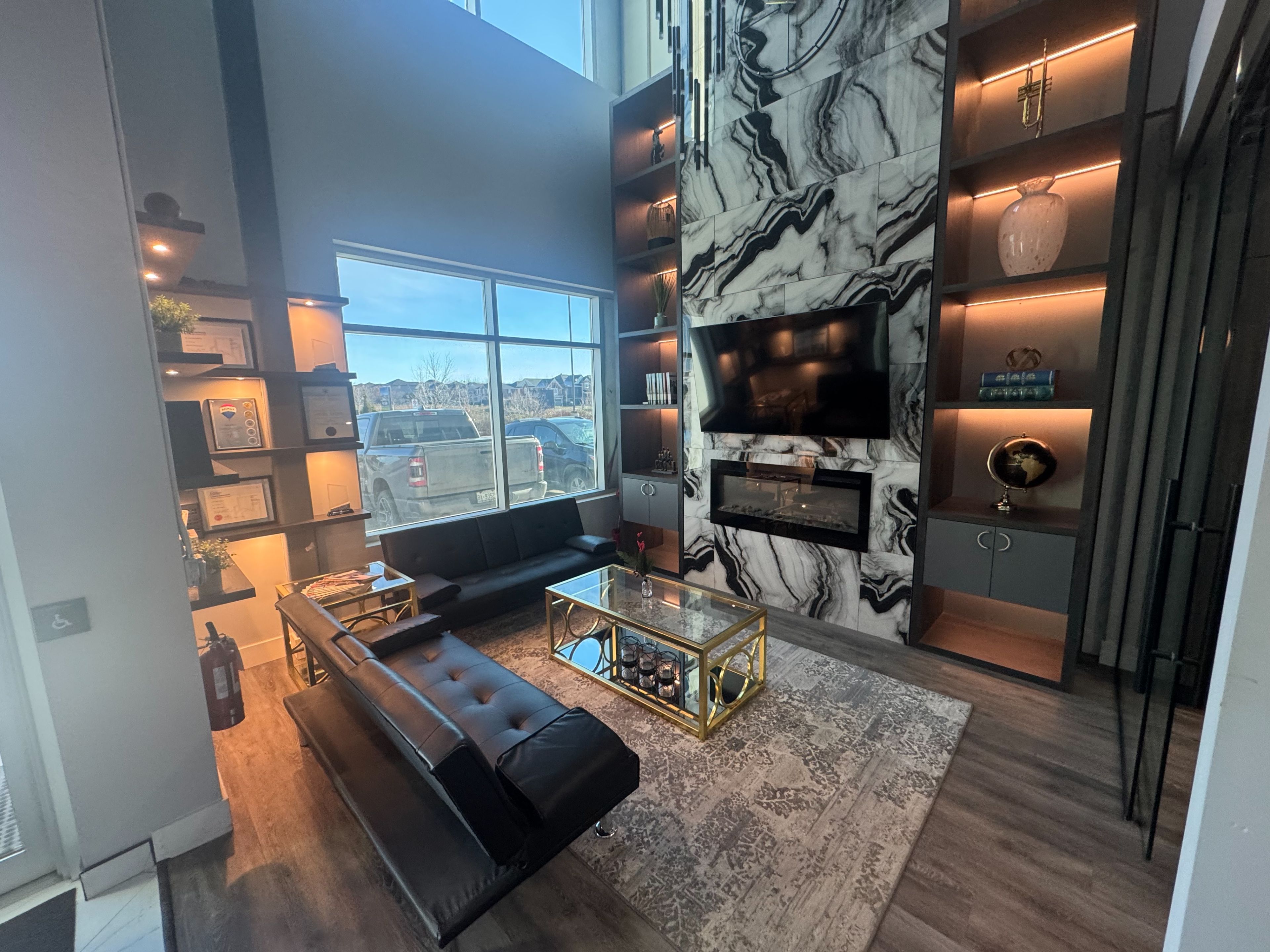 • Inviting front lounge with a contemporary fireplace for a warm atmosphere.