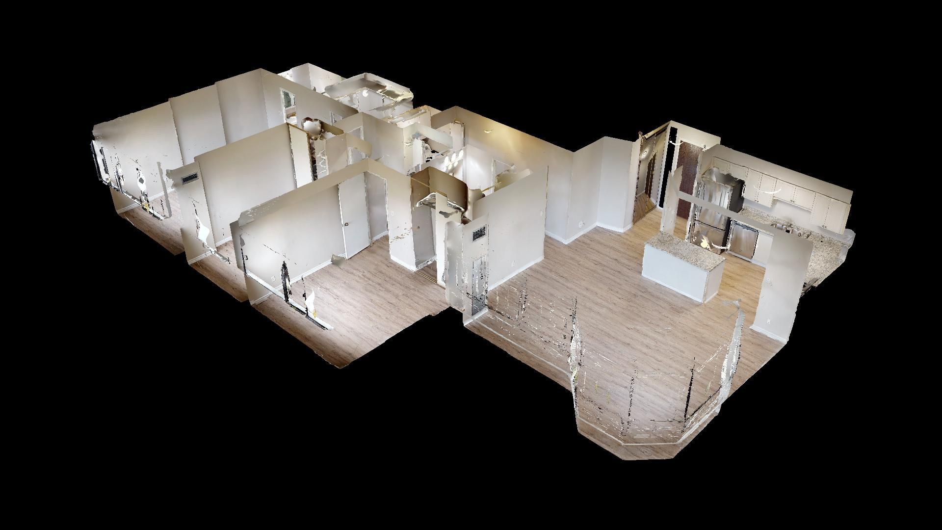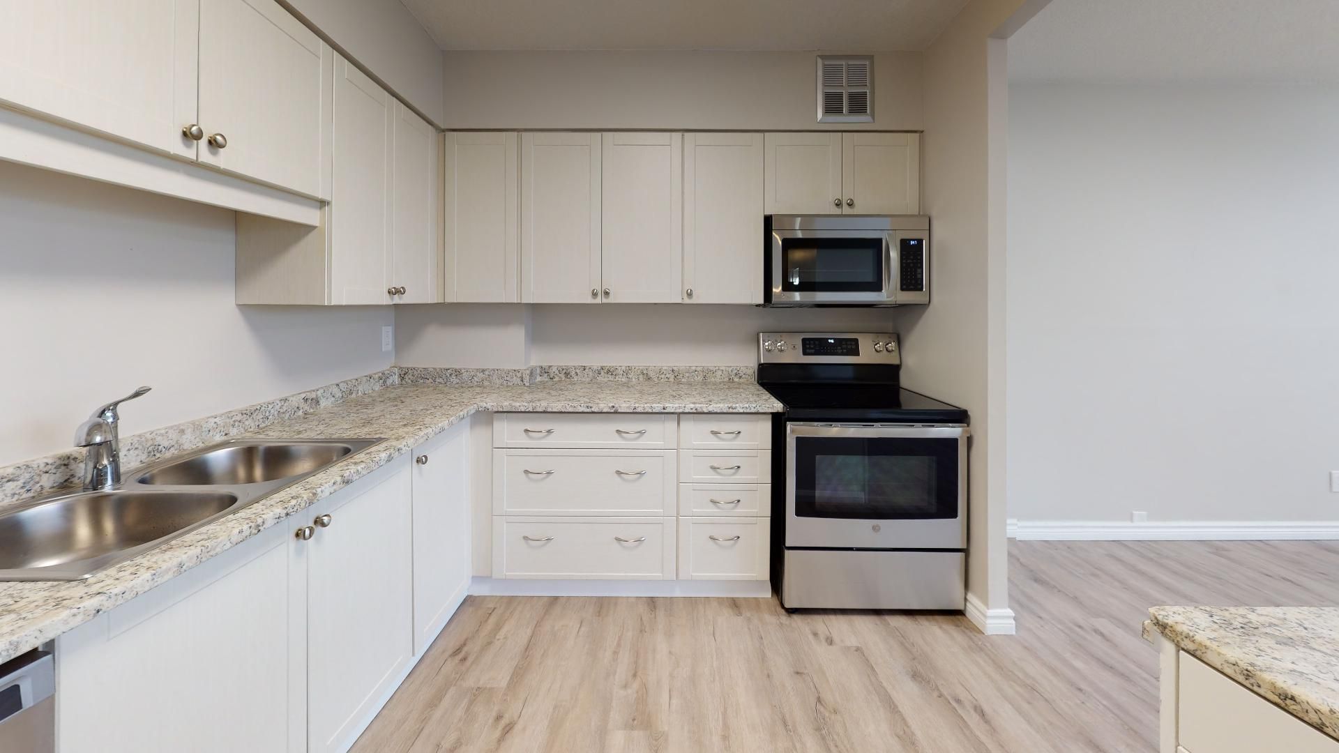 • Modern kitchen features stainless steel appliances and ample cabinetry.