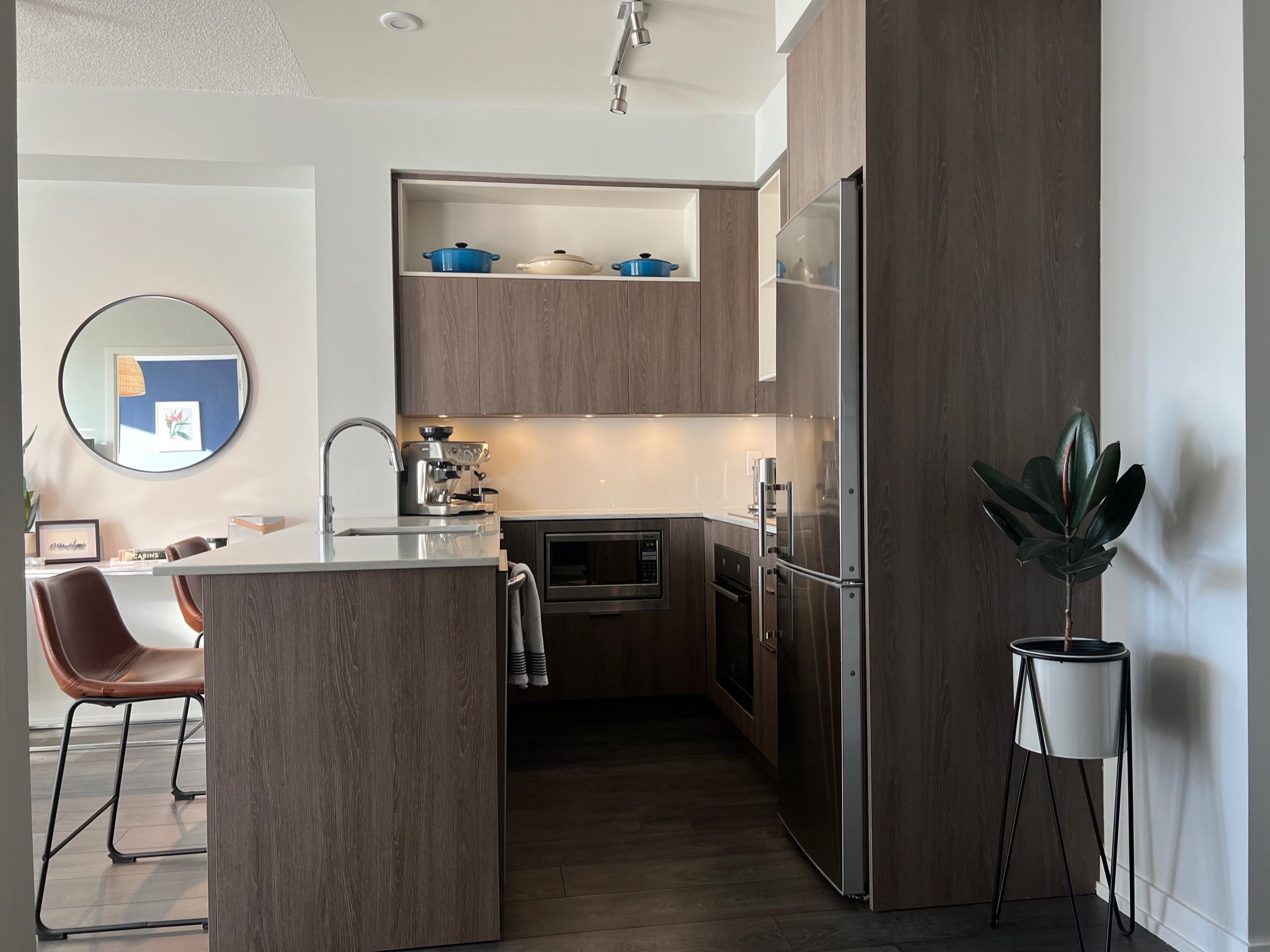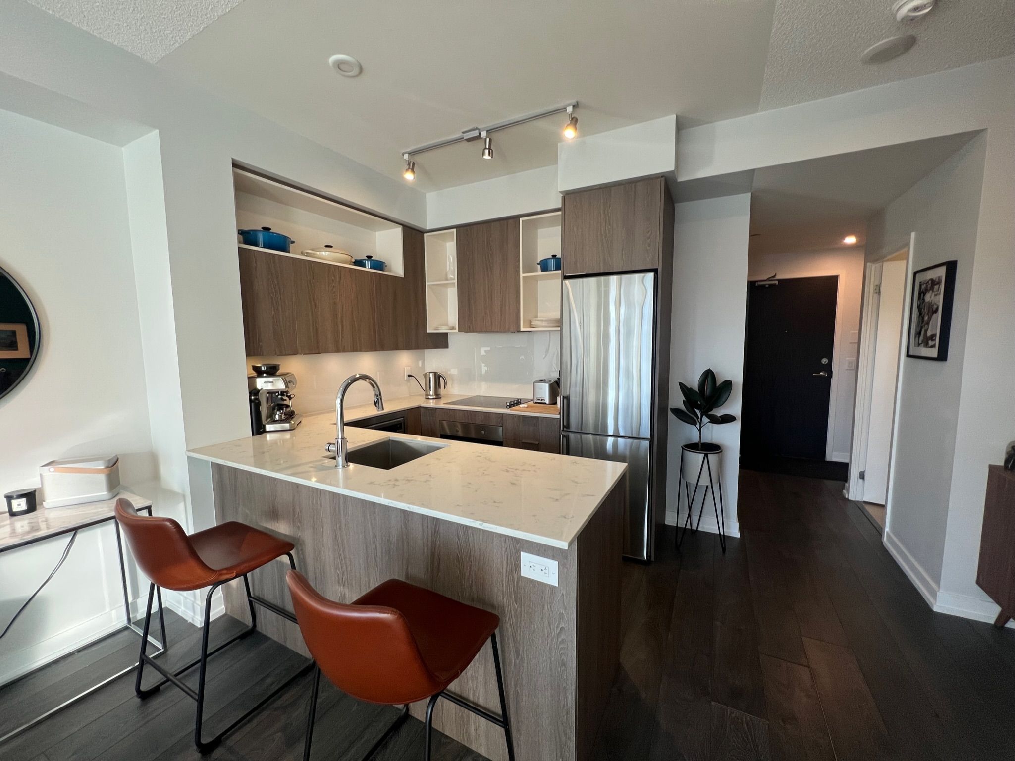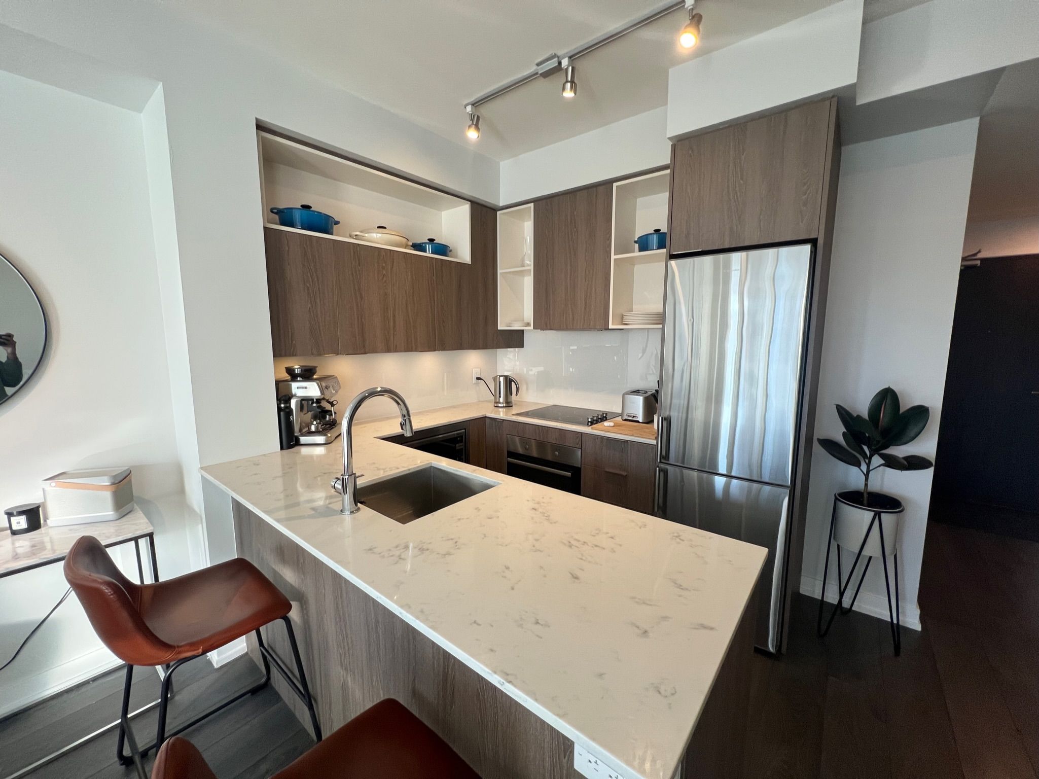 • Sleek finishes with quartz countertops and stainless steel appliances.