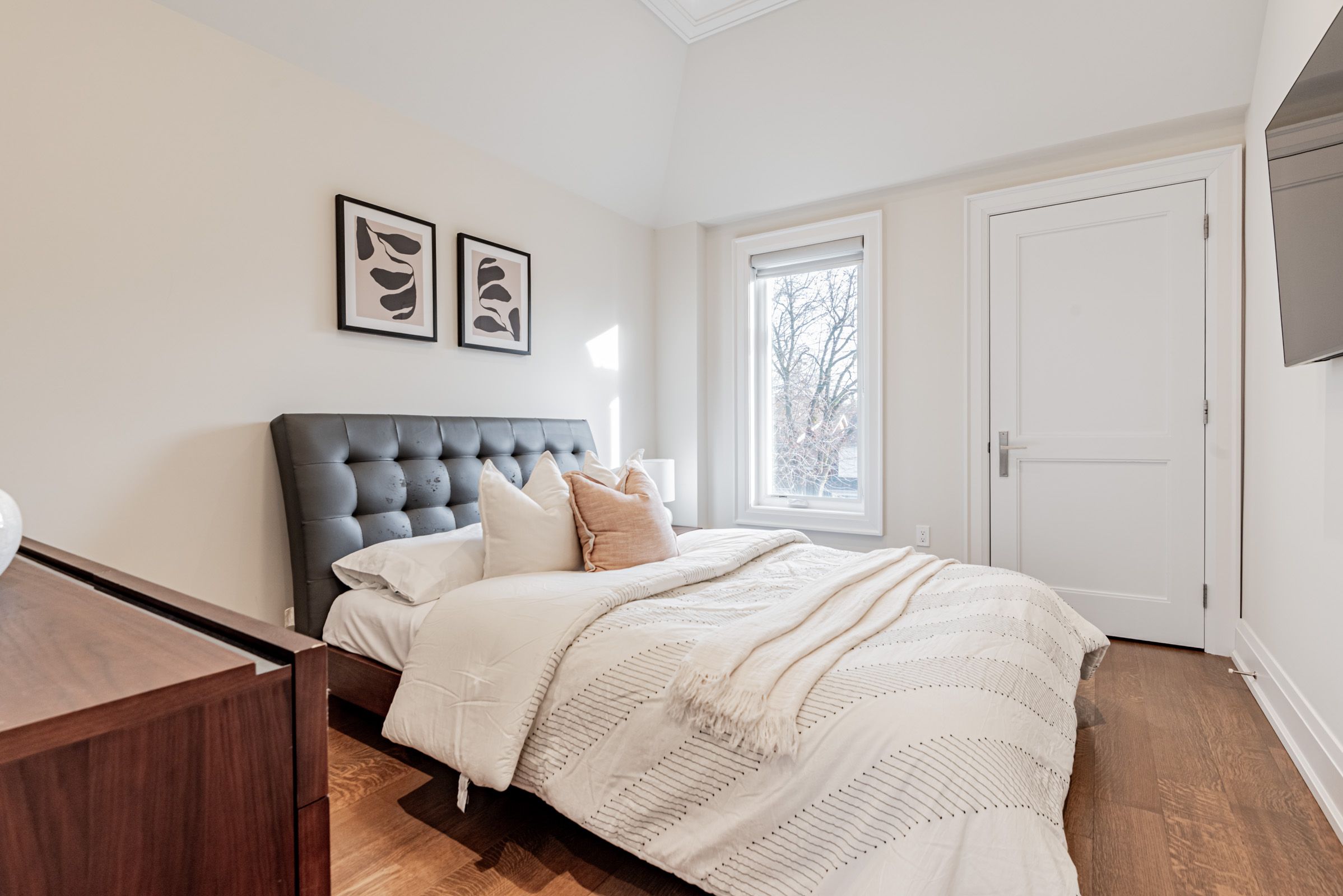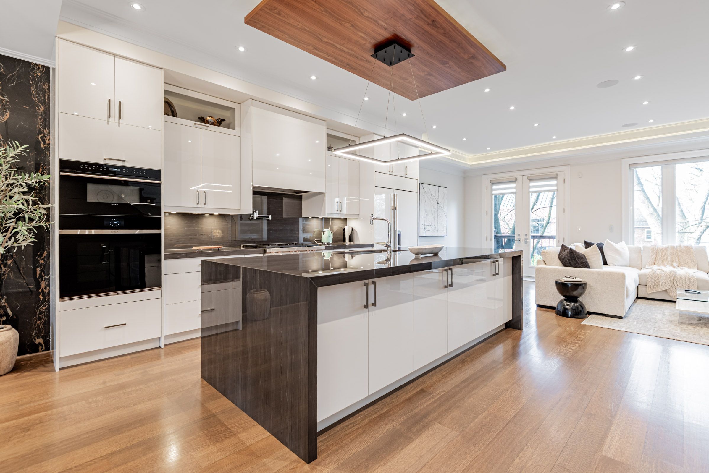• Exceptional craftsmanship with custom wood paneling and a walnut feature wall.