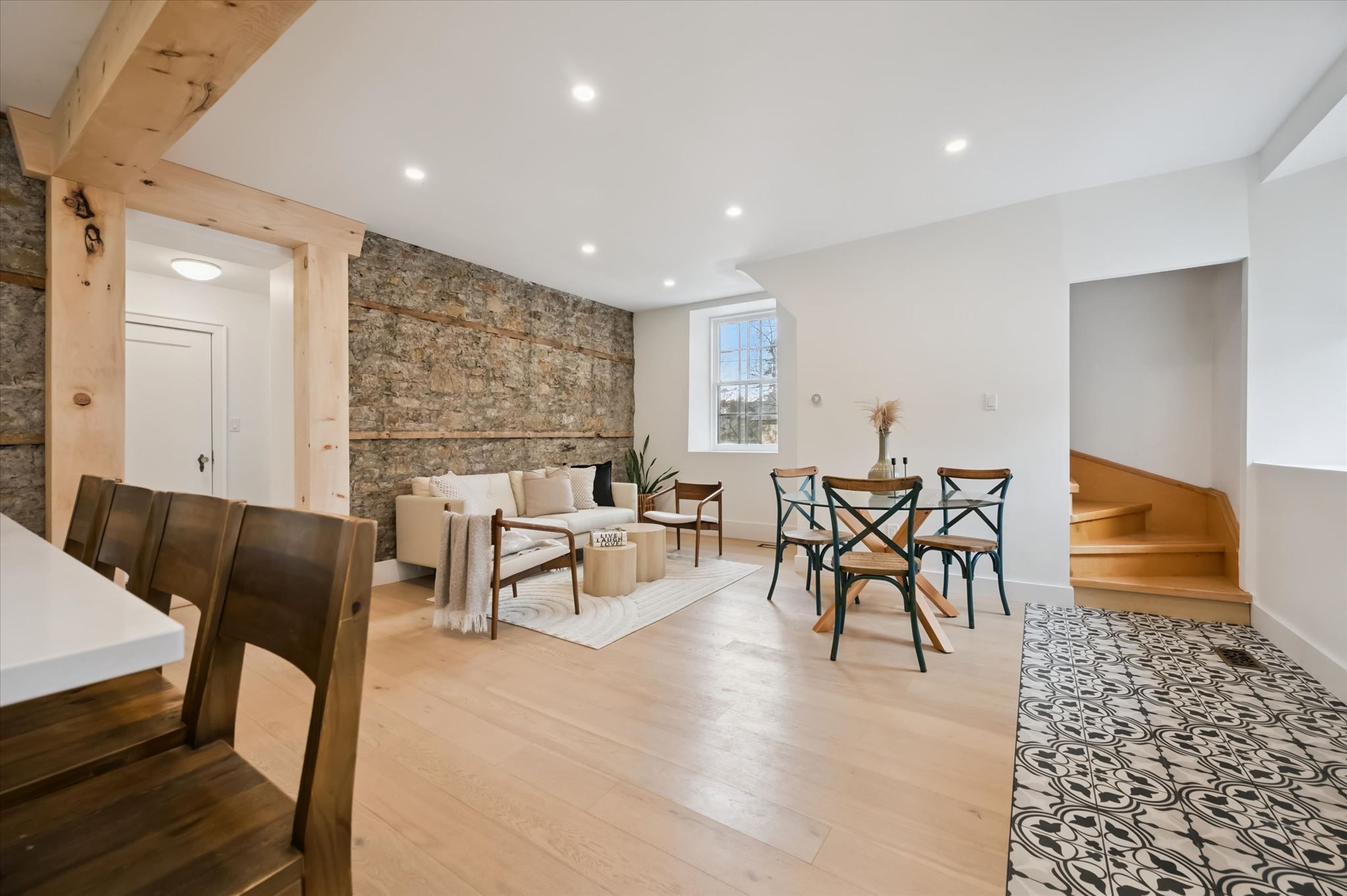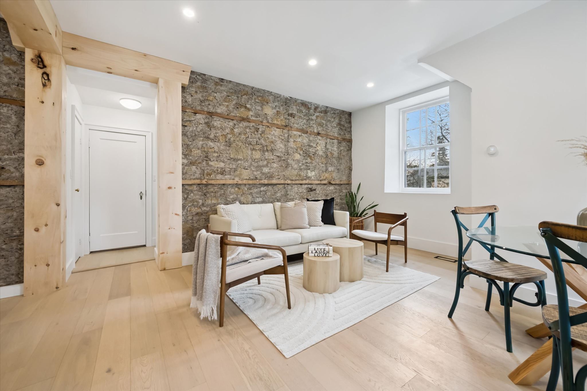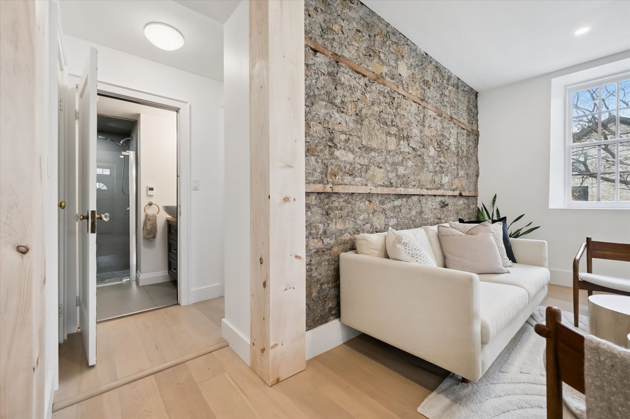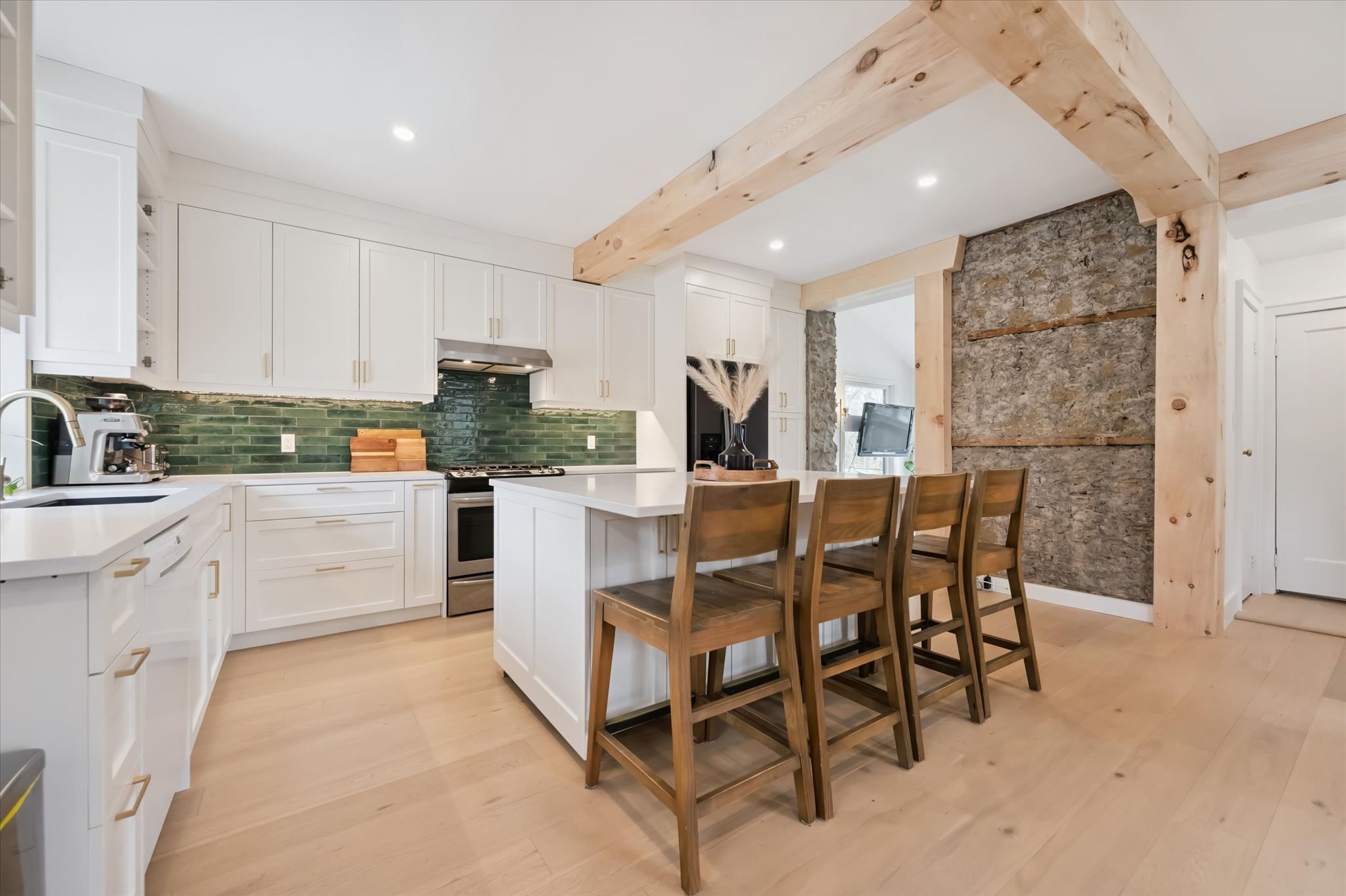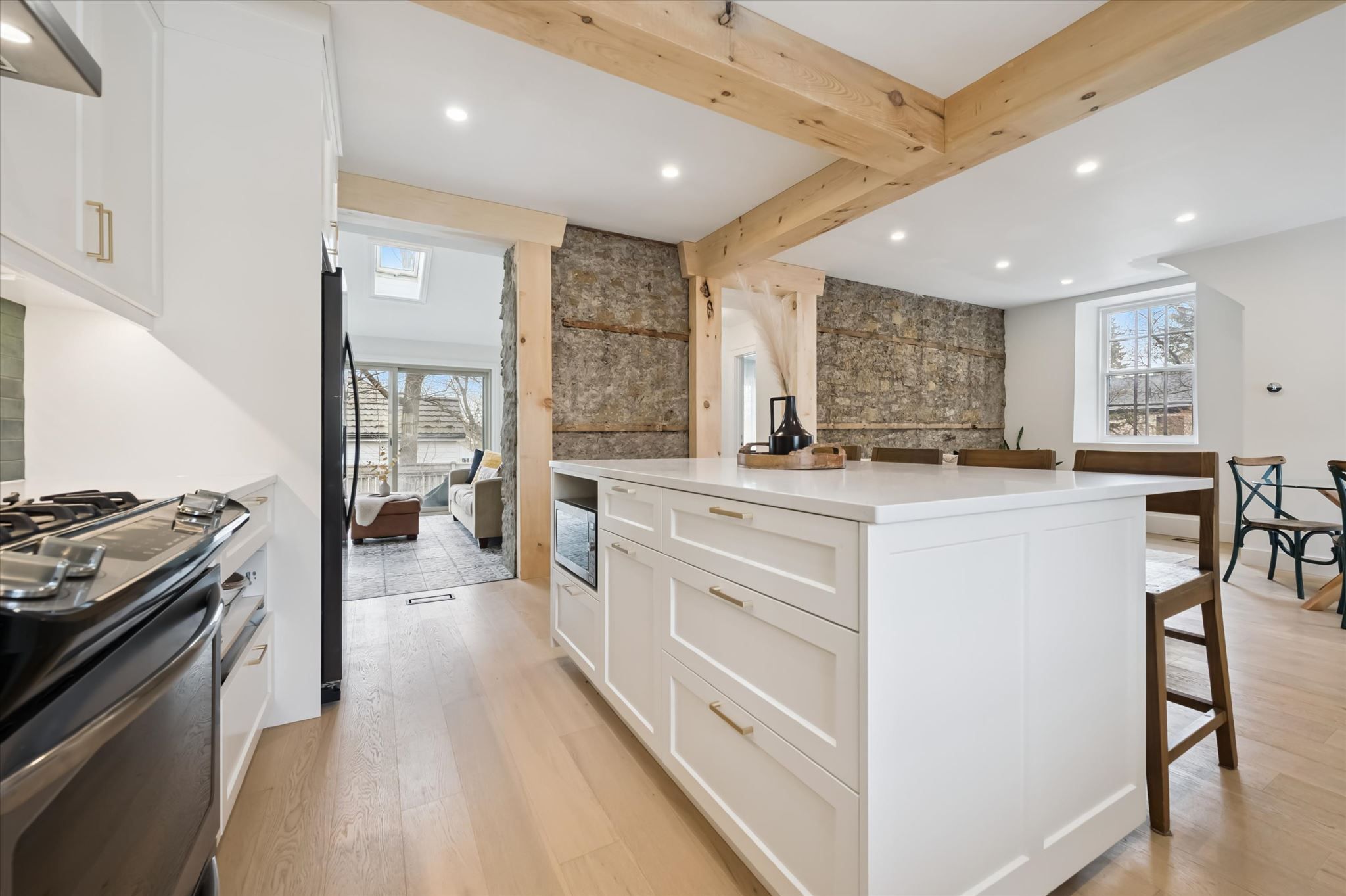 Stunning stone 4 bedroom home with character and charm. This charming 4 bedroom home has been lovingly renovated with a massive, open concept main floor living space. Beamed ceilings, exposed stone walls, new bright white chef's kitchen with quartz countertops and massive island. From the moment you step inside you'll recognize the attention to detail and the love that went into this home. Gleaming neutral hardwood, gorgeous gem toned backsplash, stainless appliances, and so much space! The high ceilings and large windows make this floor inviting and airy. The den, with abundant windows sits just off the kitchen, and a convenient main floor bedroom and newly renovated 3 piece bath with tiled shower and heated floors round out this level. Each end of the home has its own staircase, one to the oversized primary bedroom (with walk in closet) and one to the children's wing. One bedroom upstairs is connected to the primary, perfect for a nursery or office. The second floor bathroom features a clawfoot tub. The backyard is an oasis, with perennial gardens, newer deck and is fully fenced with mature trees, and a private pond. Along the side of the home a concrete pad was poured to double as extra parking and a mini basketball court. The single car garage has been insulated and drywalled and is connected to the home by an interior door. This home is truly the perfect blend of historic elegance with warmth and character, and modern conveniences.