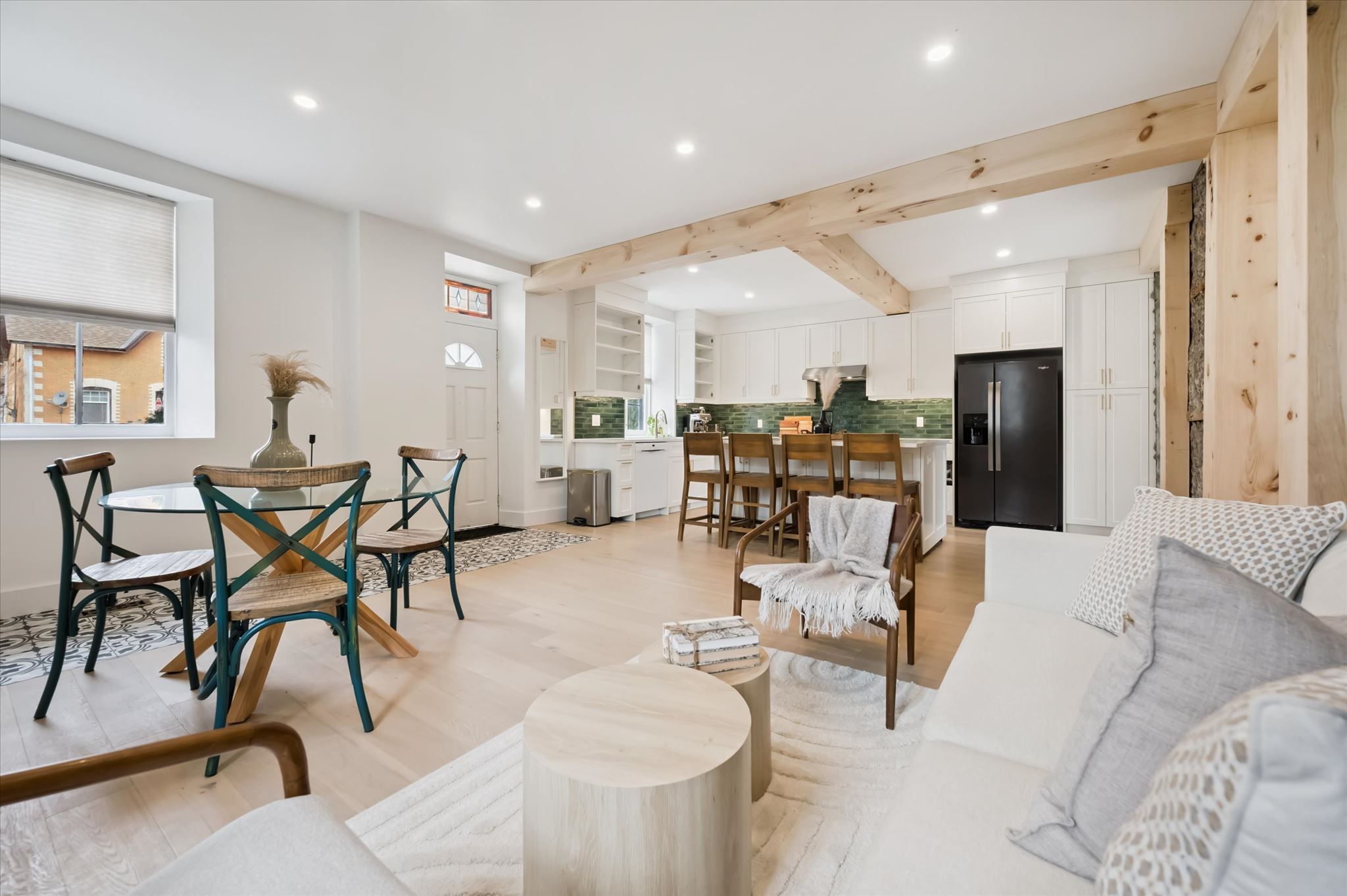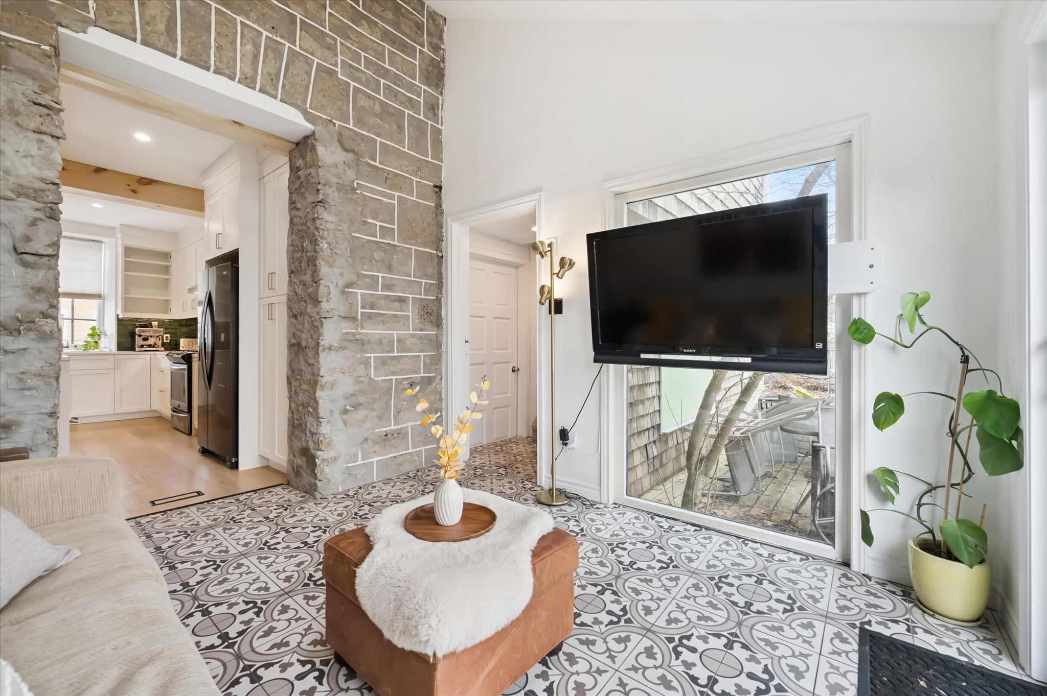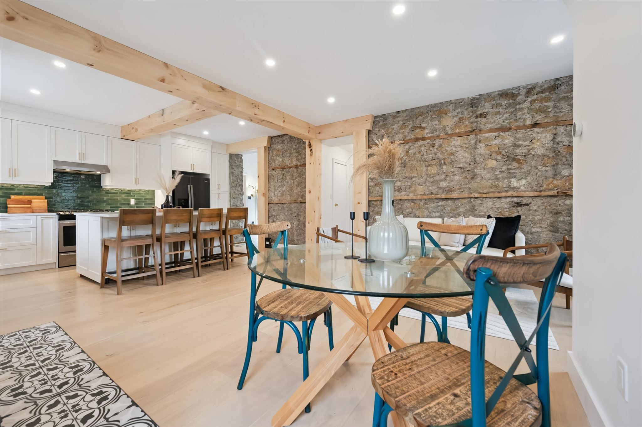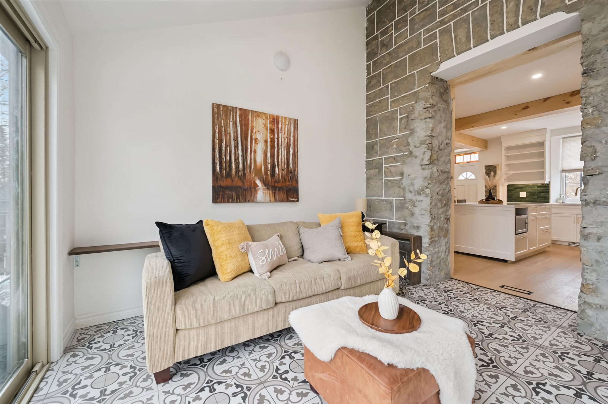 Stunning stone 4 bedroom home with character and charm. This charming 4 bedroom home has been lovingly renovated with a massive, open concept main floor living space. Beamed ceilings, exposed stone walls, new bright white chef's kitchen with quartz countertops and massive island. From the moment you step inside you'll recognize the attention to detail and the love that went into this home. Gleaming neutral hardwood, gorgeous gem toned backsplash, stainless appliances, and so much space! The high ceilings and large windows make this floor inviting and airy. The den, with abundant windows sits just off the kitchen, and a convenient main floor bedroom and newly renovated 3 piece bath with tiled shower and heated floors round out this level. Each end of the home has its own staircase, one to the oversized primary bedroom (with walk in closet) and one to the children's wing. One bedroom upstairs is connected to the primary, perfect for a nursery or office. The second floor bathroom features a clawfoot tub. The backyard is an oasis, with perennial gardens, newer deck and is fully fenced with mature trees, and a private pond. Along the side of the home a concrete pad was poured to double as extra parking and a mini basketball court. The single car garage has been insulated and drywalled and is connected to the home by an interior door. This home is truly the perfect blend of historic elegance with warmth and character, and modern conveniences.