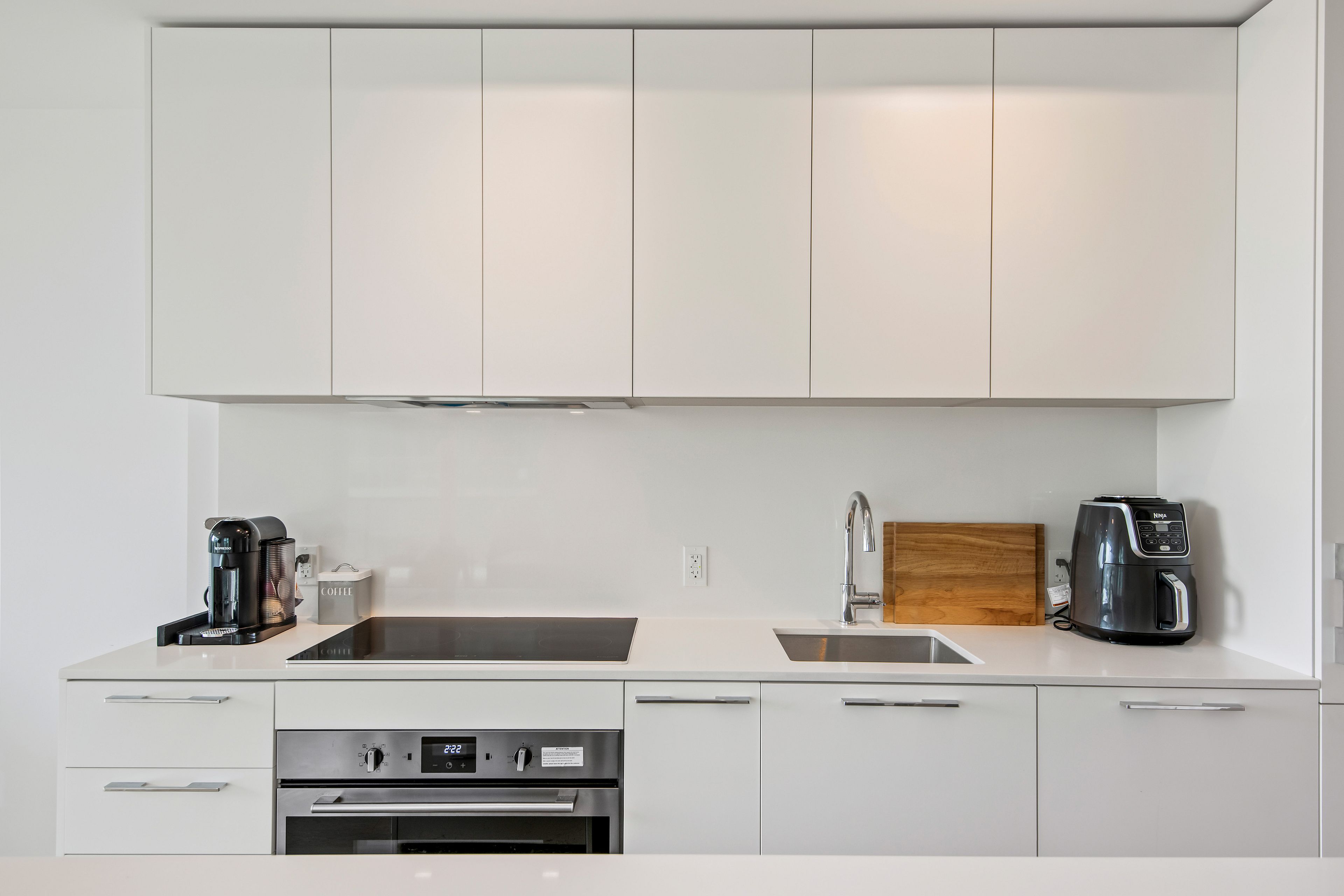 • Modern kitchen with full-sized appliances and an oversized island for hosting.