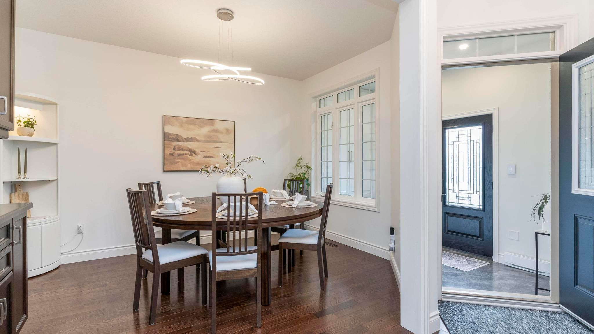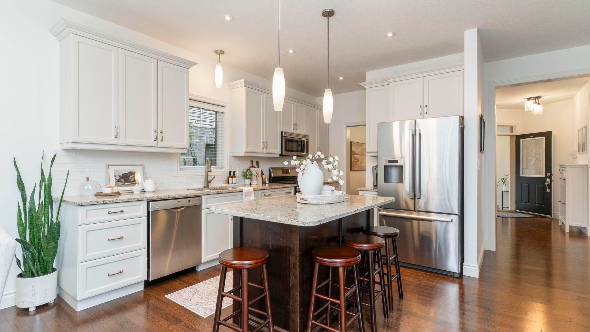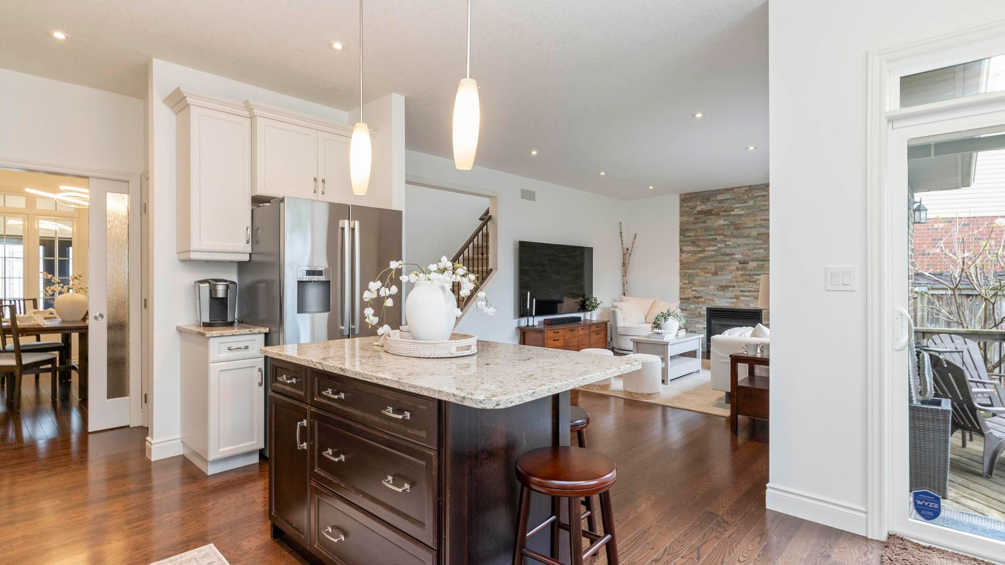 • Bright main floor with a renovated entry, open kitchen, and family room.
