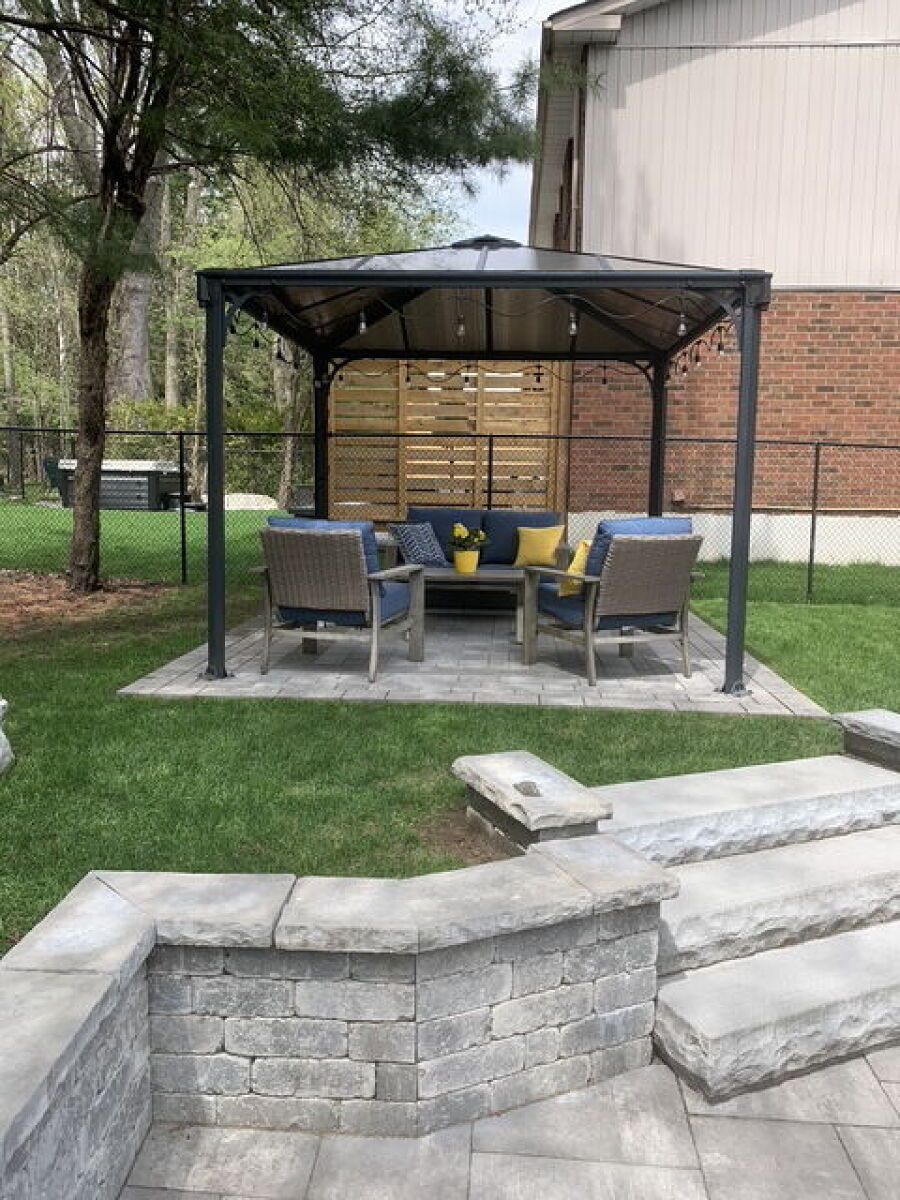 • Tranquil backyard featuring a large gazebo and mature trees.