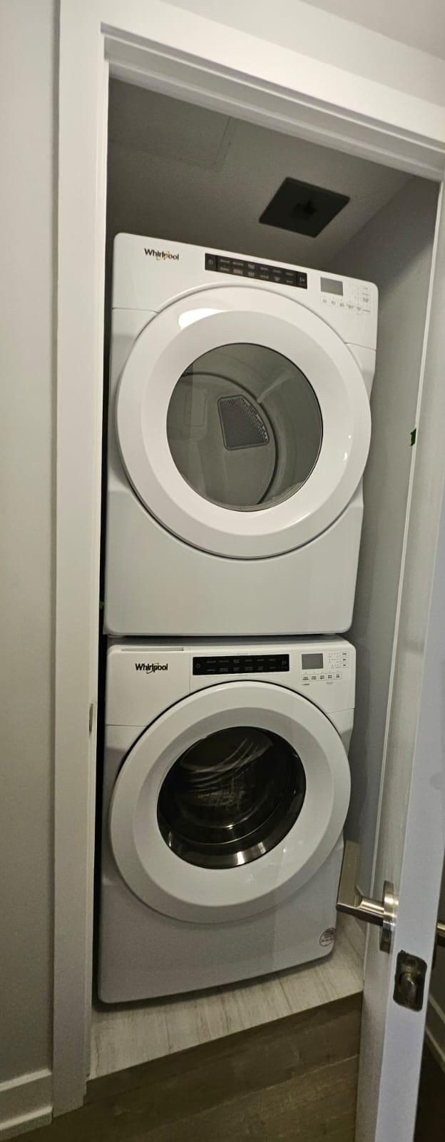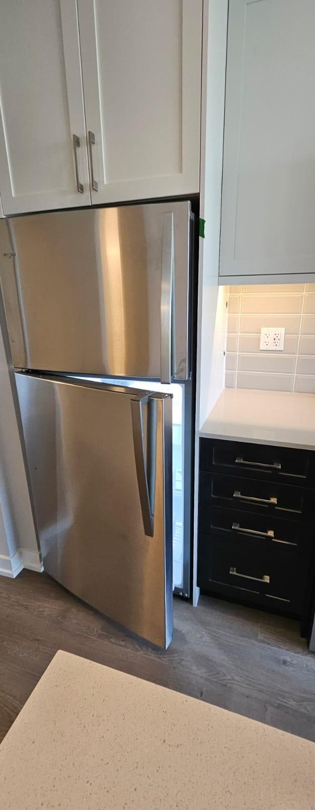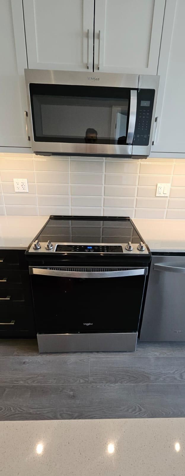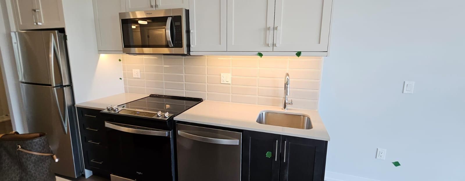 • Modern kitchen features stainless steel appliances and quartz countertops.