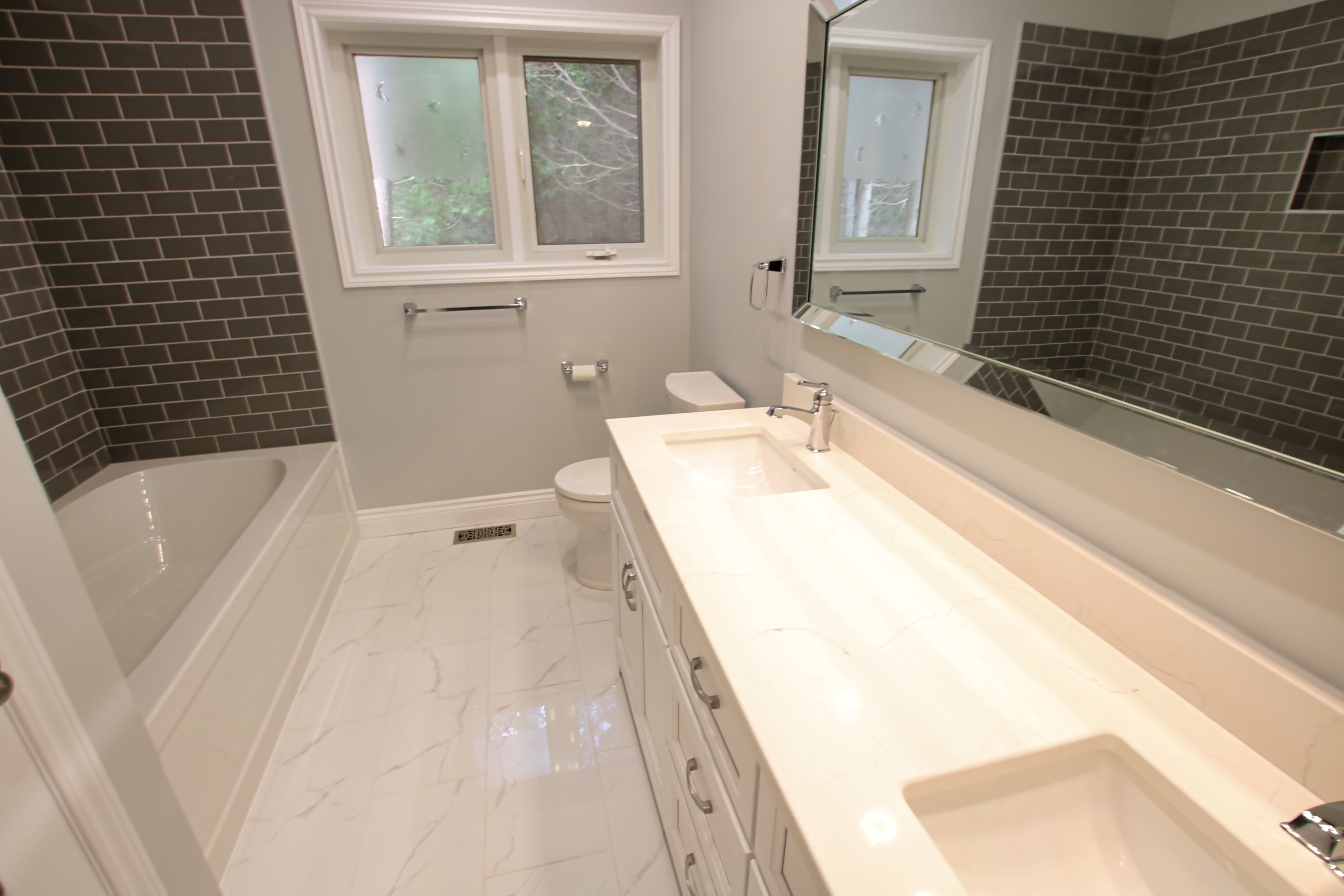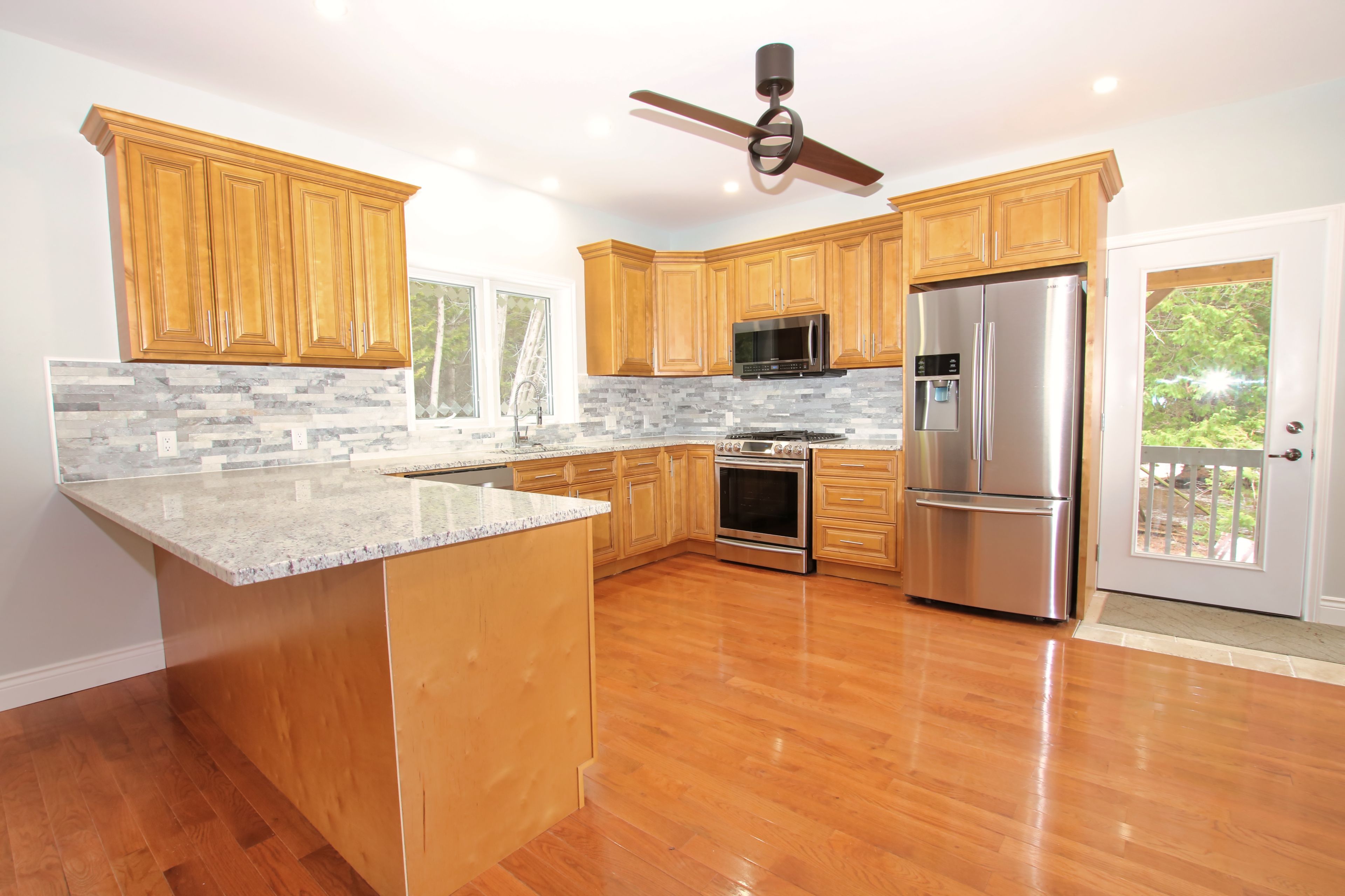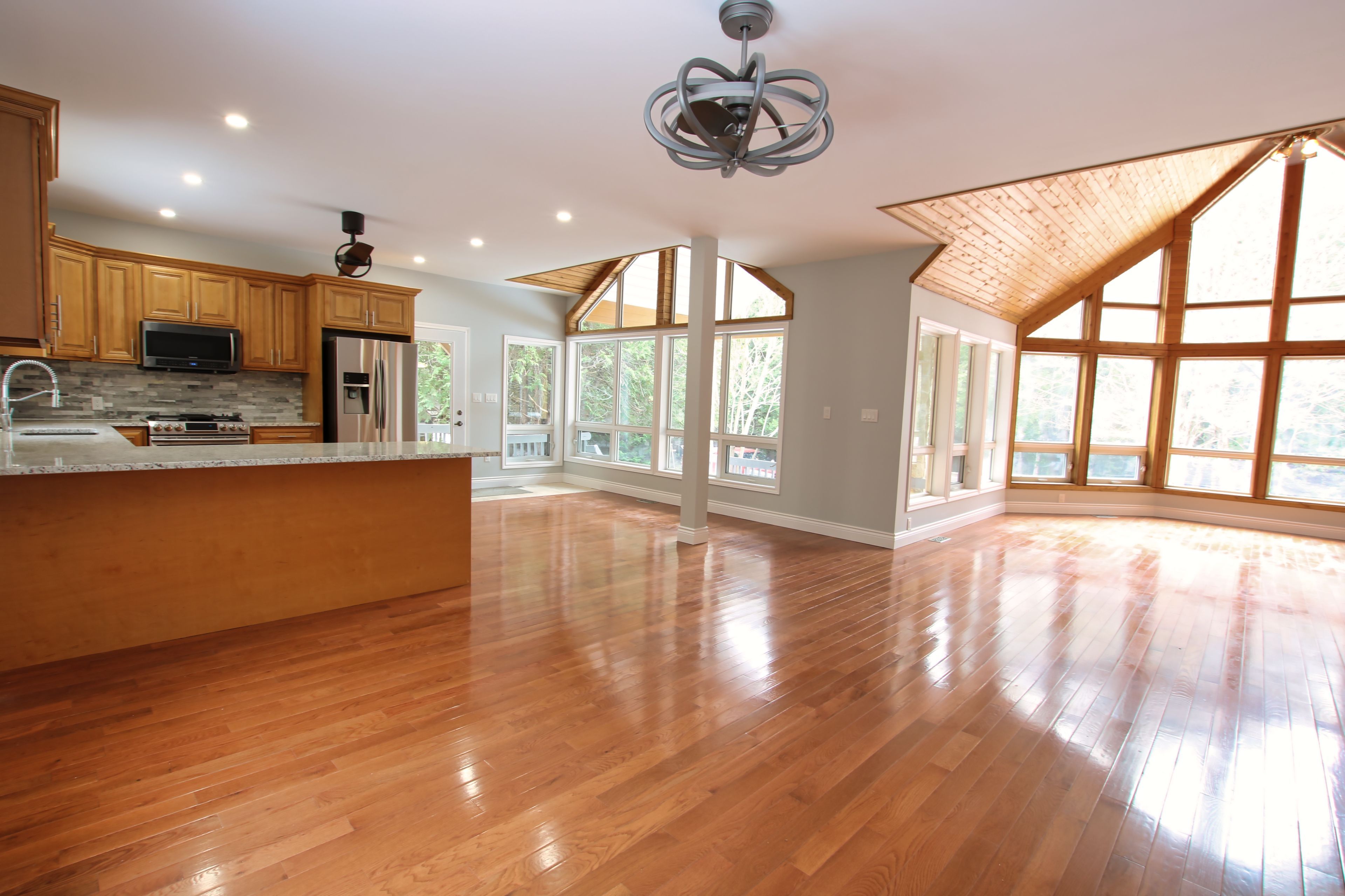 • Large open-concept kitchen with elegant quartz countertops.