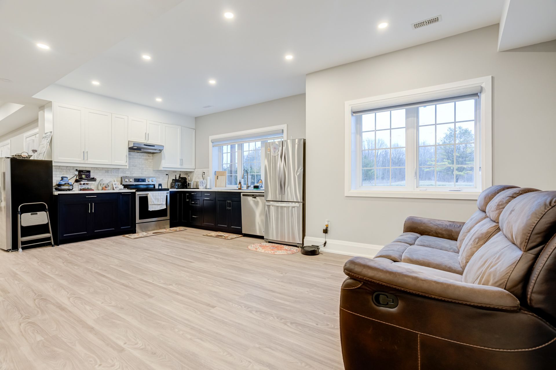 • Bright open-concept layout with large windows and high ceilings throughout.