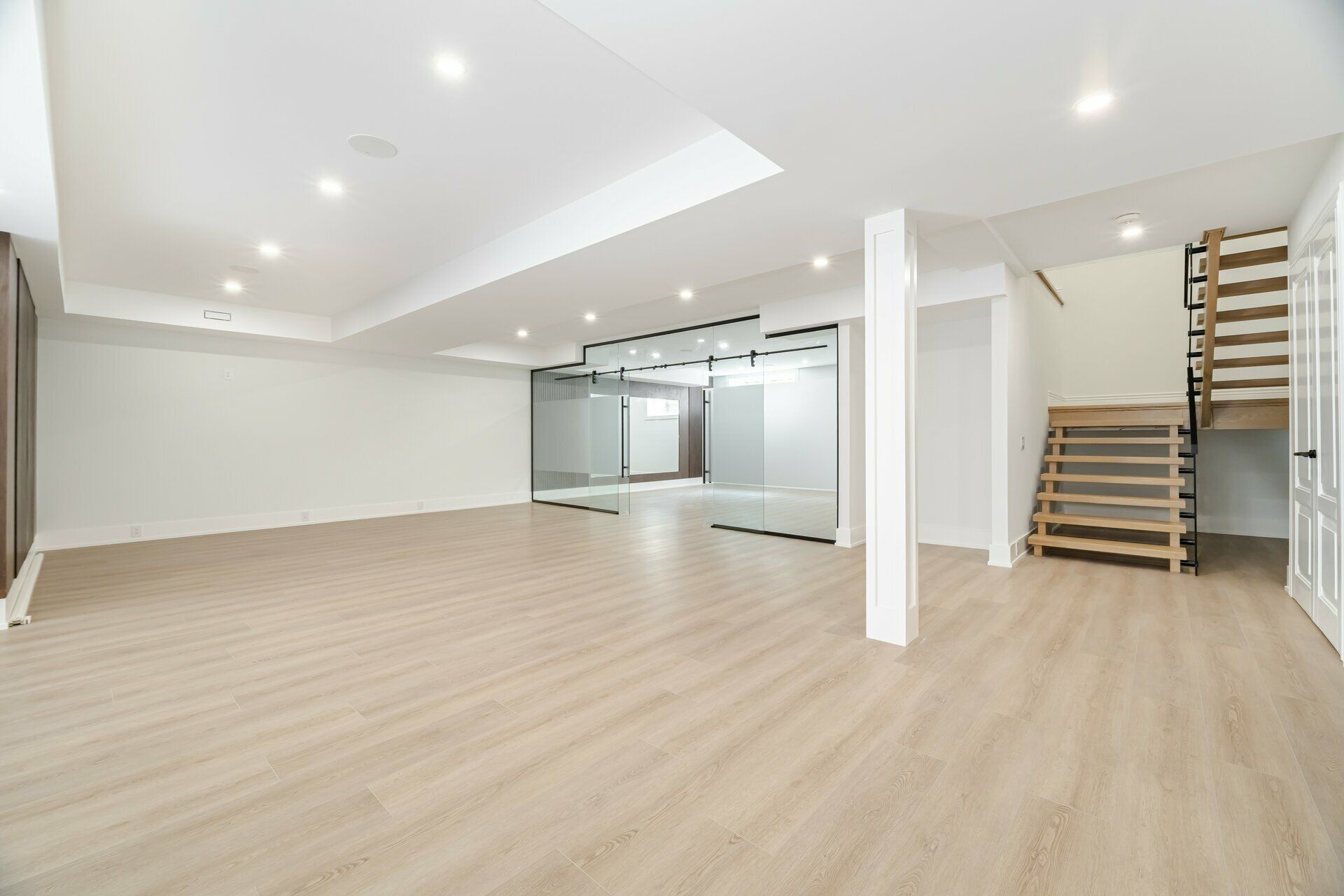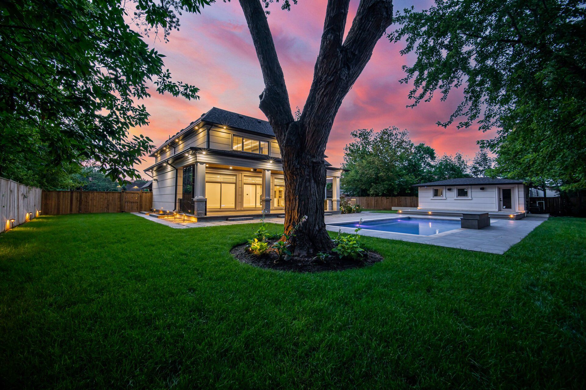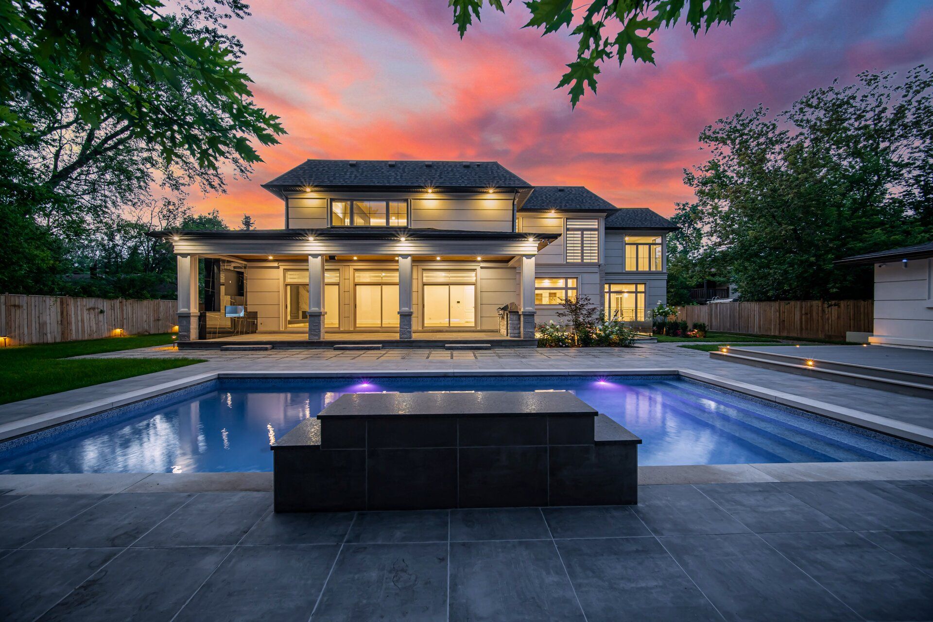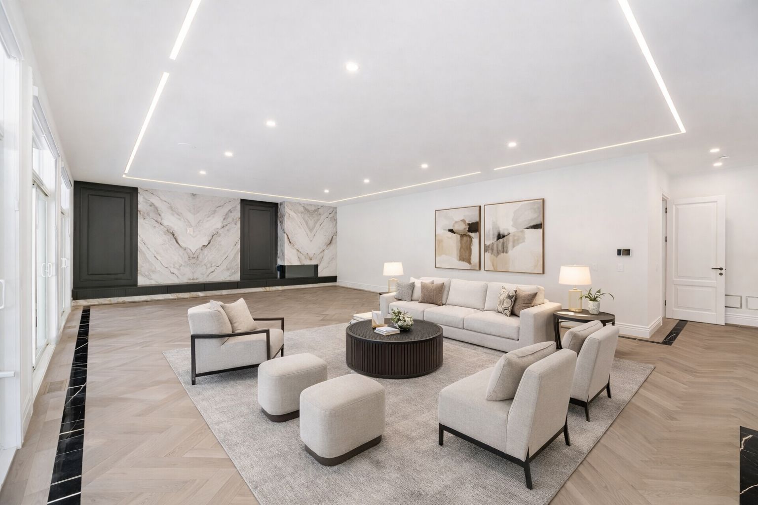 Set on a commanding 112. 5'x199. 5' lot just steps from the lake, this custom modern-traditional estate offers nearly 11,000sf of finished living space across three levels. A long private drive with parking for up to 12 cars and oversized 3-car garage create a striking arrival, complemented by stone and stucco architecture, soffit lighting, and professionally landscaped grounds. A dramatic double-height foyer introduces the home's scale, anchored by an open-riser staircase with smoked glass panels and integrated lighting. Principal rooms feature tile inlaid borders, herringbone engineered hardwood flooring, oversized windows, and sleek architectural lighting. The chef's kitchen is centred around a 10' quartz island with premium thermador appliances, bespoke cabinetry, and a dedicated coffee station, flowing seamlessly into the family room with a modern fireplace feature wall, built-in media cabinetry, and multiple walkouts to a covered portico designed for four-season entertaining. A private main-floor office with double french doors and its own exterior entry offers exceptional work-from-home flexibility. Upstairs, four bedroom suites include a luxurious primary retreat with dual walk-in closets and a spa-inspired ensuite featuring a steam shower, freestanding tub, wall-mounted fixtures, and heated floor. The walk-up lower level is designed for lifestyle living with radiant in-floor heating, theatre room, wet bar, glass-enclosed gym, guest suite, pet spa, and extensive storage. Outdoor living is elevated with a rectangular pool and water feature, large-format stone terraces, composite sun deck, covered outdoor fireplace wall with tv rough-in, built-in bbq station, and pool-house. Smart home technology, multi-zone audio, dual hvac systems, and security surveillance complete this exceptional lakeshore road offering near parks, trails, and bronte amenities. An outstanding blend of architectural presence, scale, and resort-style living! (some images have virtual staging)