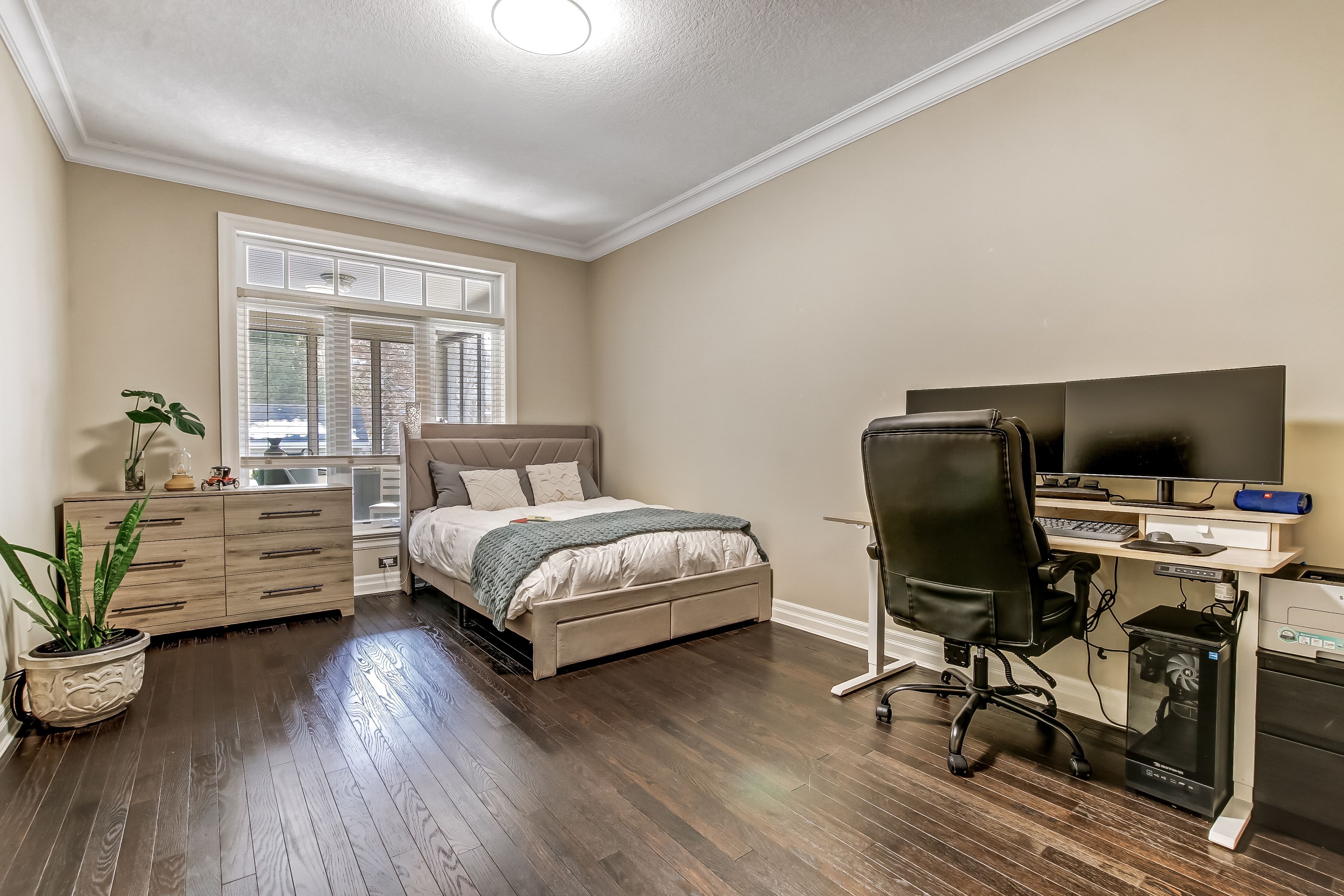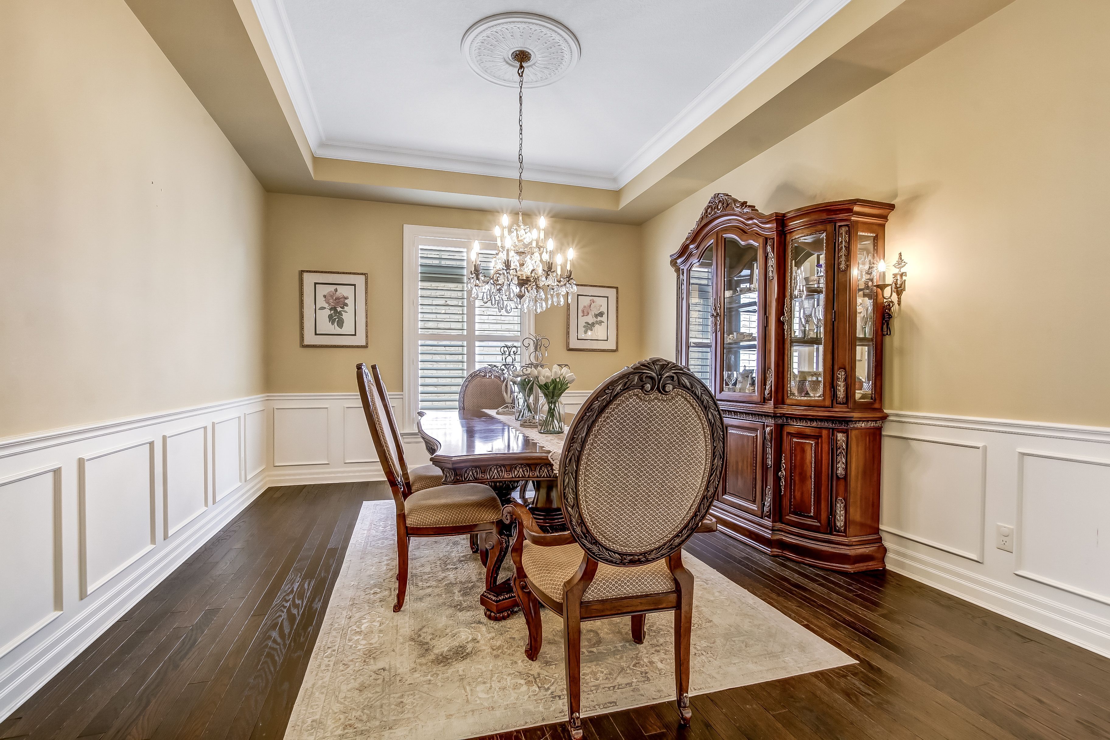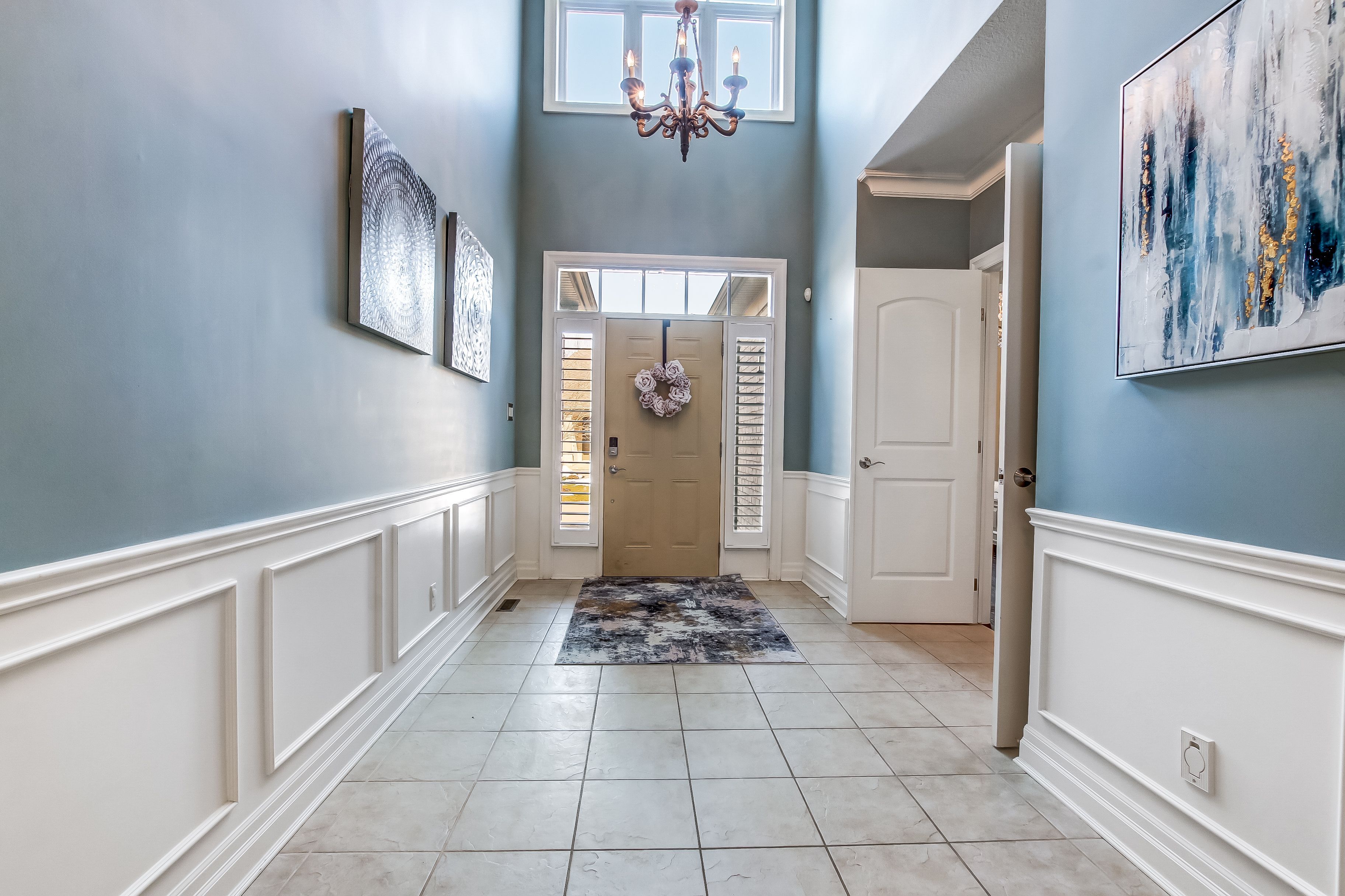 • Elegant design features soaring ceilings, crown moulding, and hardwood flooring.