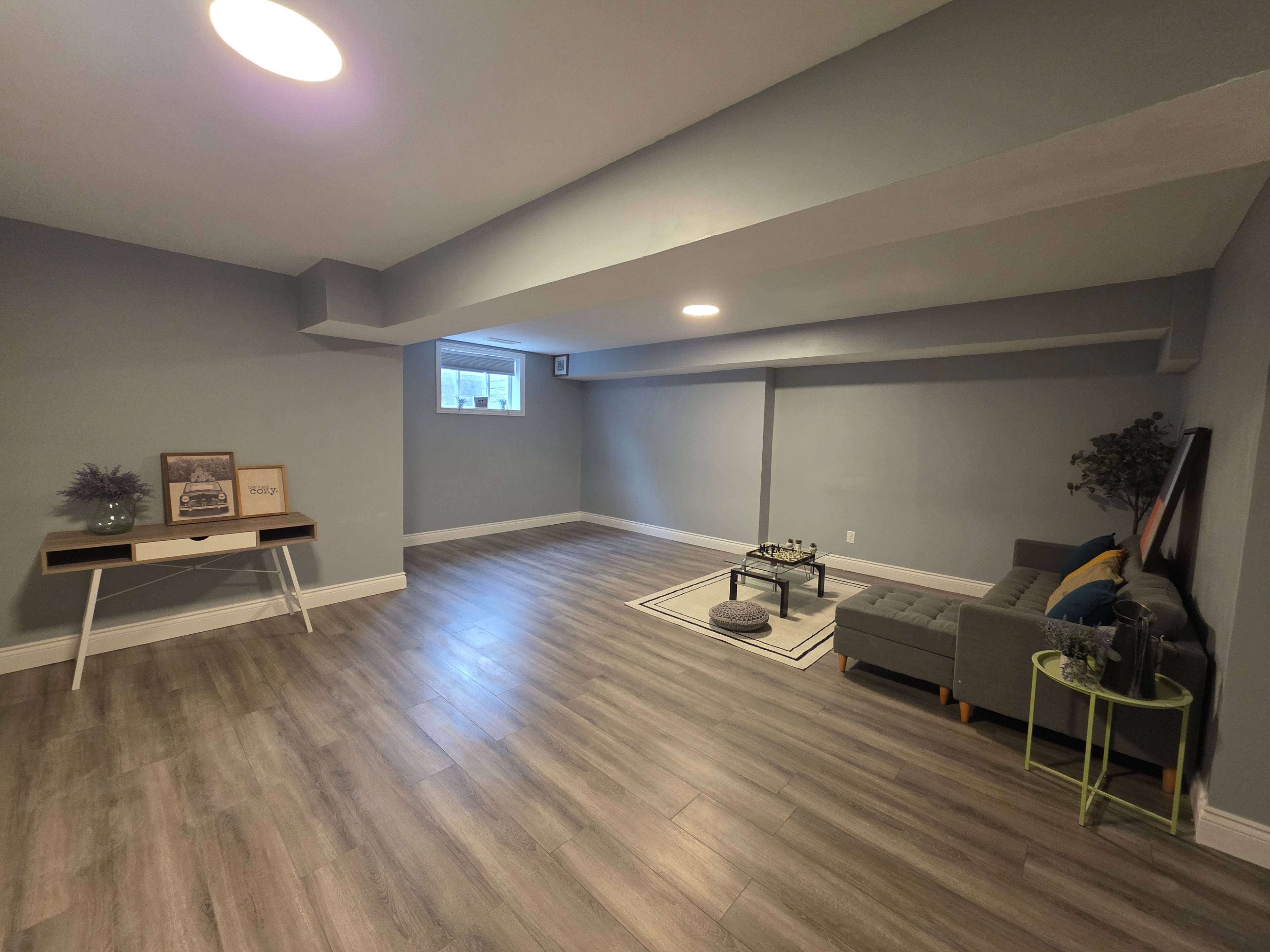 • Bright kitchen with quartz countertops and stainless steel appliances.