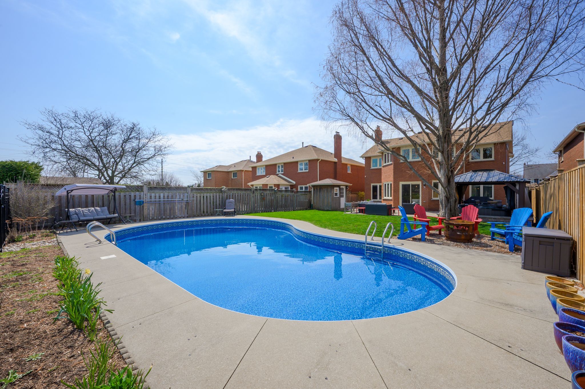 Lot! Layout! Location! Just steps away from the prestigious joshua creek area, this beautifully upgraded 5-bedroom, 4-bathroom home offers approximately 3800 sqft of finished living space, perfect for modern family living. The main level features hardwood and tile flooring, a custom kitchen with quartz countertops and breakfast area, formal living/dining rooms, a cozy gas fireplace in the family room, and main-floor laundry. Upstairs, the primary suite impresses with a den, a spacious 5-piece ensuite , and a walk-in closet, while three additional bedrooms share a stylish 3-piece bath. The fully finished basement includes a rec room, gas fireplace, 5th bedroom, 3-piece bath, workshop, and ample storage. Outdoors, enjoy a private ravine lot oasis with an in-ground solar-heated pool (liner 2021), 8-person jacuzzi under a curtained gazebo, fire pit, mature landscaping, and multiple patterned concrete patios. Highlights include an insulated garage with premium led lighting, paved driveway, adt security system, and newer windows throughout. Fantastic location steps to the top-rated iroquois ridge high school & iroquois ridge community centre as well as parks, tennis/pickleball courts, and transit. This turnkey home blends comfort, function, and style in one of oakville's most sought-after neighbourhoods.