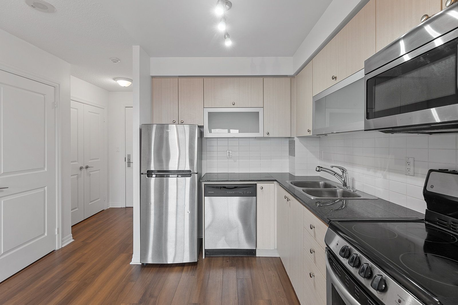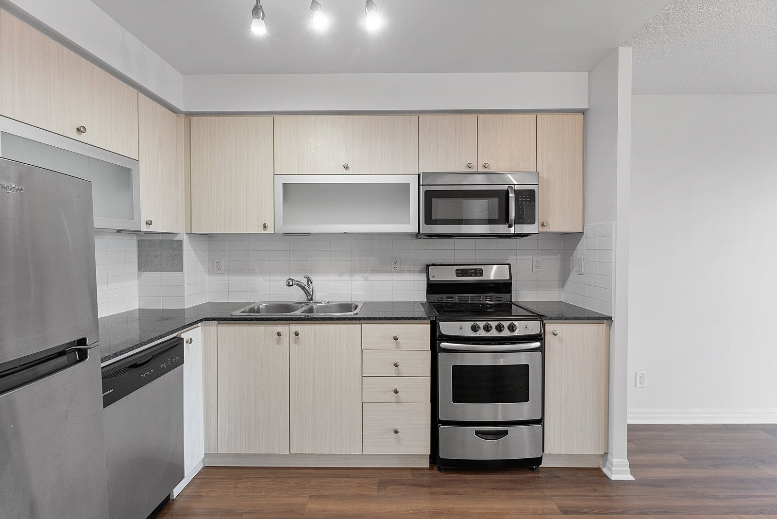 • Modern kitchen features granite countertops and storage for essentials.