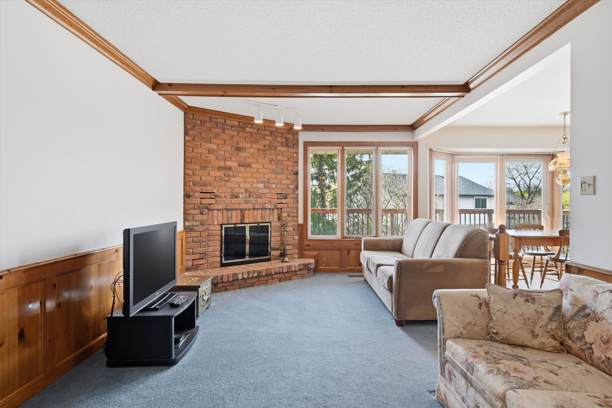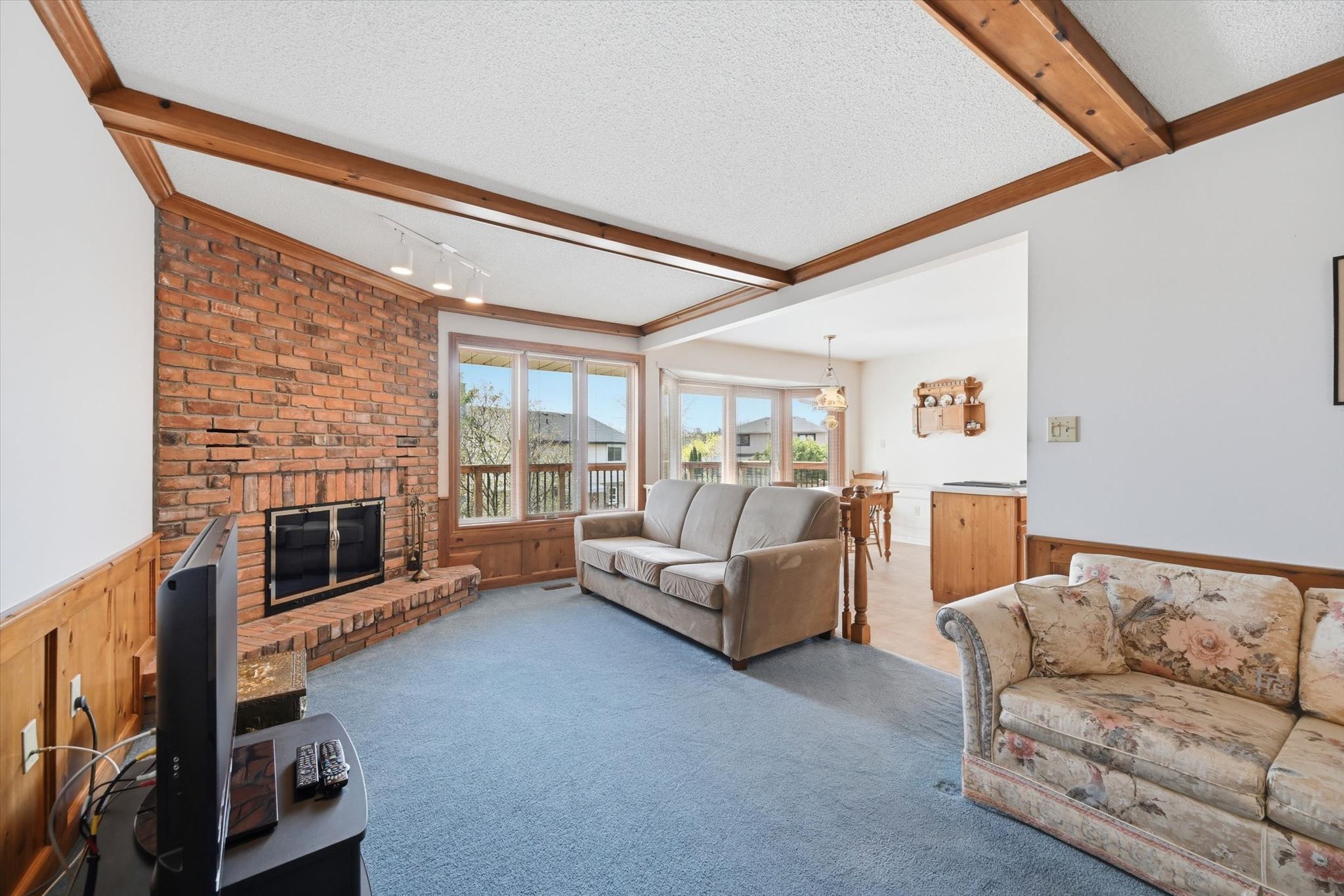 • Cozy family room with a wood-burning fireplace and beamed ceiling.
