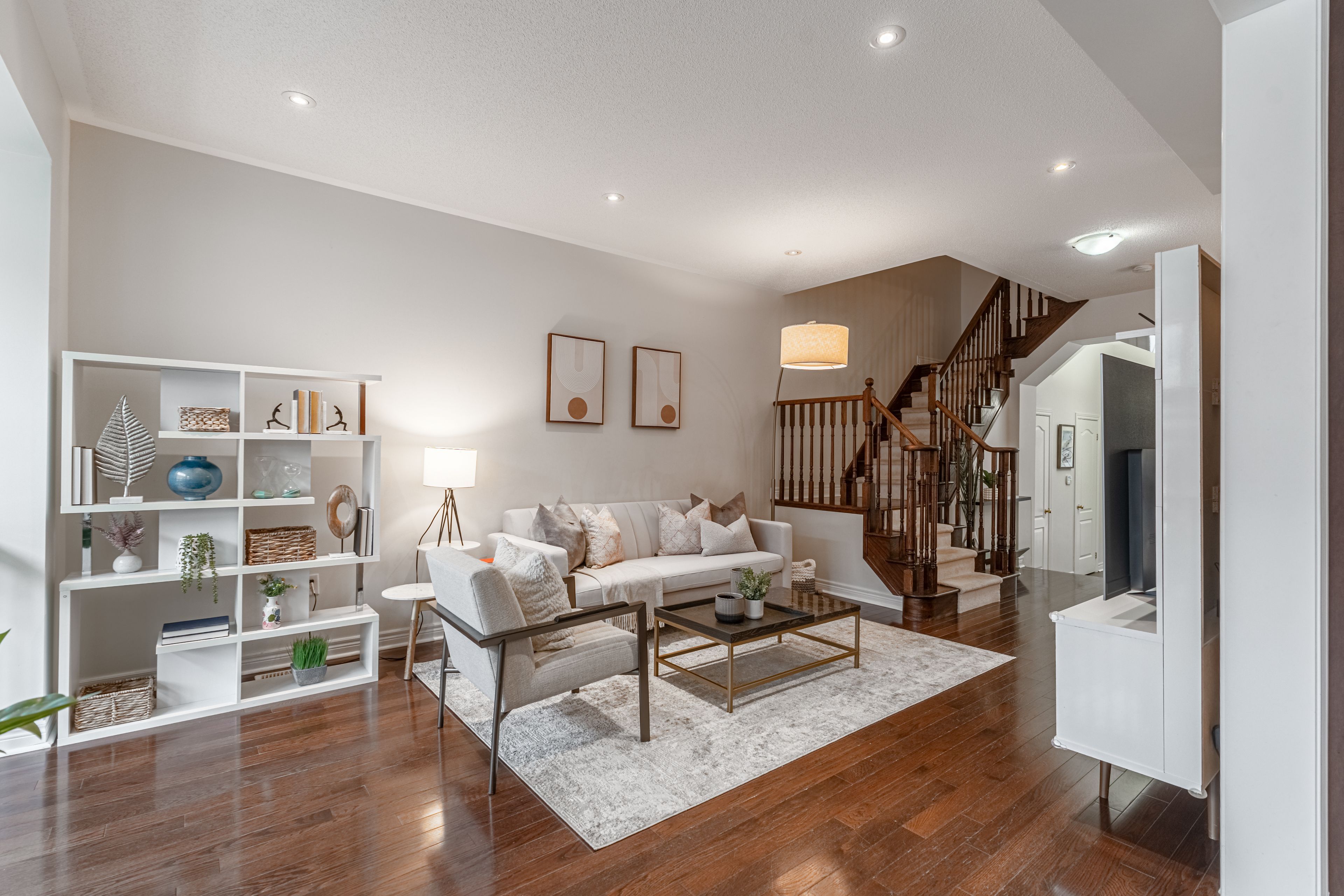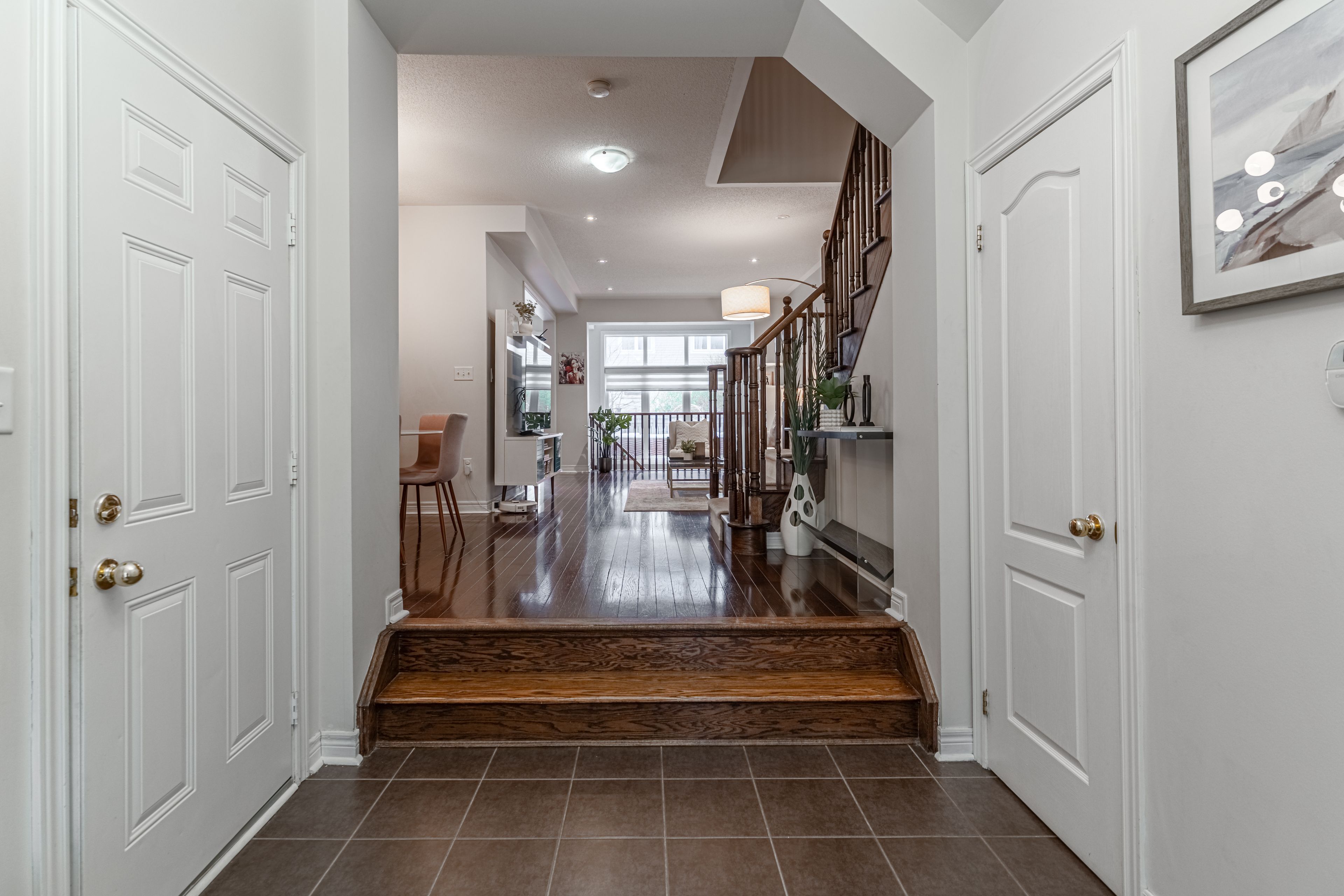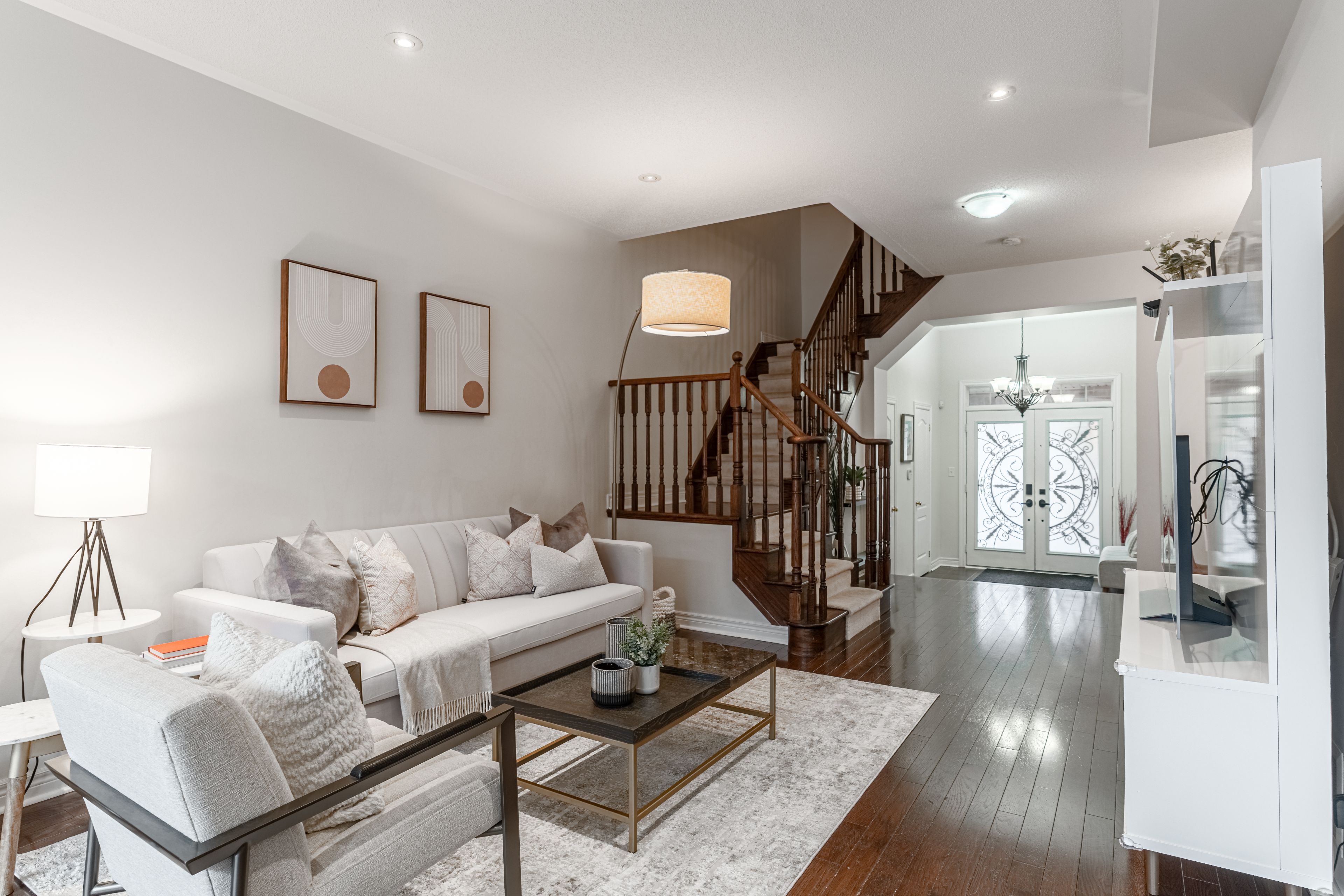 • Bright open concept layout with hardwood flooring and pot lights throughout.
